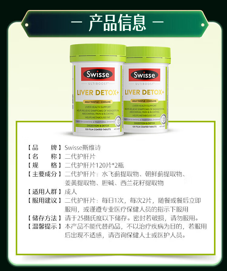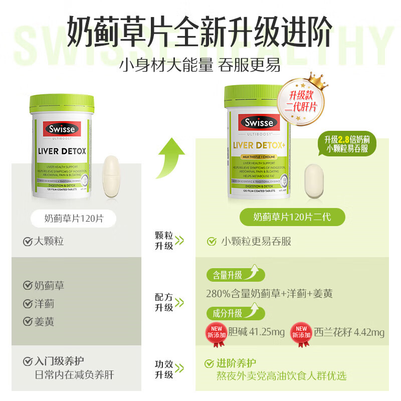 Swisse斯维诗 2代护肝片 2.8倍奶蓟胆碱西蓝花籽护肝去油养胃120片*2瓶