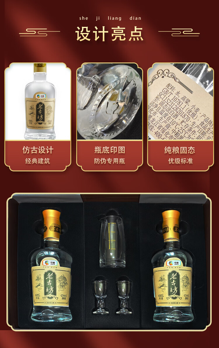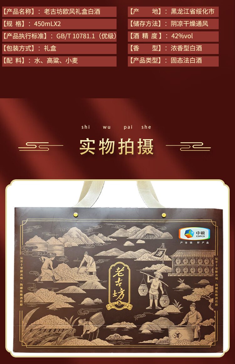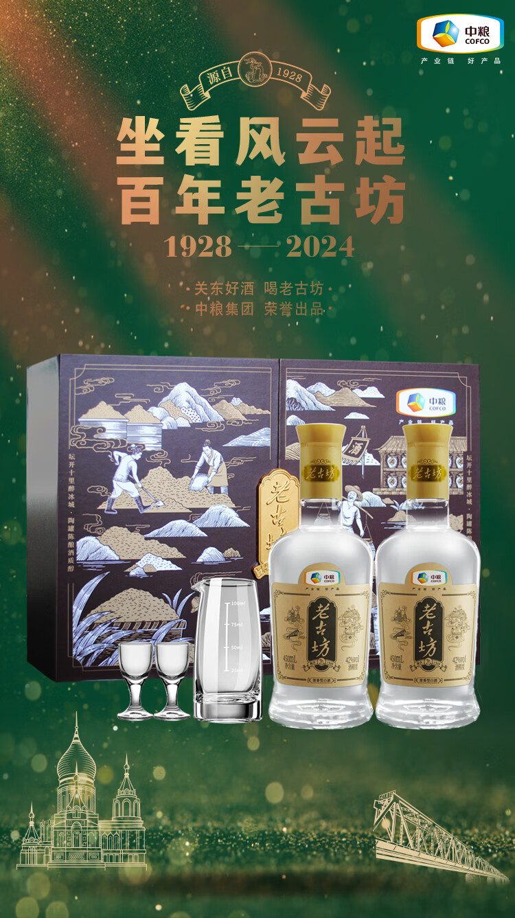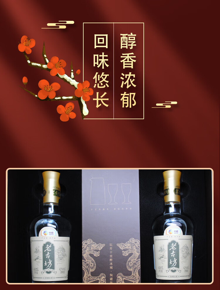 老古白酒礼盒 中粮老古坊白酒礼盒2瓶装纯粮优级浓香型高端礼品 42%vol 450mL 2瓶 【礼盒装】