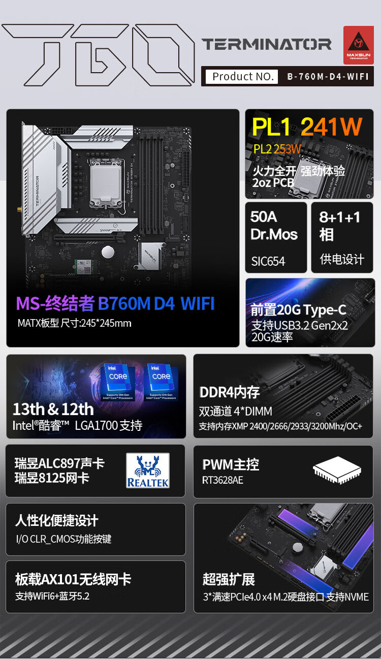 铭瑄(MAXSUN)MS-终结者 B760M D4 WIFI V2 支持DDR4 CPU 12600KF/13490F/14600KF(Intel B760/LGA 1700)