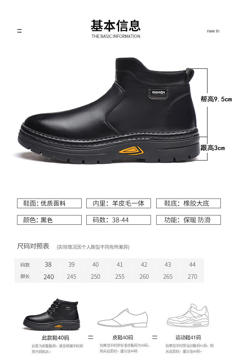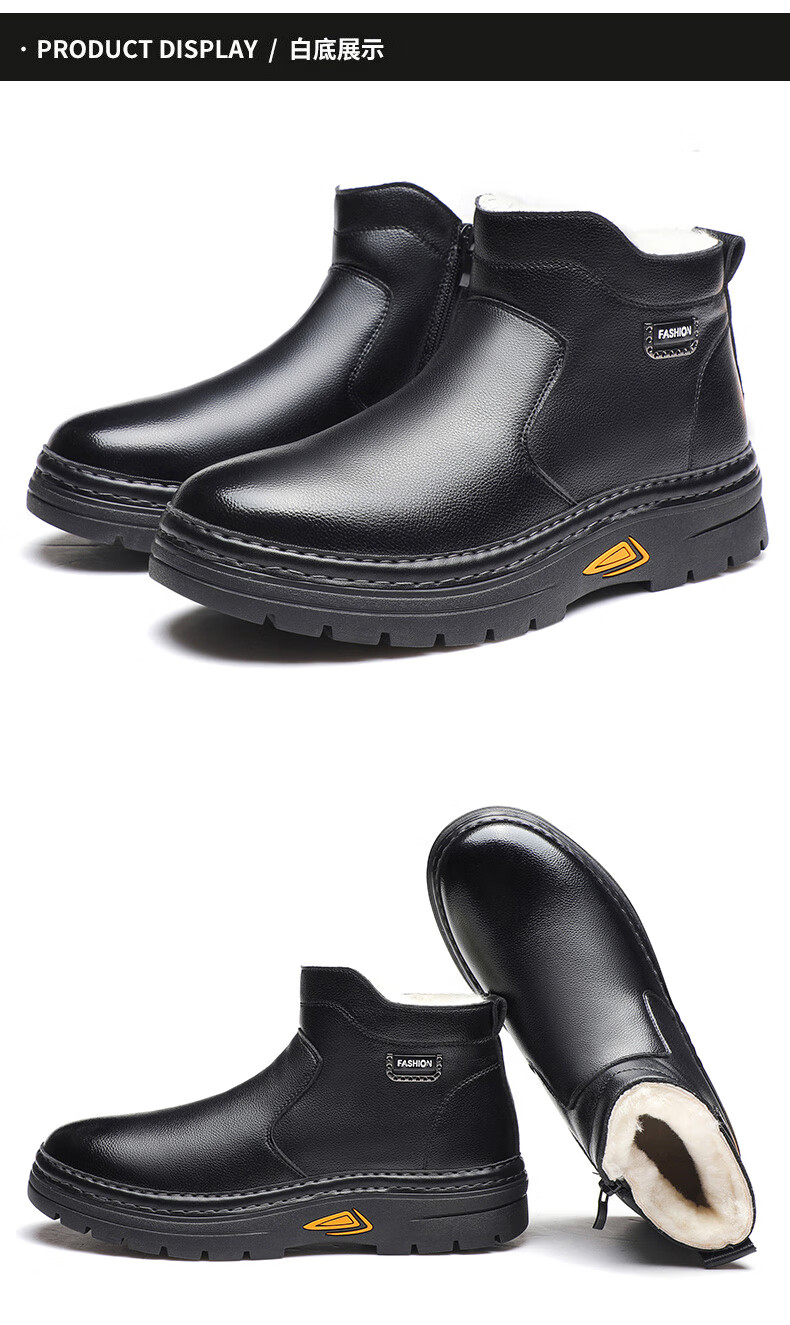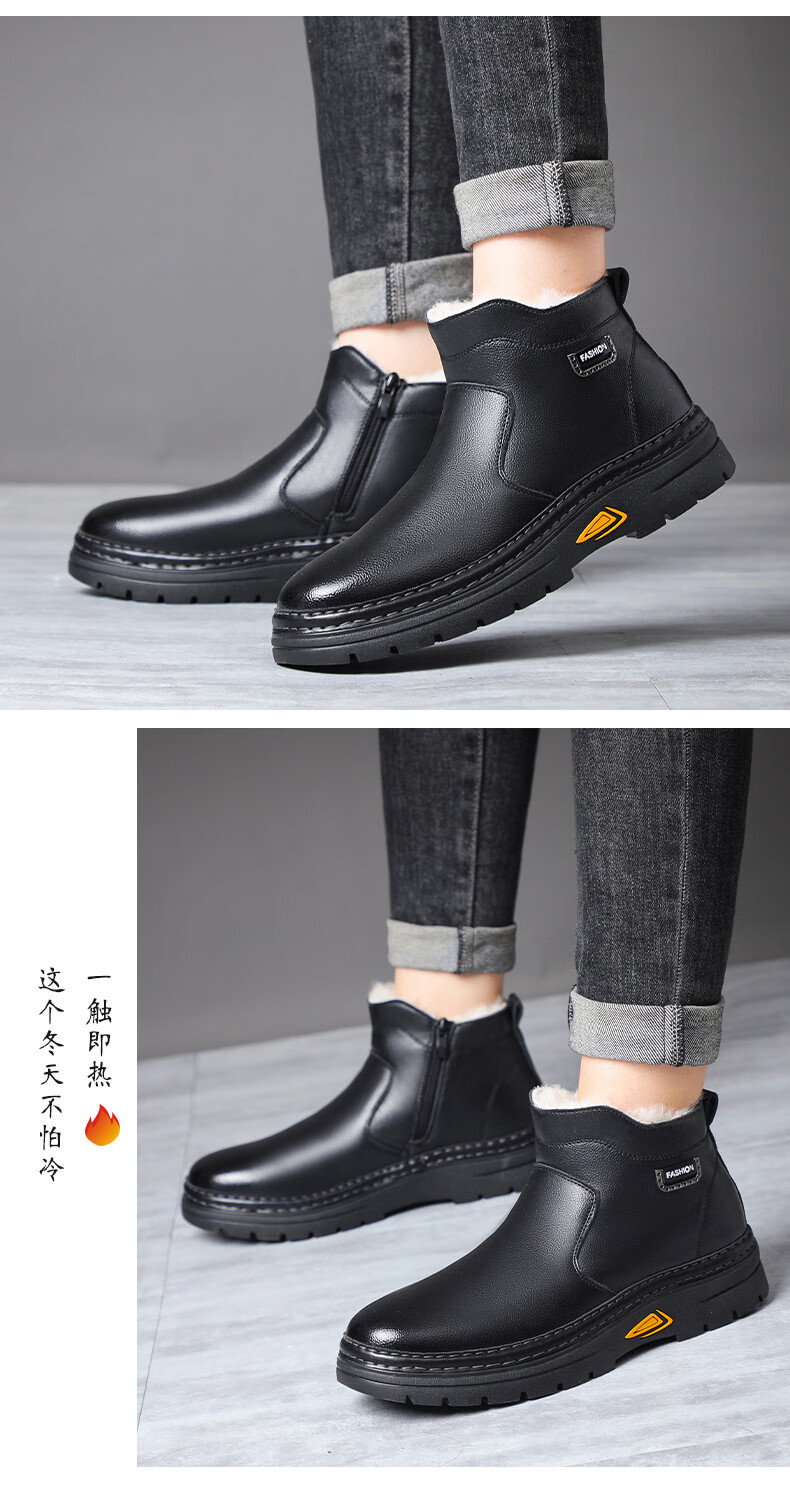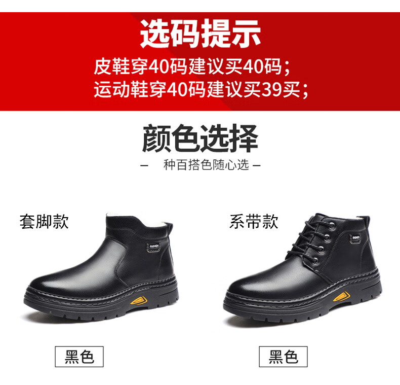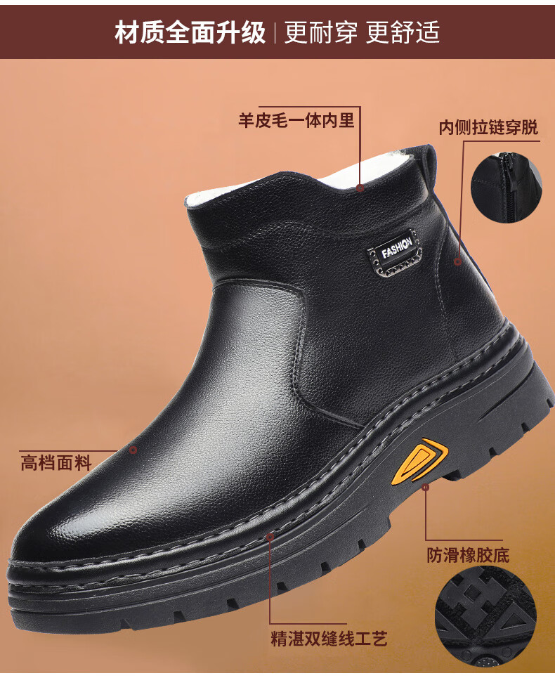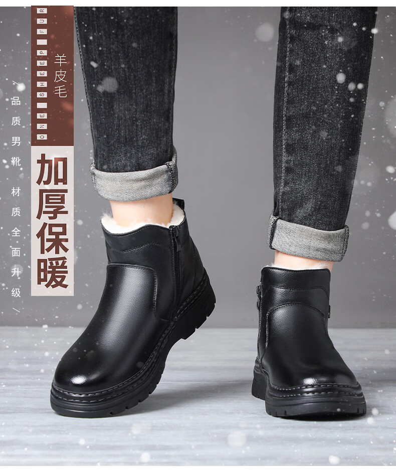 稻草人(MEXICAN)冬季加厚羊毛高帮皮鞋 男棉鞋羊皮毛一体保暖款 防滑防水设计 黑色 【套脚拉链款】 41 【加厚保暖羊毛】