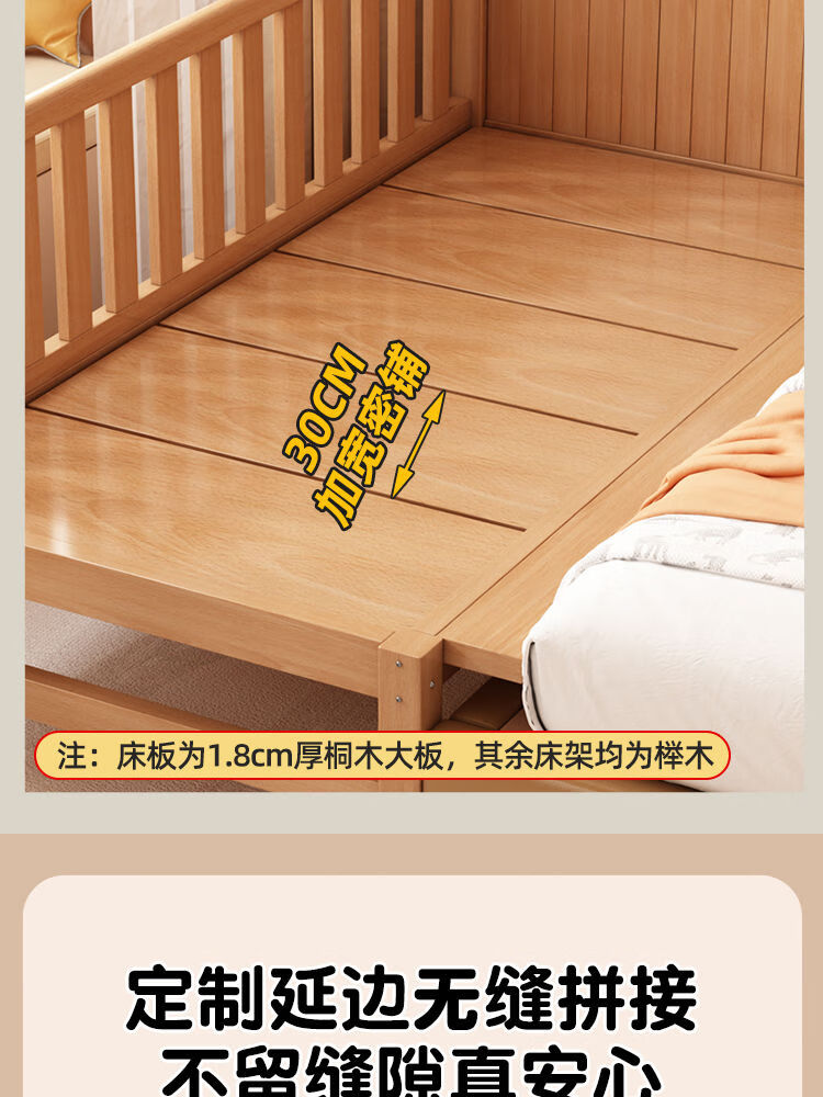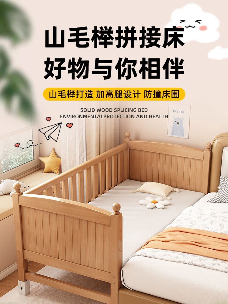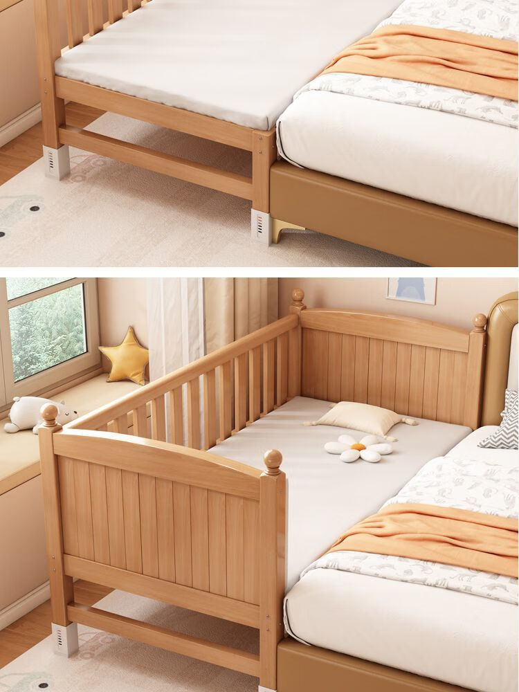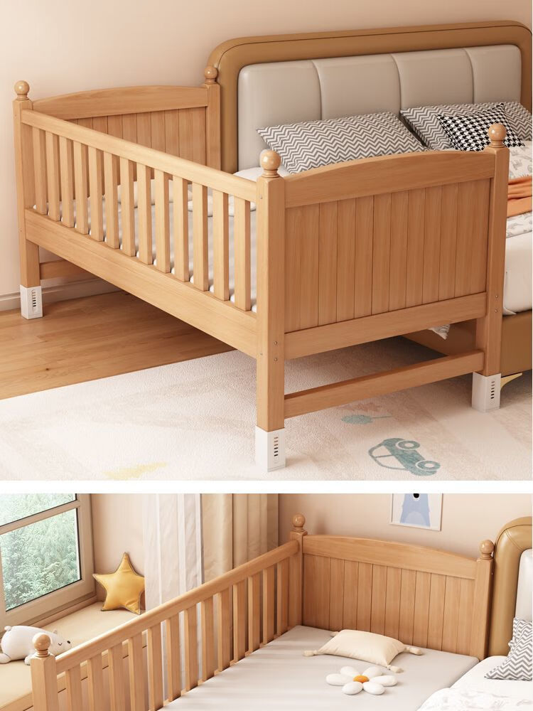 秋莹可升降榉木拼接床实木儿童床婴儿床加宽拼接大床小孩床边床拼接床 三护栏+5cm椰棕床垫(高度可调节) 可升降长200宽60高35【60护栏】