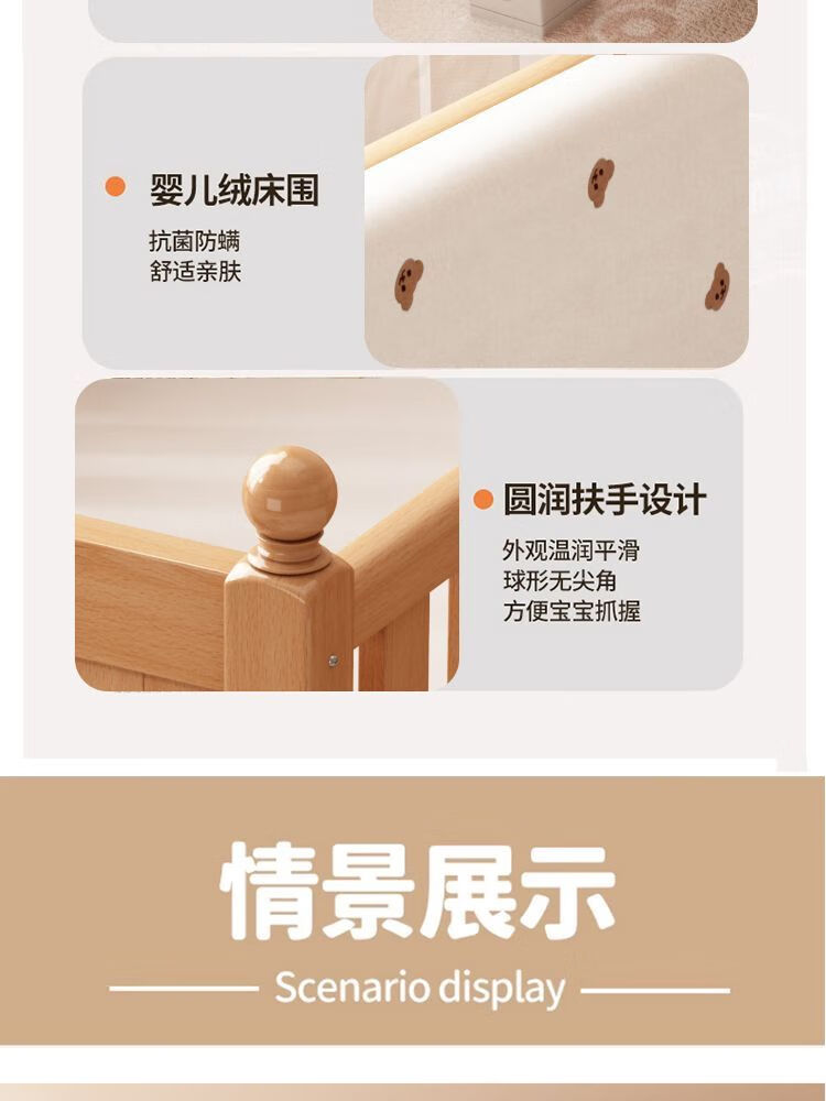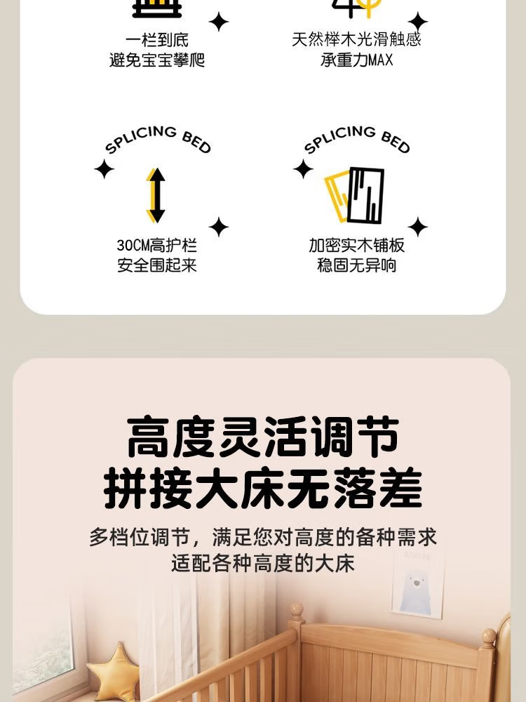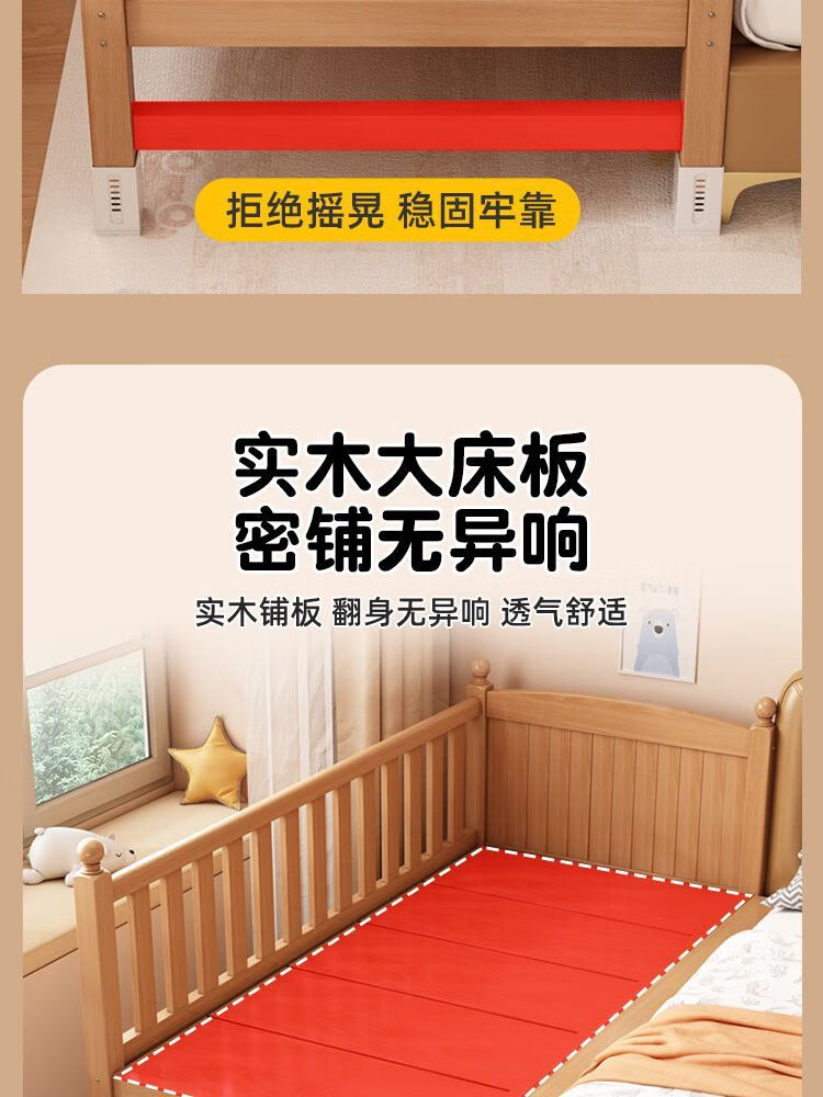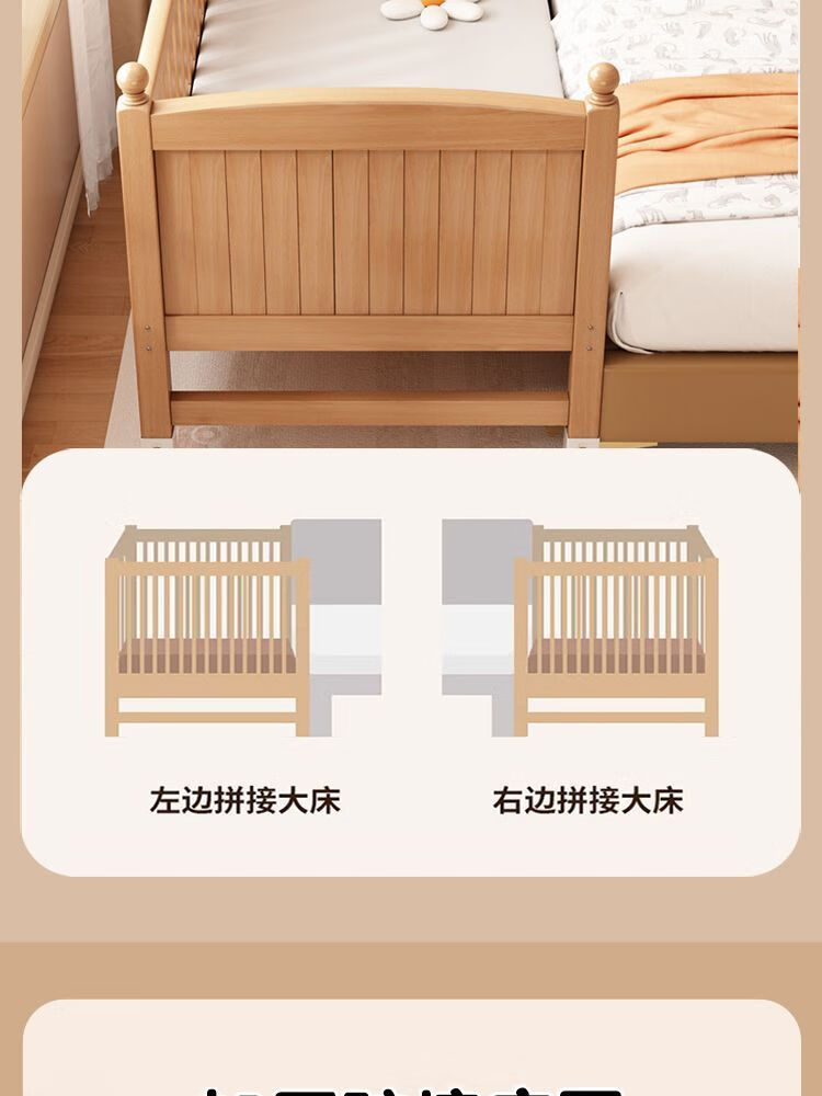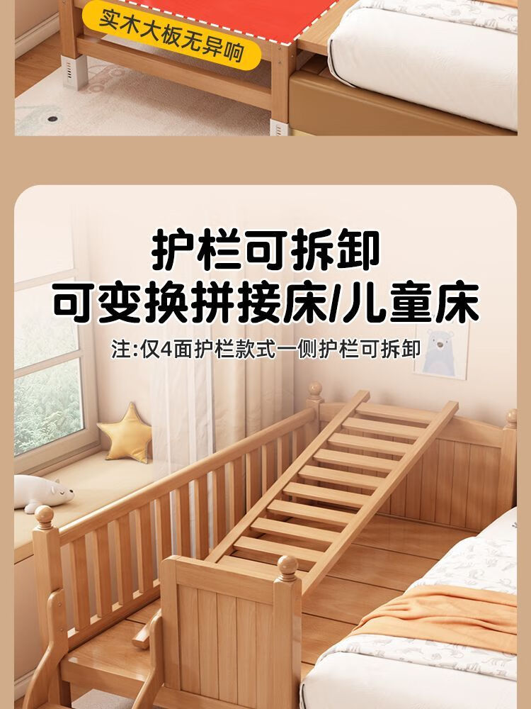 秋莹可升降榉木拼接床实木儿童床婴儿床加宽拼接大床小孩床边床拼接床 三护栏+5cm椰棕床垫(高度可调节) 可升降长200宽60高35【60护栏】