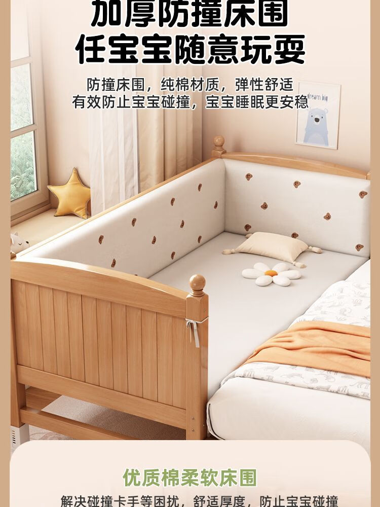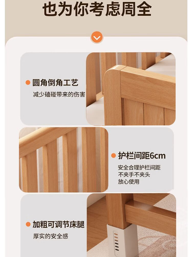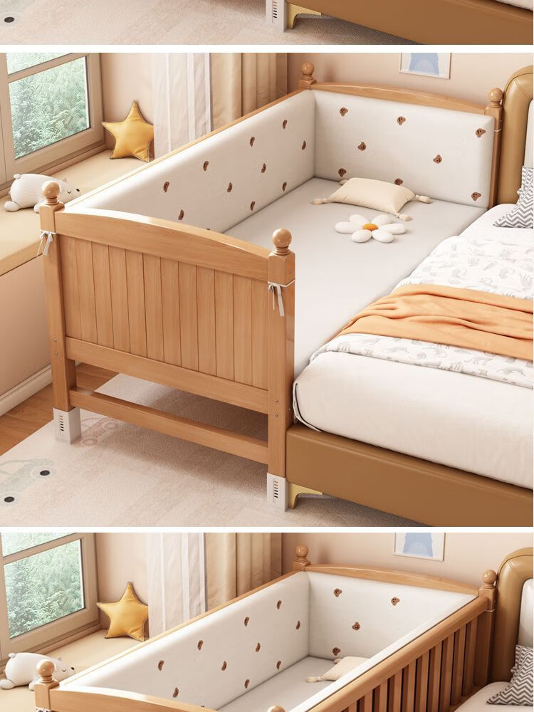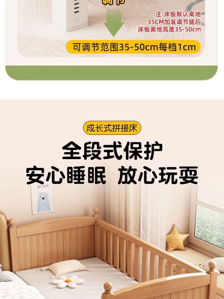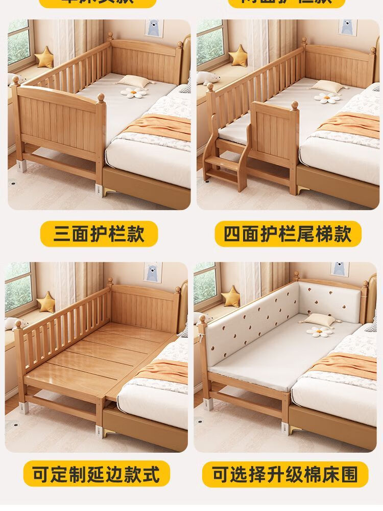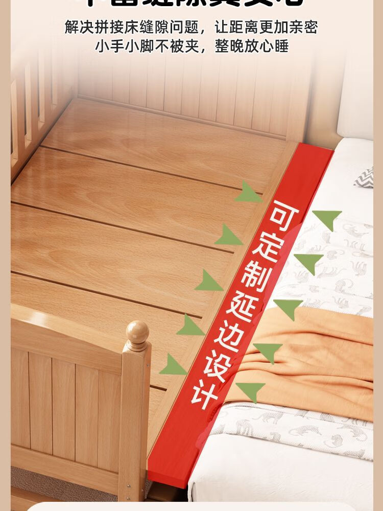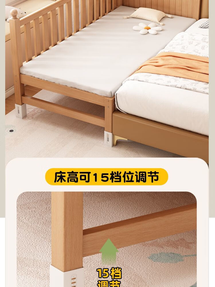秋莹可升降榉木拼接床实木儿童床婴儿床加宽拼接大床小孩床边床拼接床 三护栏+6cm空气纤维床垫 高可调 可升降长180宽100高35【60护栏】