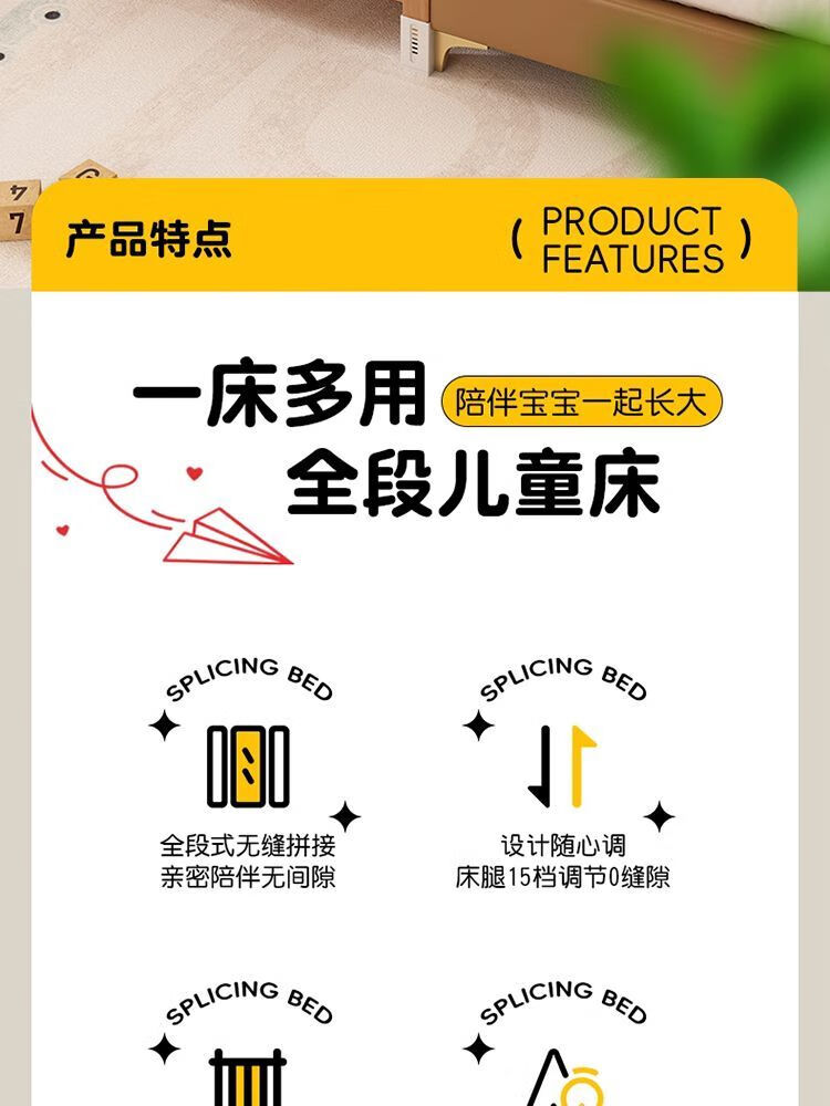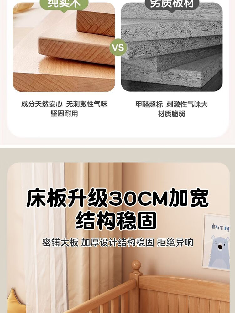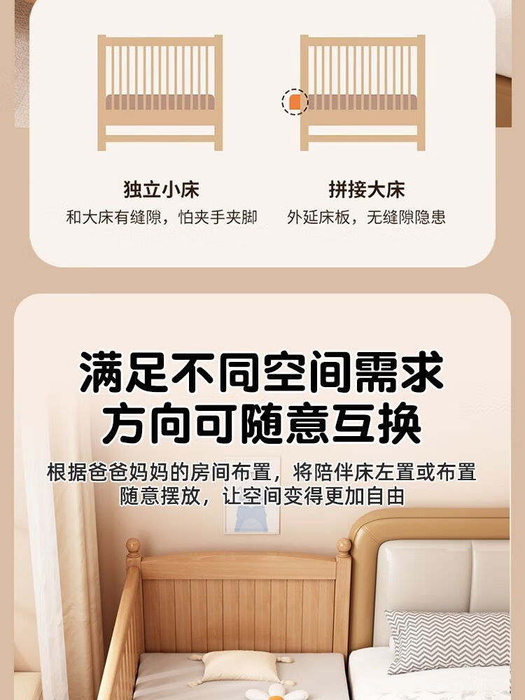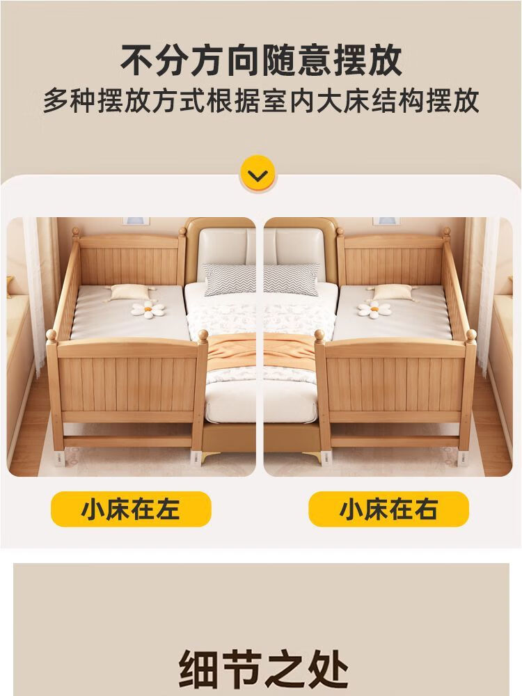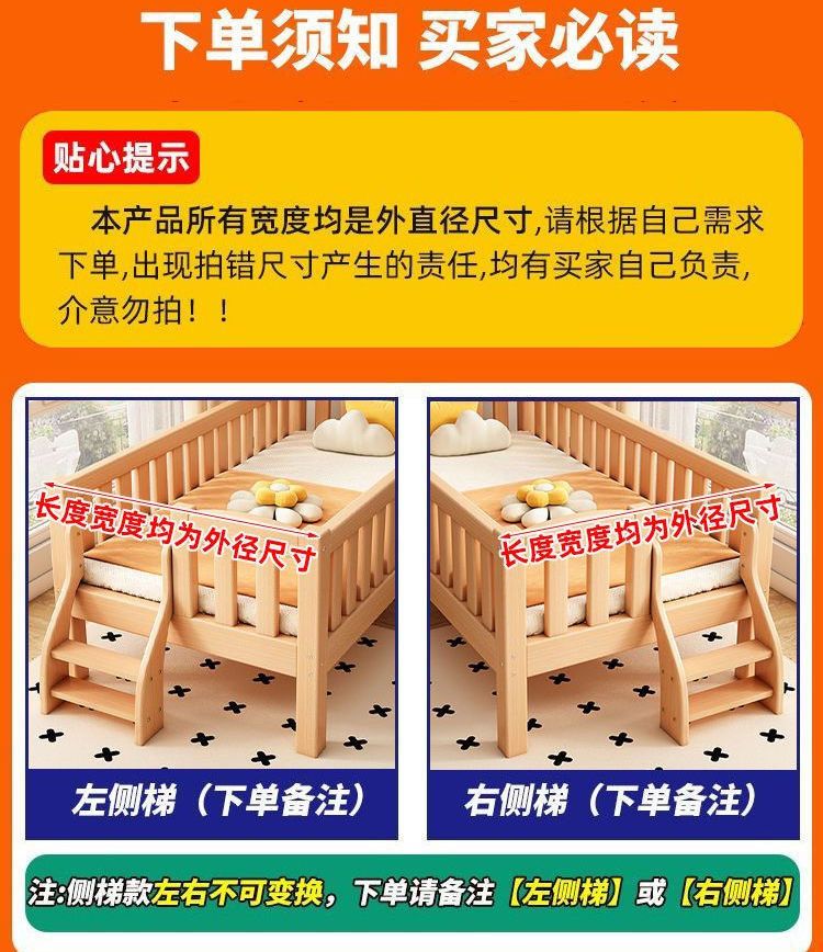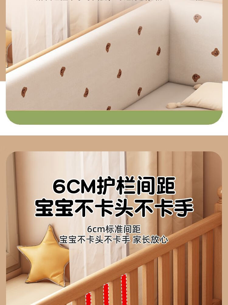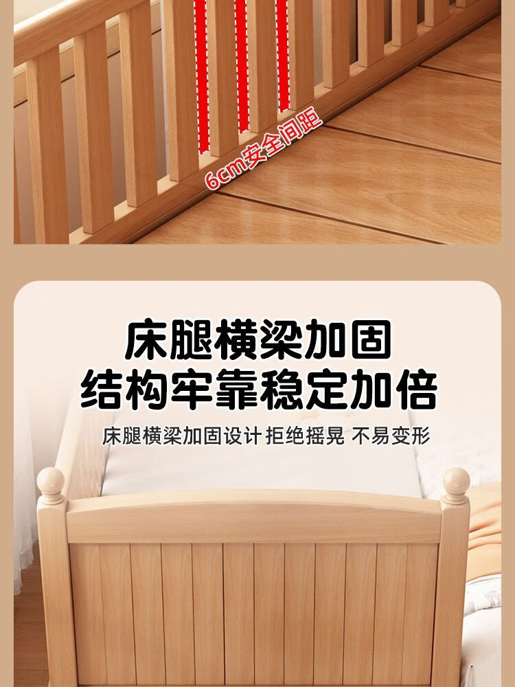 秋莹可升降榉木拼接床实木儿童床婴儿床加宽拼接大床小孩床边床拼接床 三护栏+6cm空气纤维床垫 高可调 可升降长180宽100高35【60护栏】