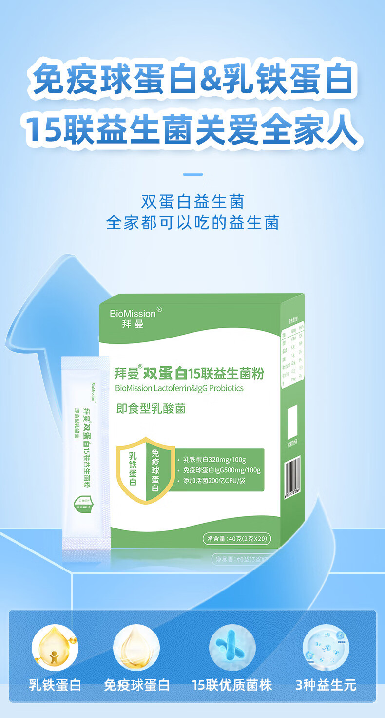 拜曼15联双蛋白益生菌成人小孩免疫球蛋白老人孕妇乳铁蛋白肠胃肠道 20袋*5盒