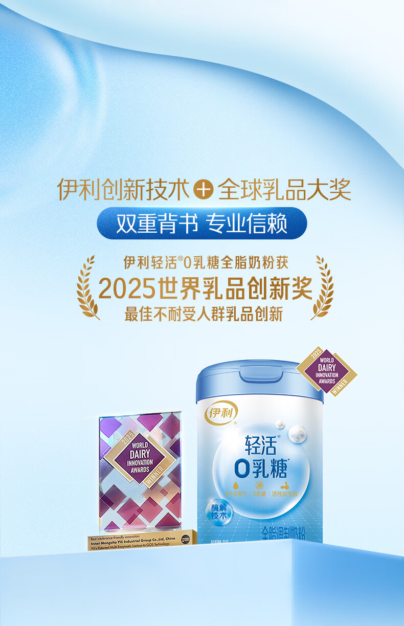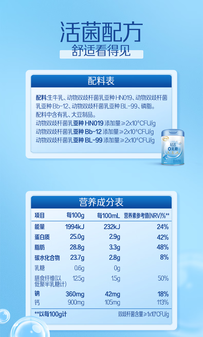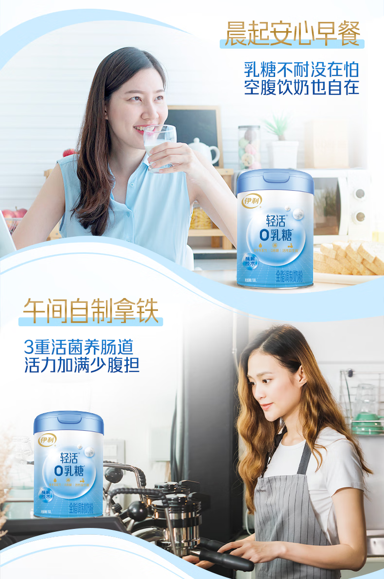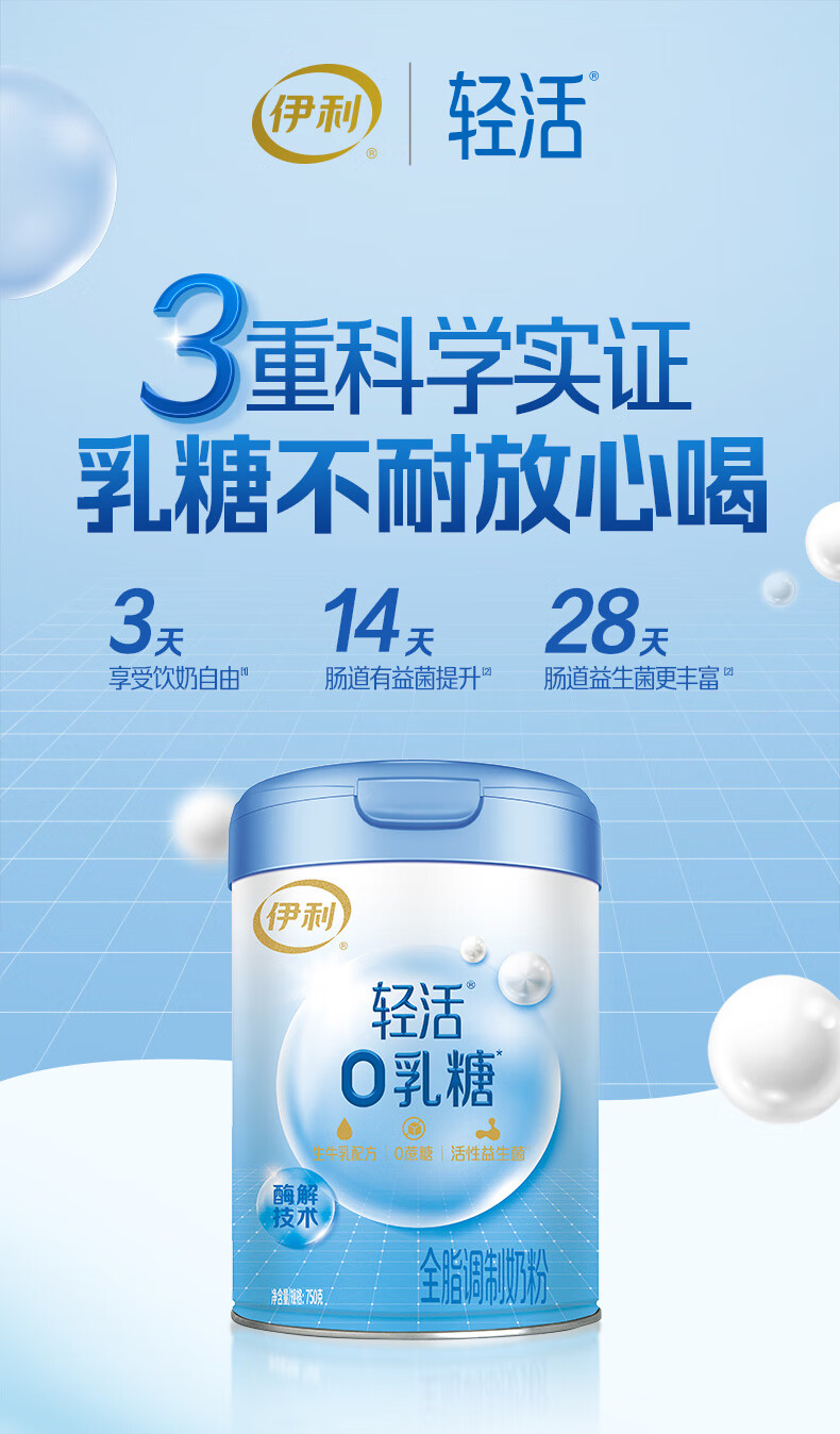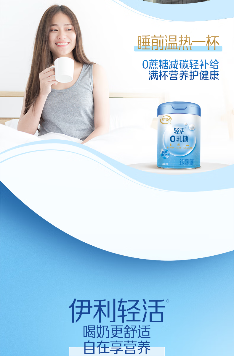 伊利轻活0乳糖全脂奶粉 成人奶粉 乳糖不耐推荐 年货节送礼 营养 750g