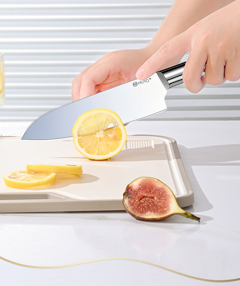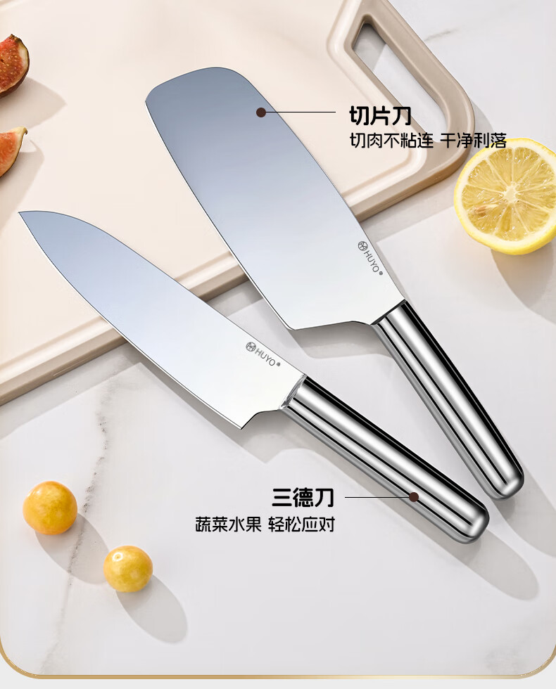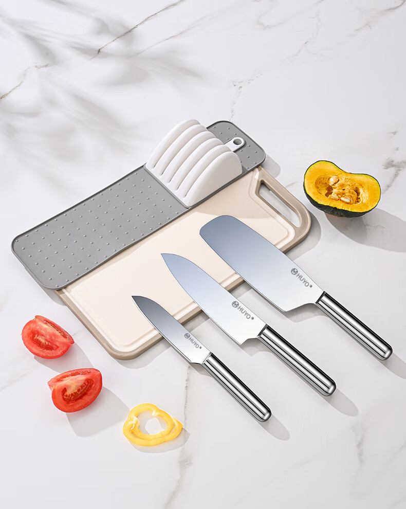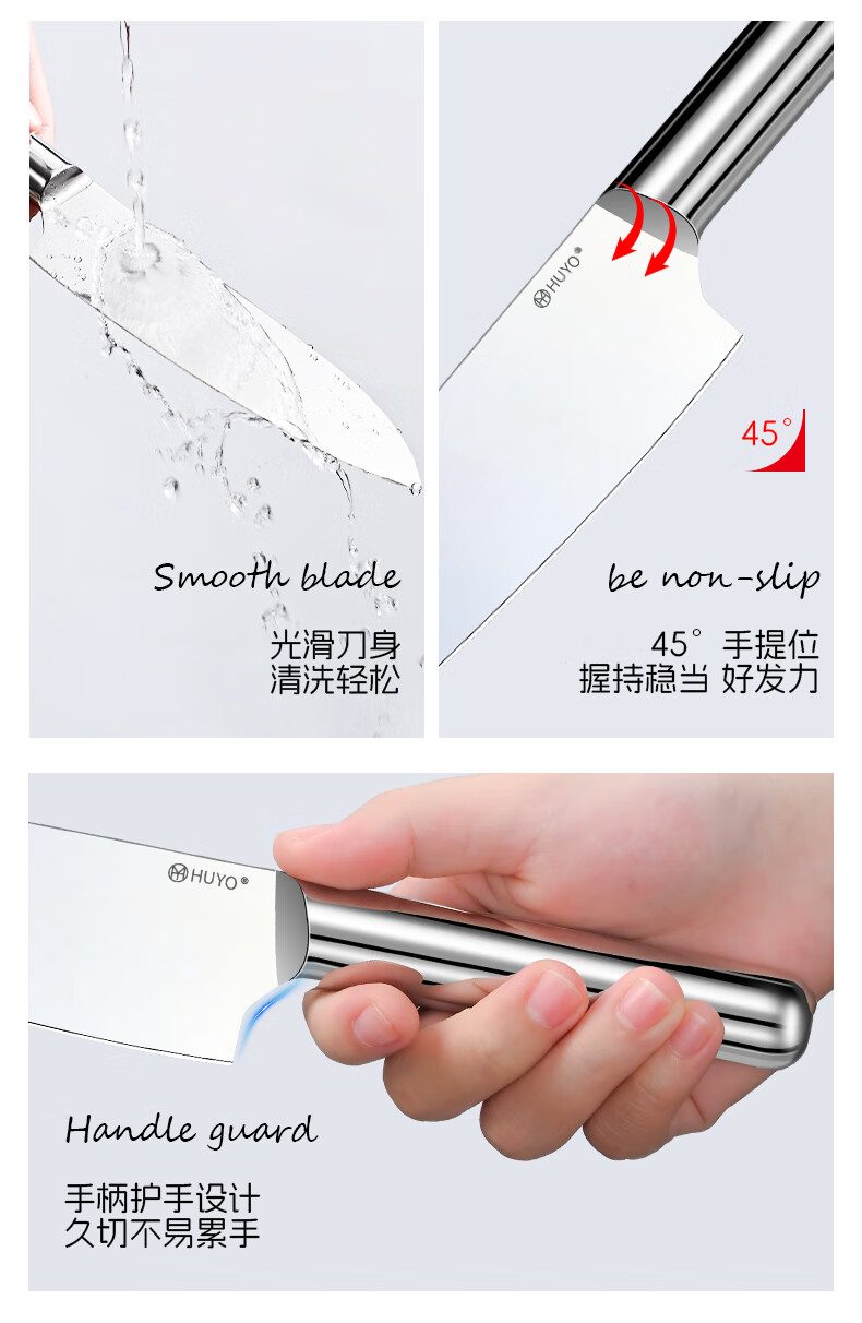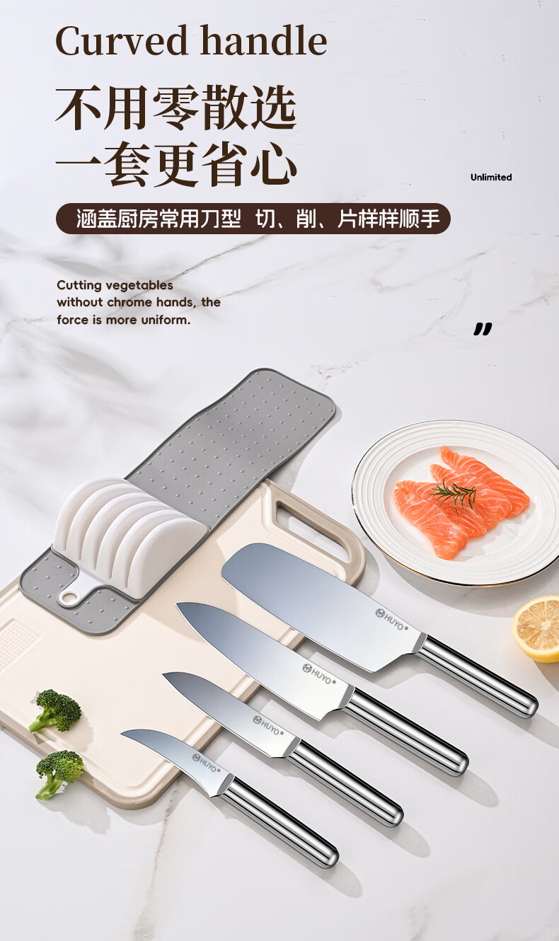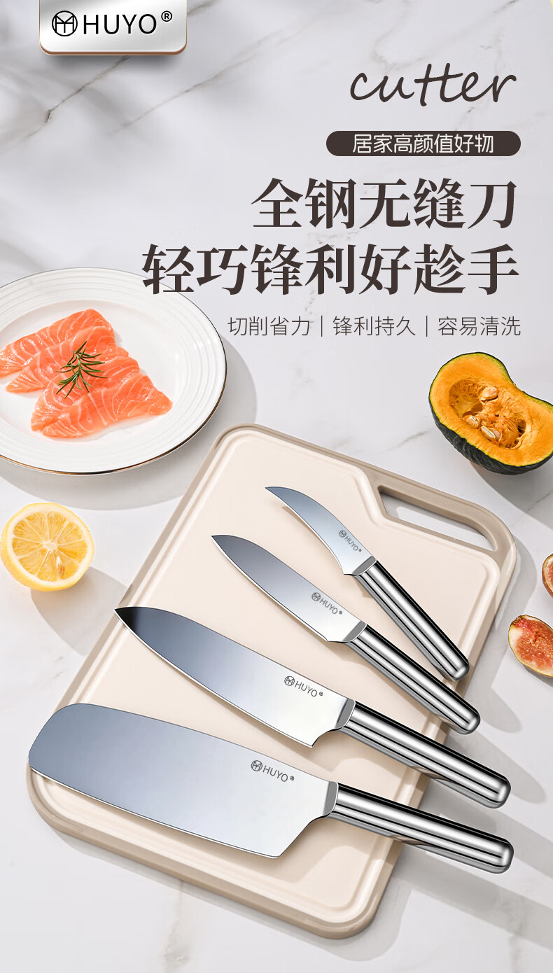 HUYO不锈钢菜刀家用女士专用小型刀具厨房切肉鱼生三德刀厨师切薄片刀 四件套【小菜刀+三徳刀+小弯刀+水果刀】送刀架