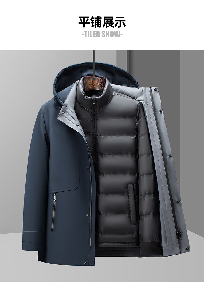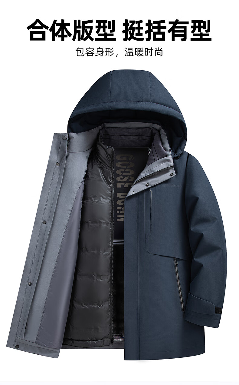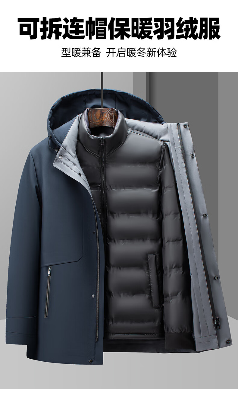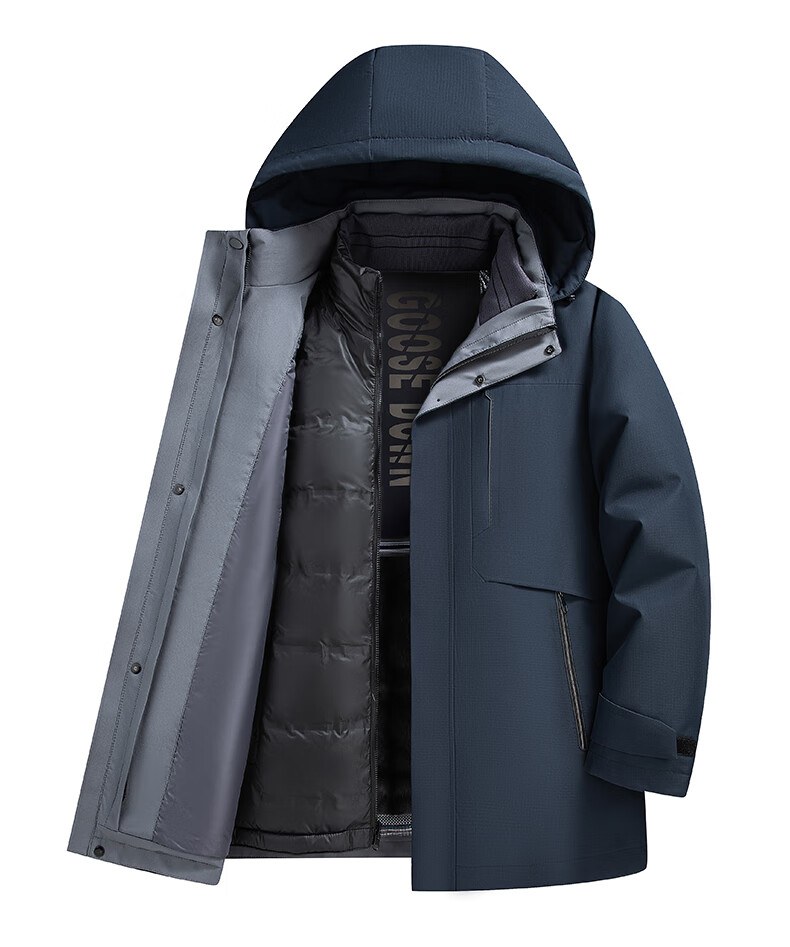 罗蒙(ROMON)一衣多穿可拆卸内胆连帽鹅绒羽绒服男士中长款保暖加厚防寒服外套 蓝灰色 XL 180(适合135-155斤)