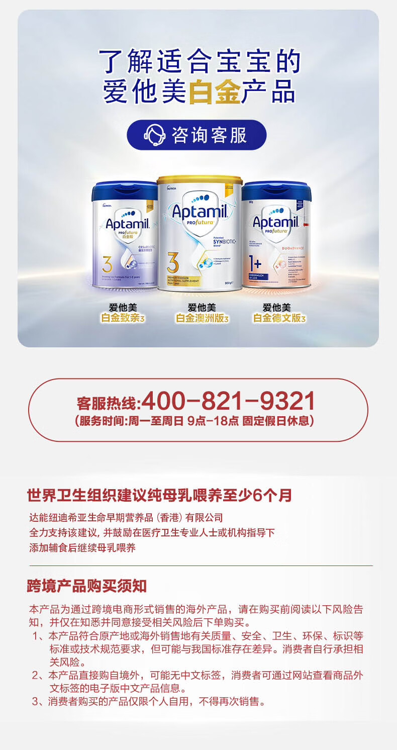 爱他美(Aptamil)德国白金版HMO 较大婴儿配方奶粉2段(6个月以上) 800g 德爱白金