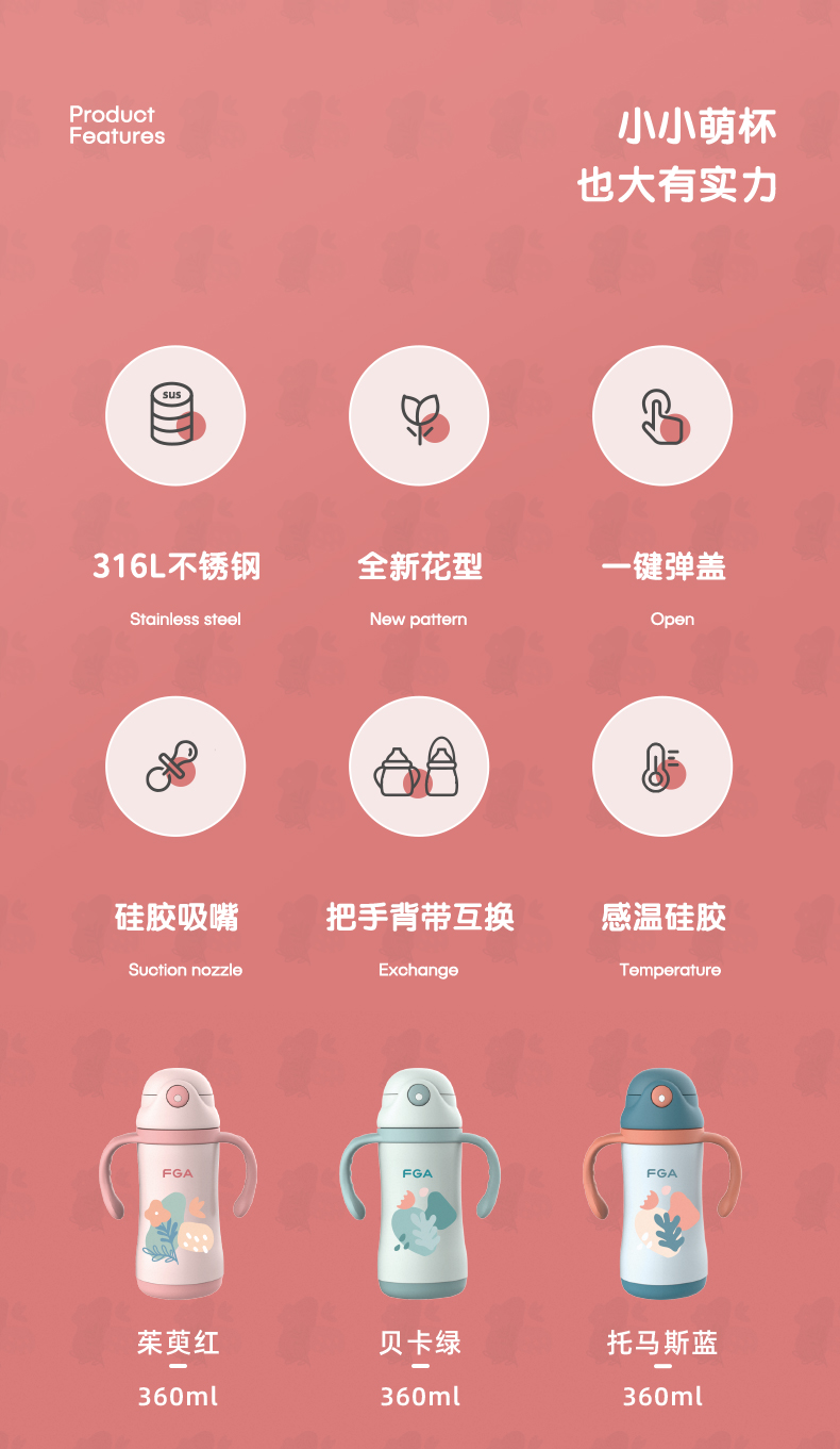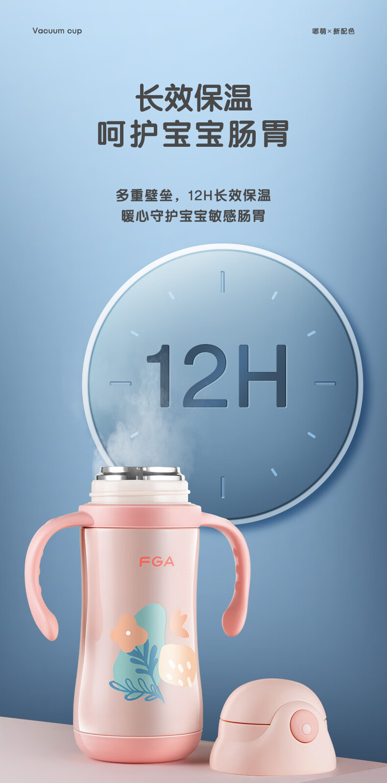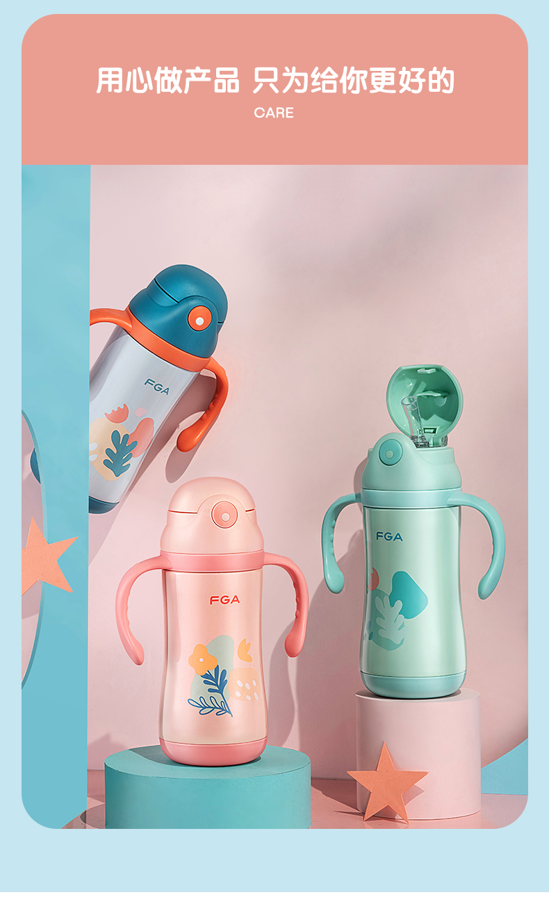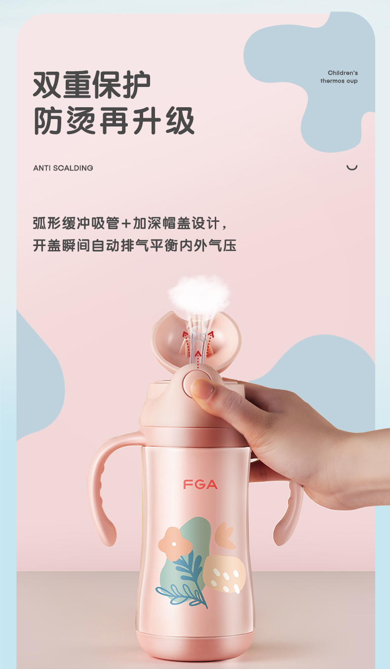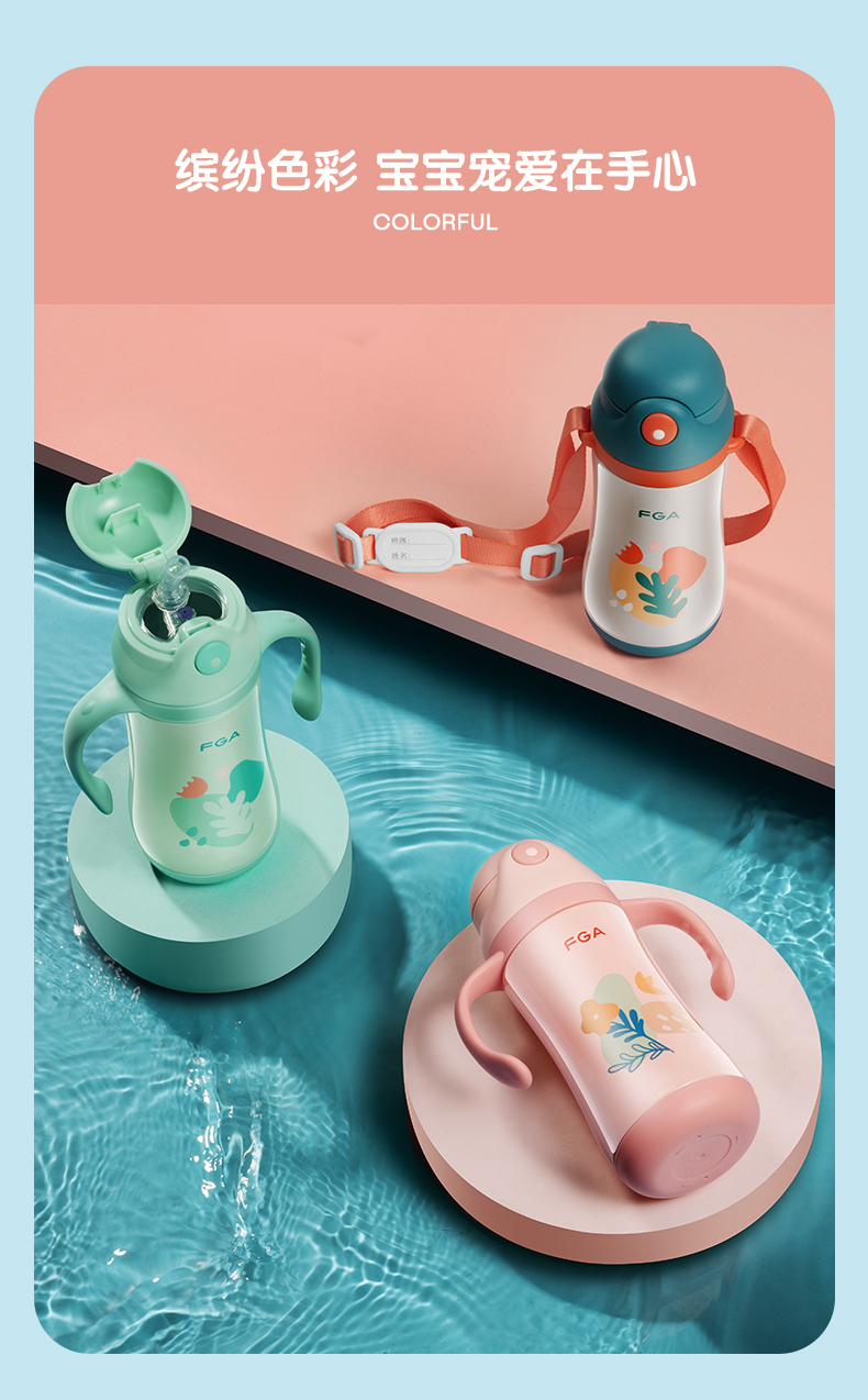 FGA富光儿童保温杯幼儿园宝宝吸管学饮杯316不锈钢把手喝水壶杯子蓝