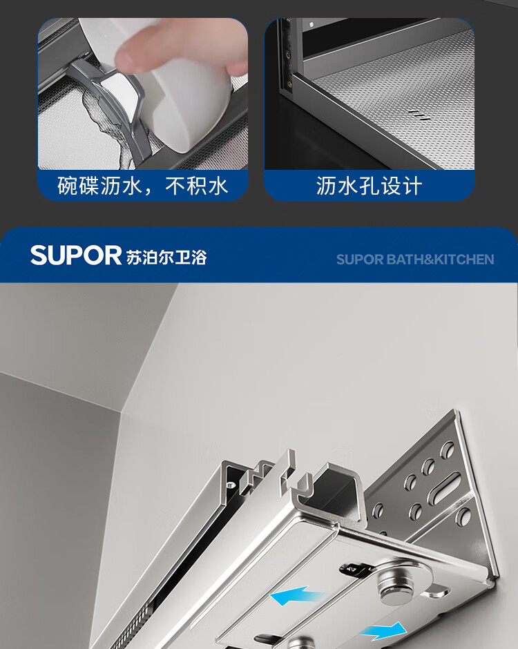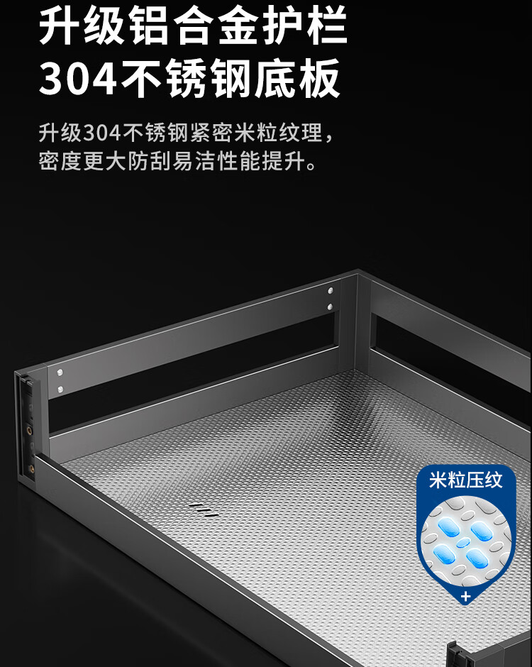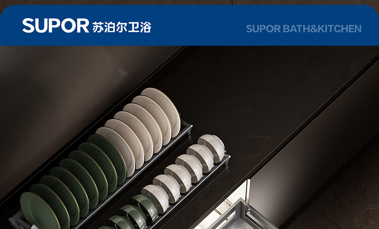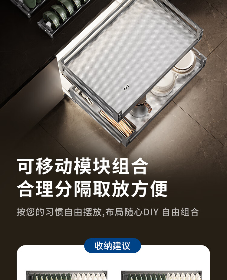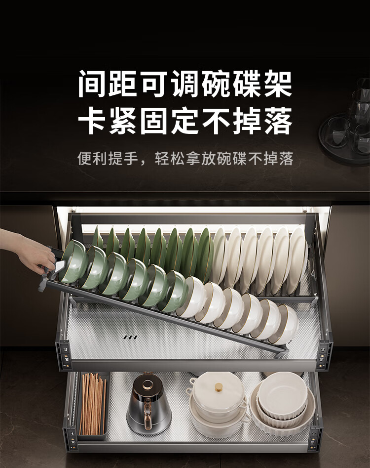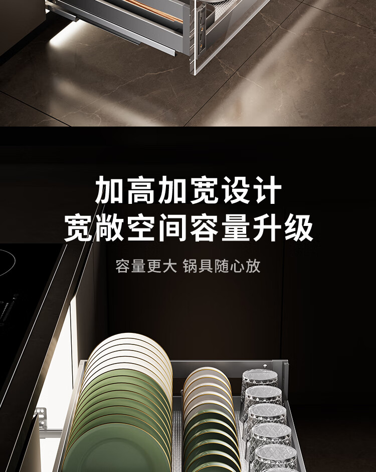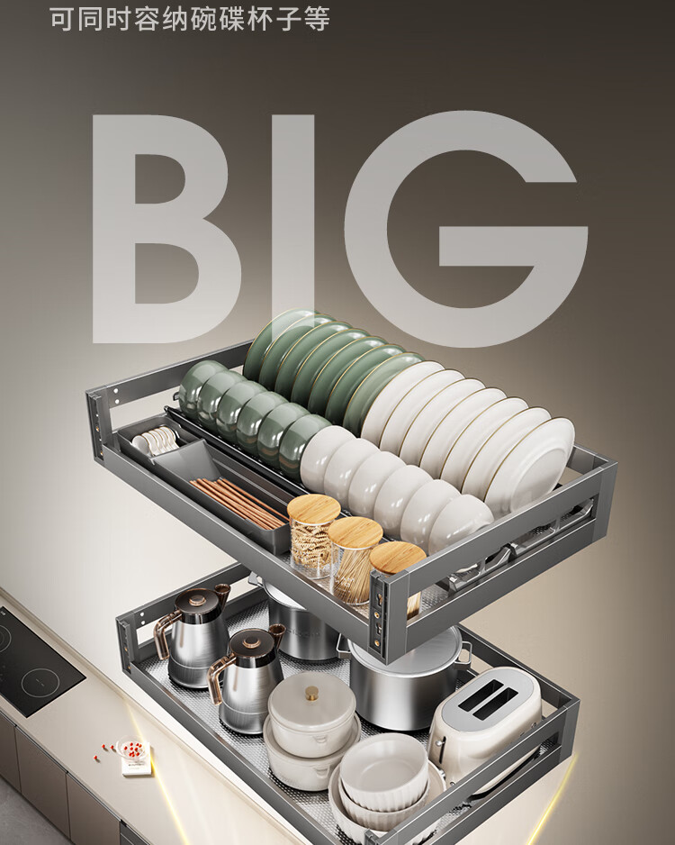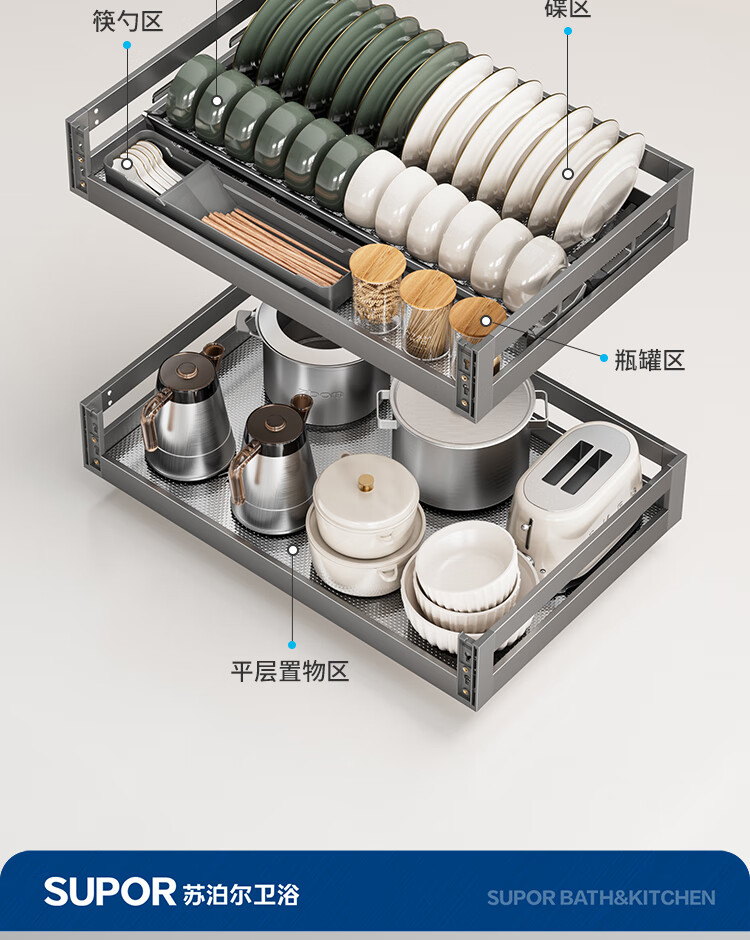 苏泊尔厨房拉篮抽屉式铝合金双层碗篮厨具铝合金碗碟收纳置物架橱柜拉篮 顶峰系列-云灰铝合金+304碗碟拉篮500柜