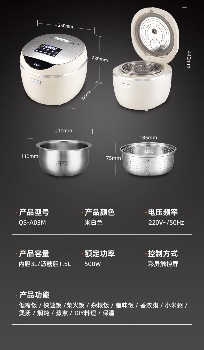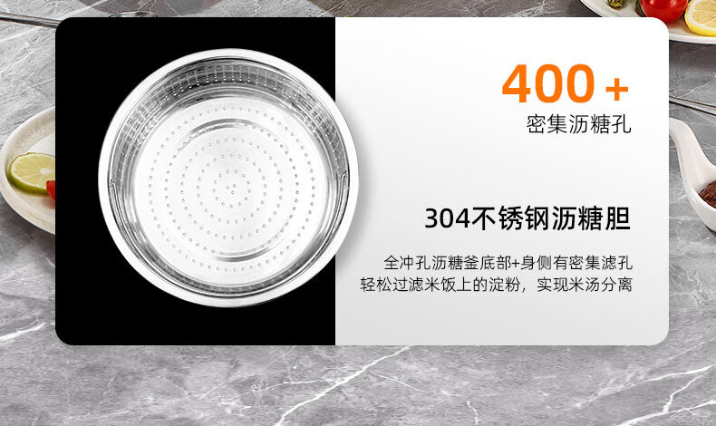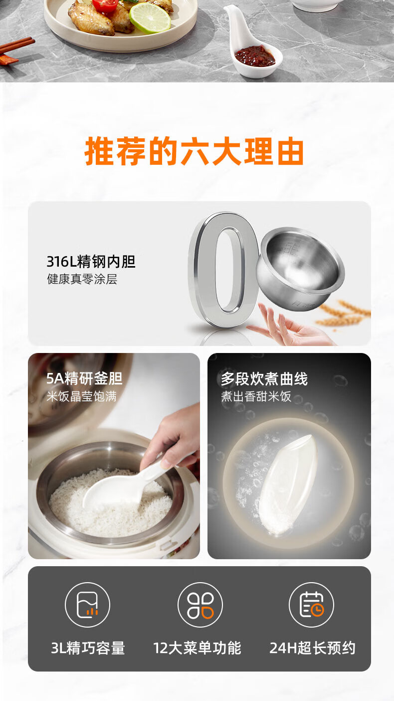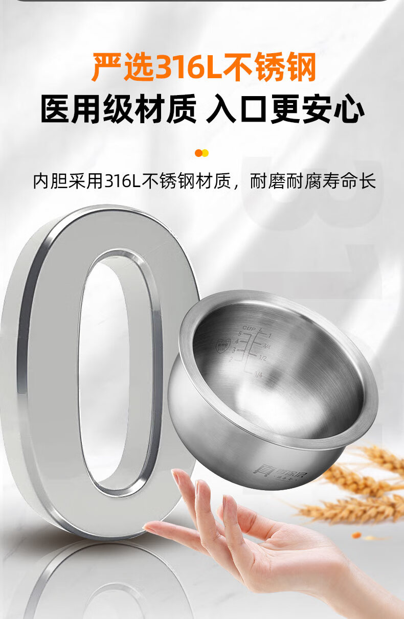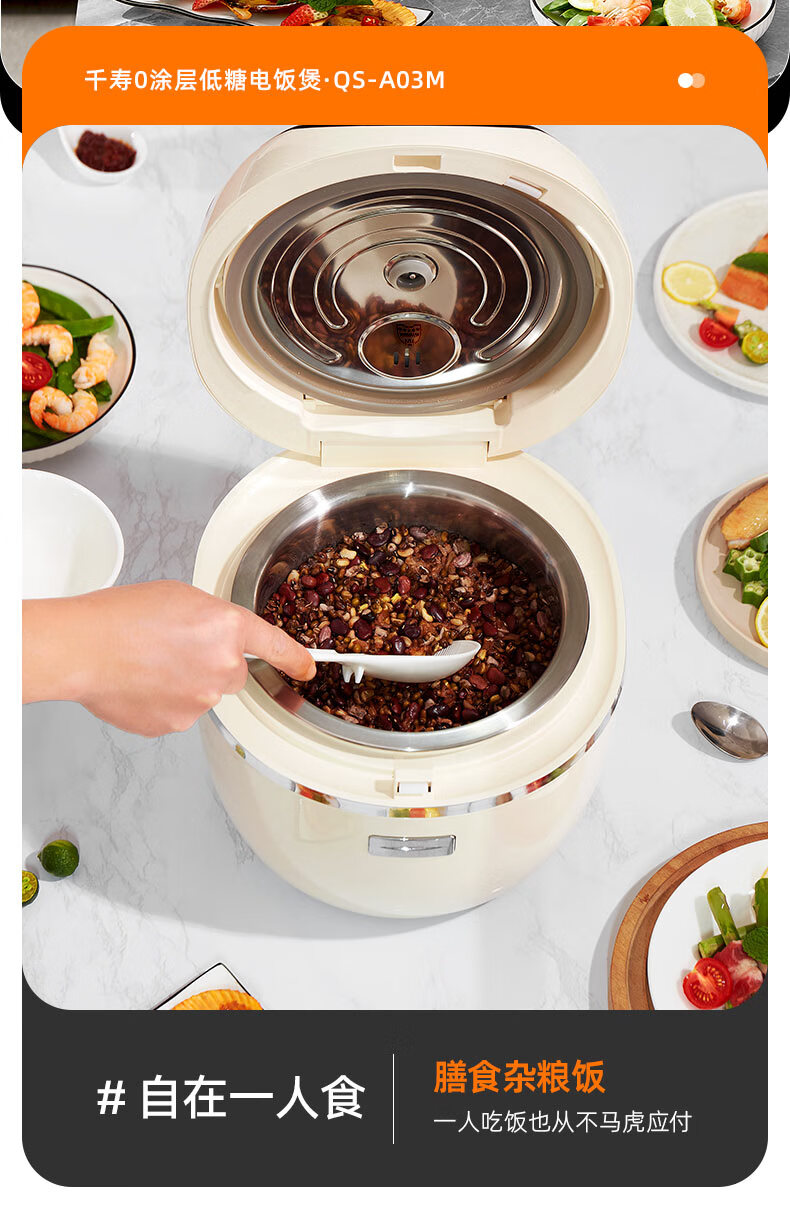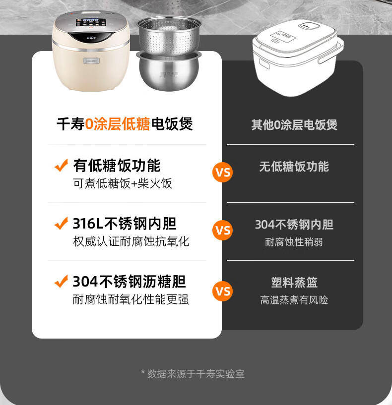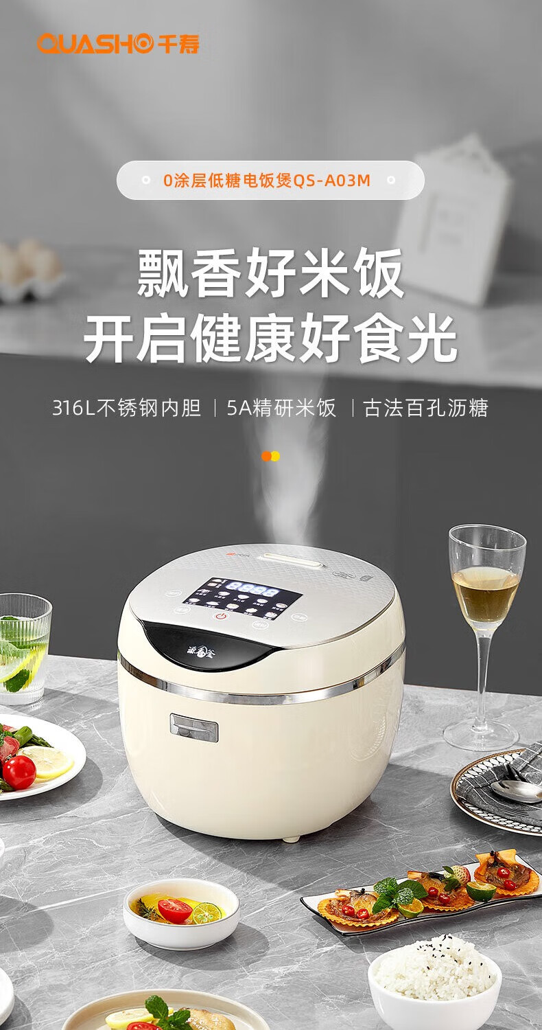 千寿(QUASH0)316不锈钢内胆 低糖电饭煲 0涂层脱降控减糖饭煲 家用米汤分离沥米电饭锅1-2-3-4个人用 白色升级加厚球釜内胆 3L 1-4人适用 【304不锈钢内盖+316不锈钢内胆】