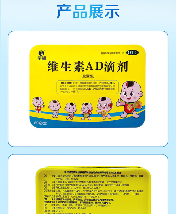 [星鲨]维生素AD滴剂 1800IU:600IU*60粒 1盒装 维生素AD滴剂60粒 用于预防和治疗维生素A及D缺乏症小儿手足抽搐症夜盲症