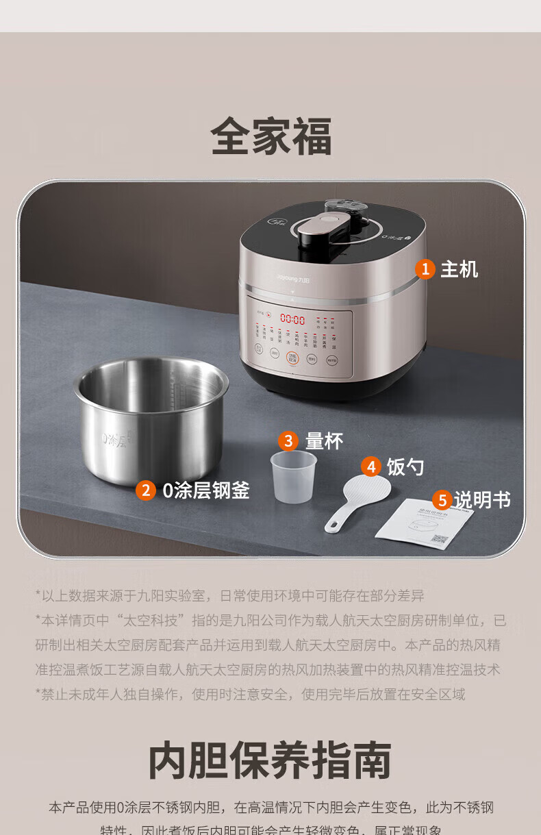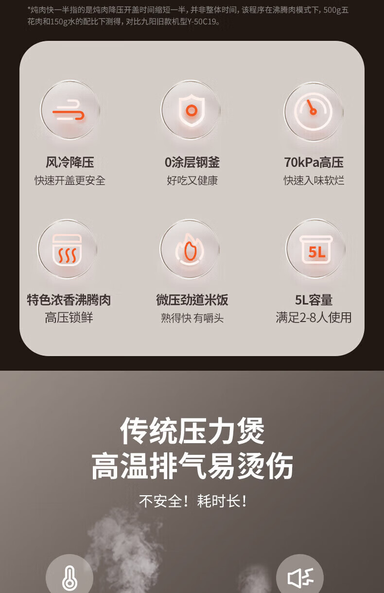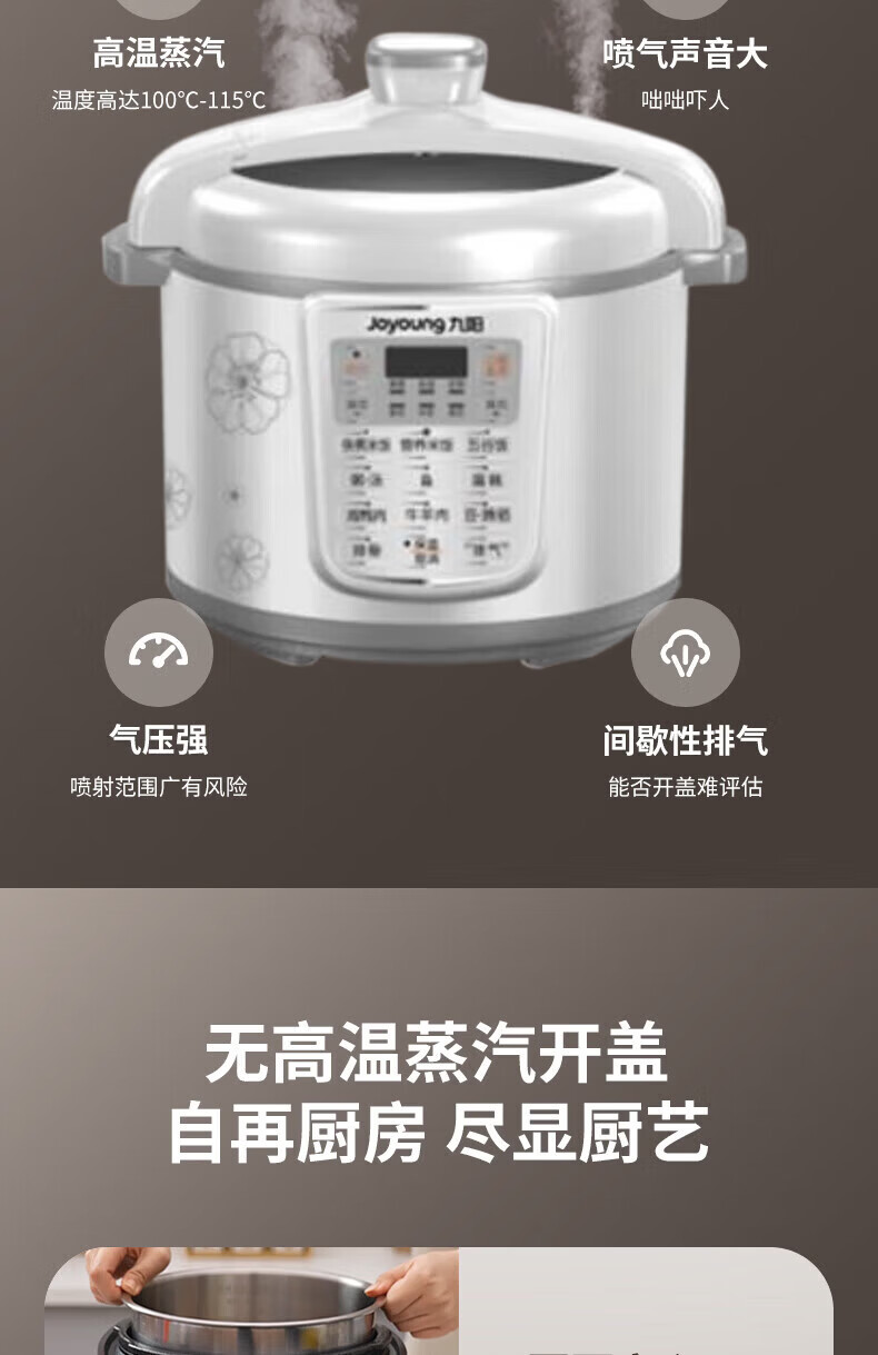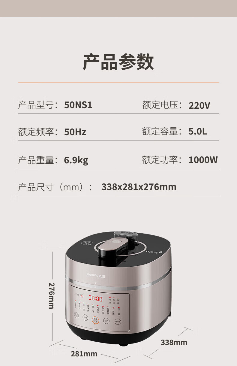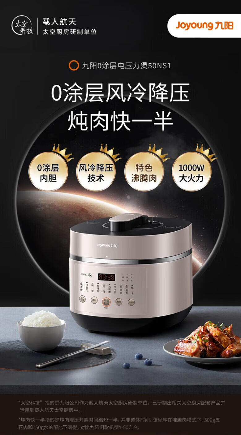 九阳(Joyoung)电压力锅家用不锈钢钢釜太空系列 3-10人电饭煲0涂层压力煲水润膜不粘风冷降压煮饭煲汤5L大容量 50NS1【0涂层钢釜】 5L