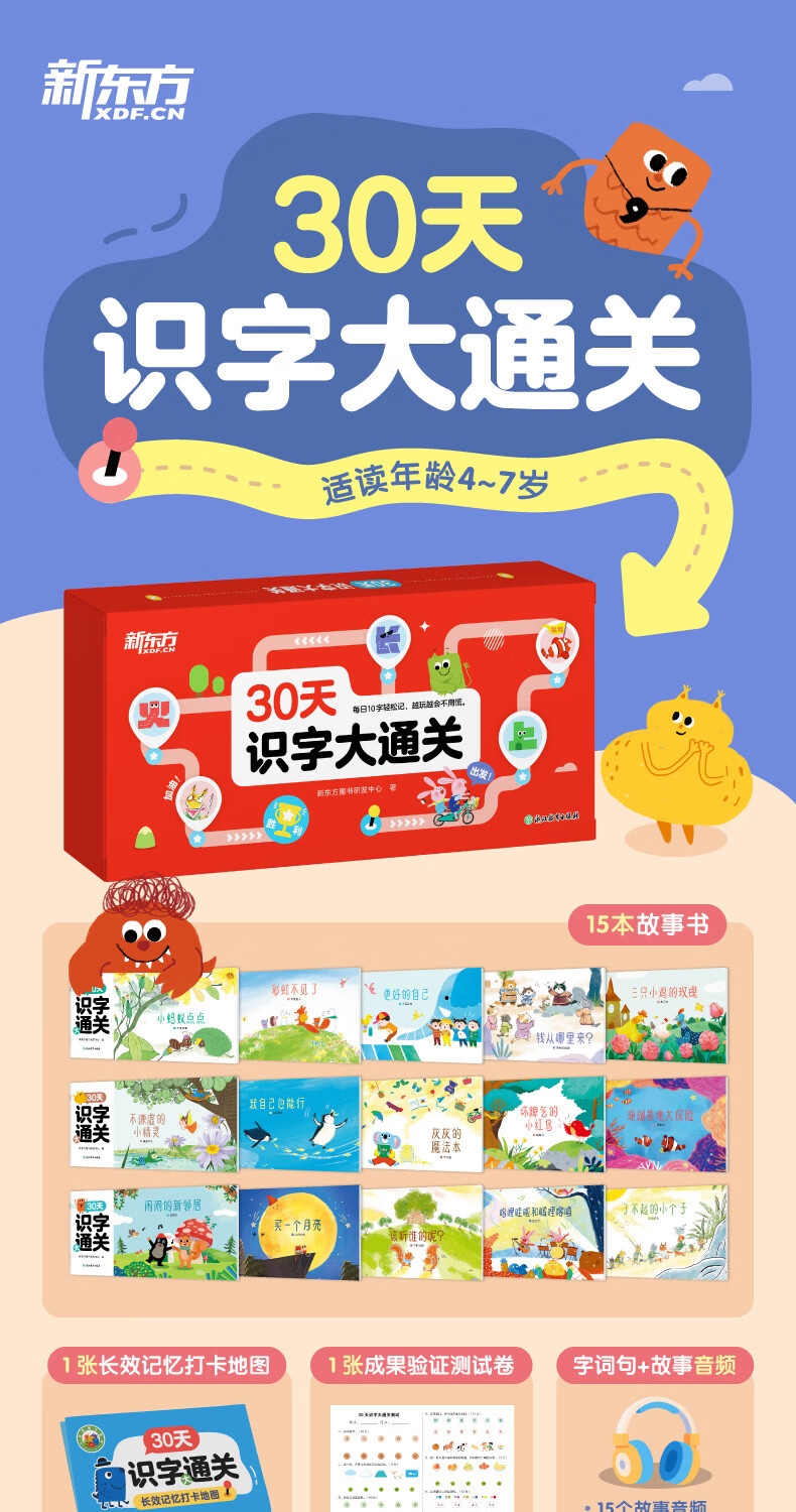 新东方(XDF.CN)30天识字大通关(全15册)是一套专为5~7岁孩子设计的情景故事+玩游戏的识字书 30天识字大通关(共15册)