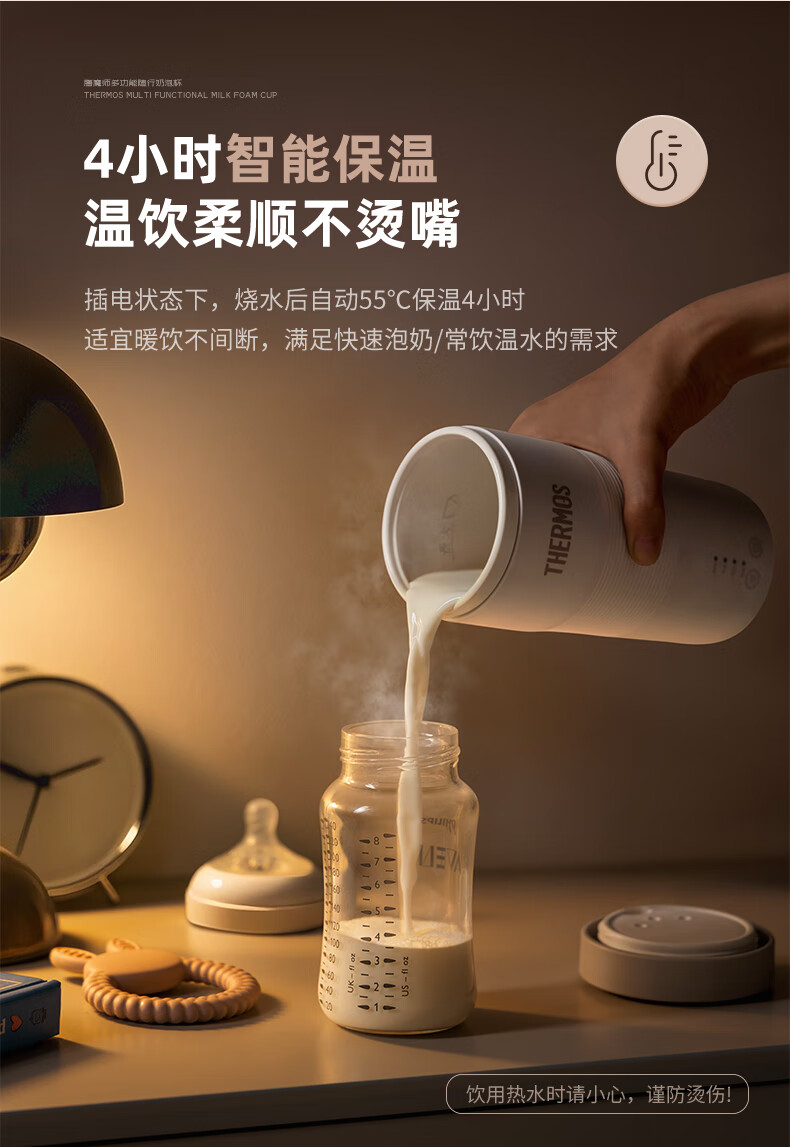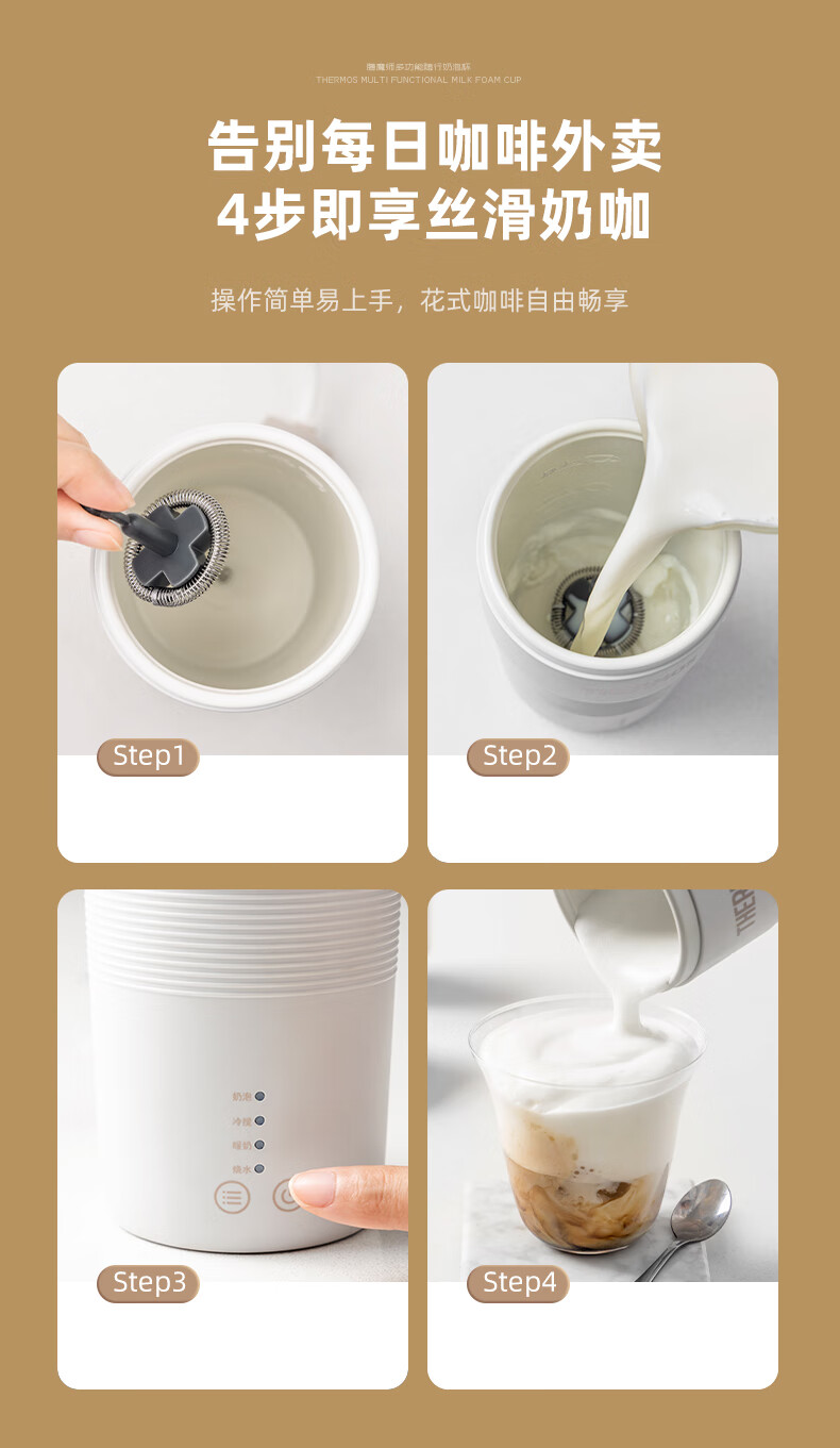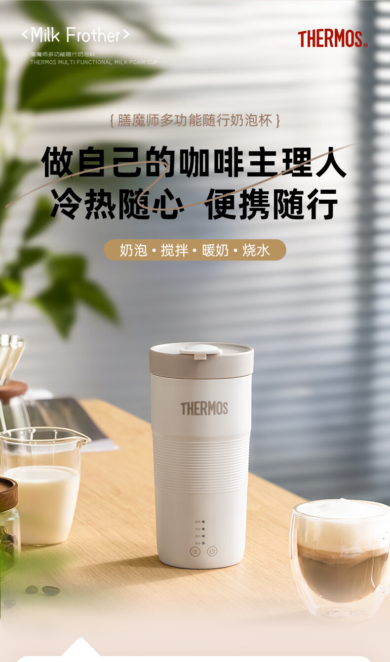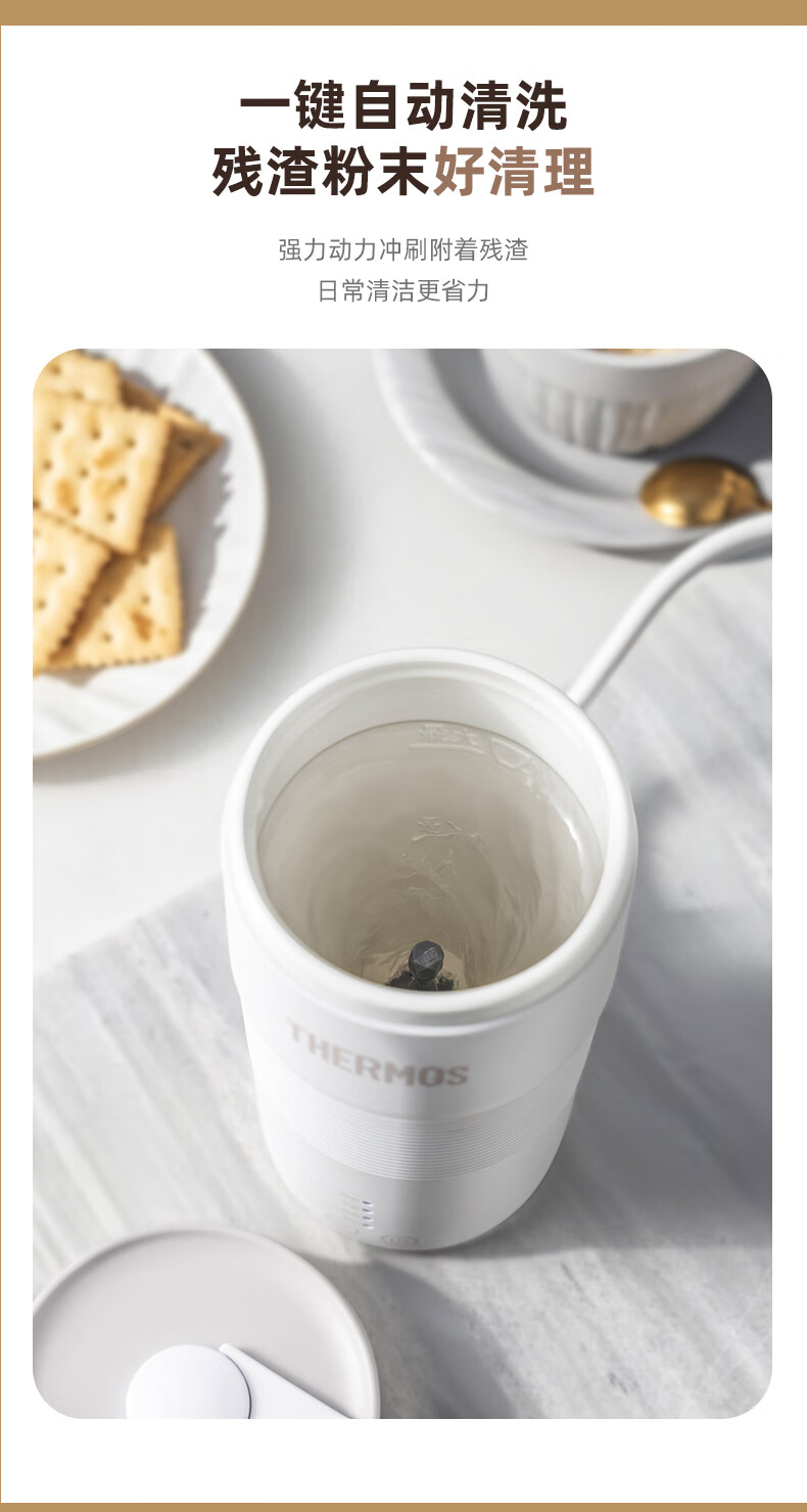 膳魔师(THERMOS)多功能奶泡机电动便携式热水杯家用咖啡搅拌牛奶打发冷热双用奶泡杯 户外车载水杯加热杯 团购送礼 【标准款】淡雅白