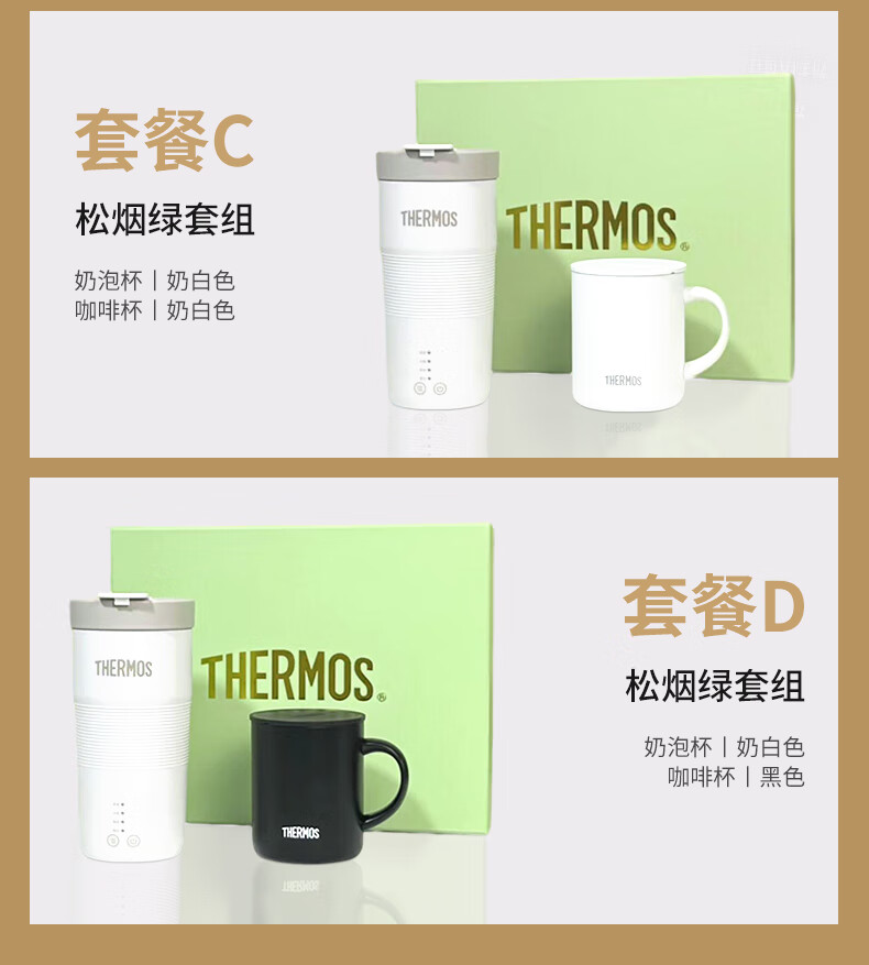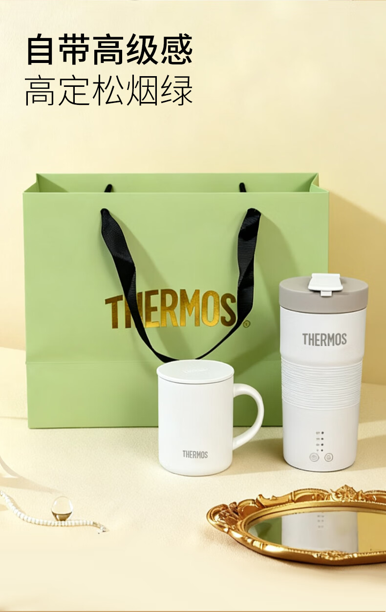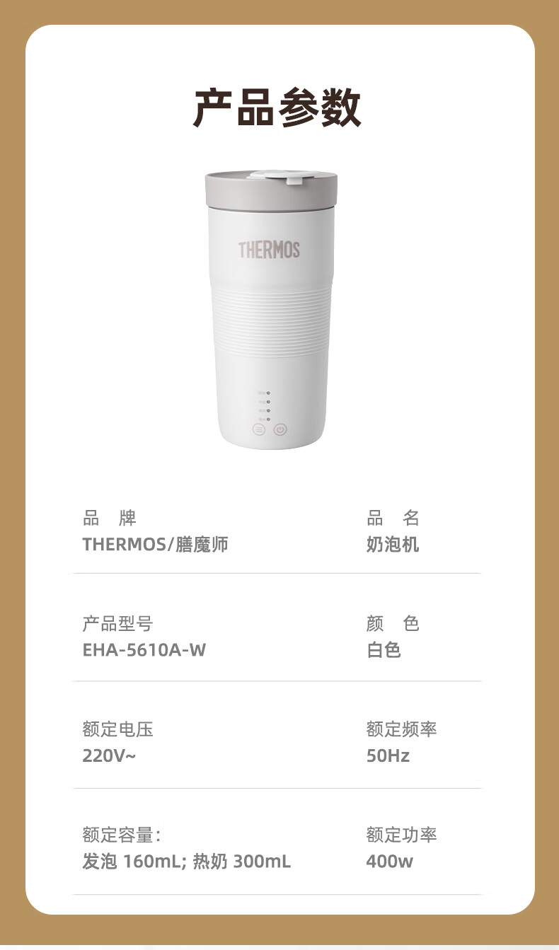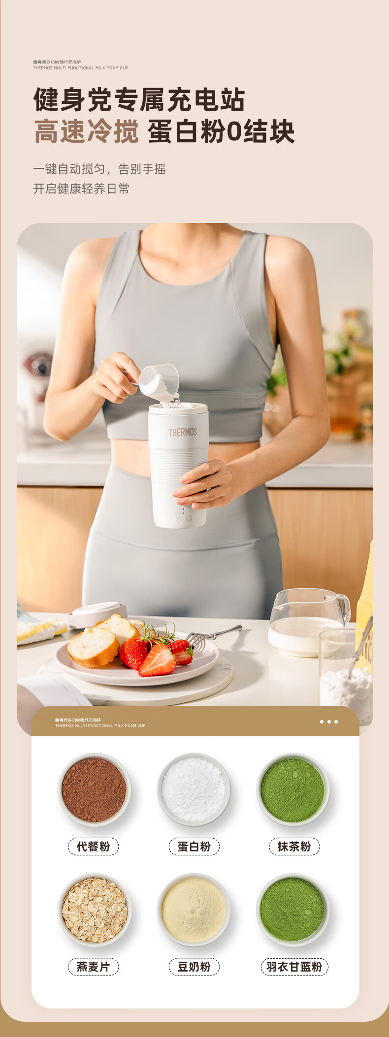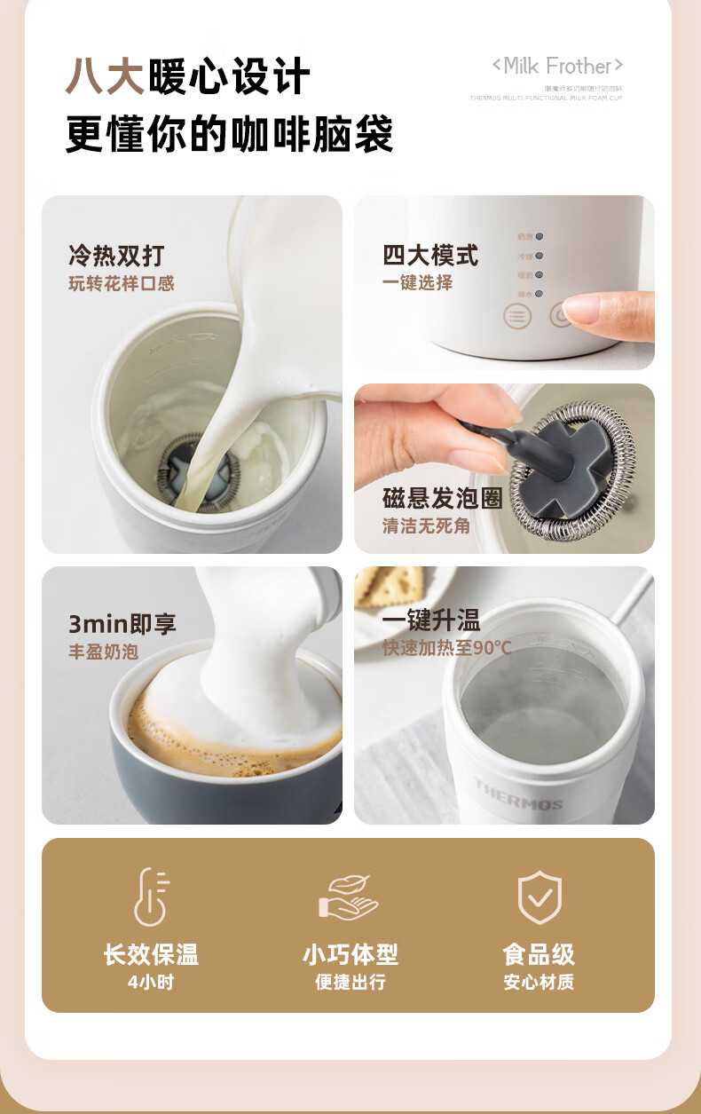 膳魔师(THERMOS)多功能奶泡机电动便携式热水杯家用咖啡搅拌牛奶打发冷热双用奶泡杯 户外车载水杯加热杯 团购送礼 【标准款】淡雅白