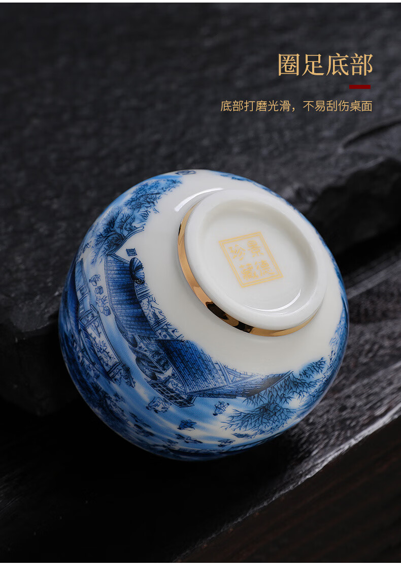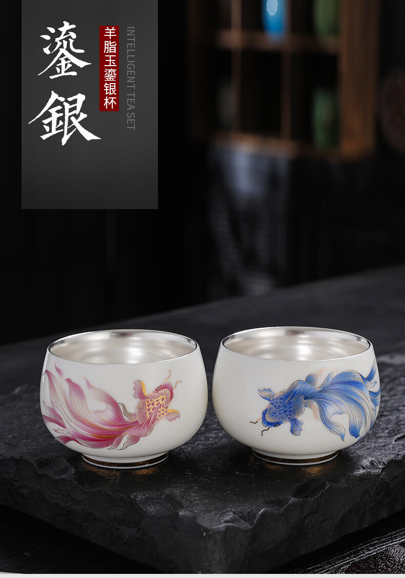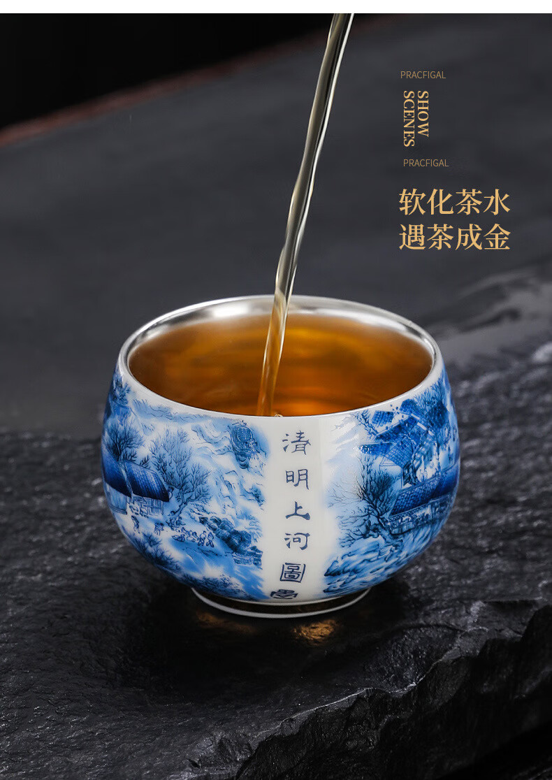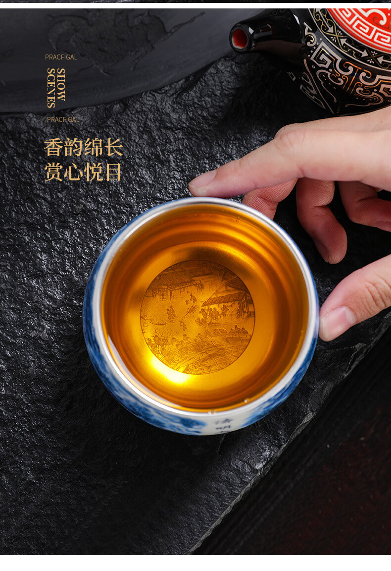 青天问月主人杯单杯鎏银杯999纯银包银陶瓷功夫茶具茶杯个人轻奢品茗礼盒 鎏银罗汉杯-千里江山+礼盒 150ML