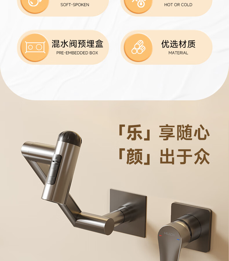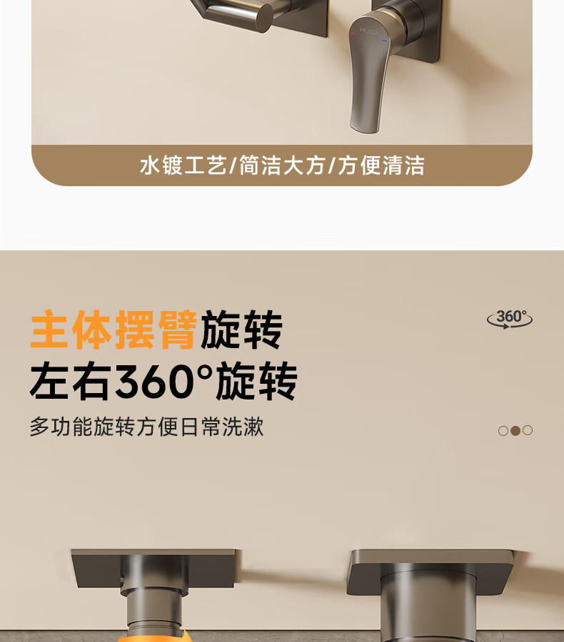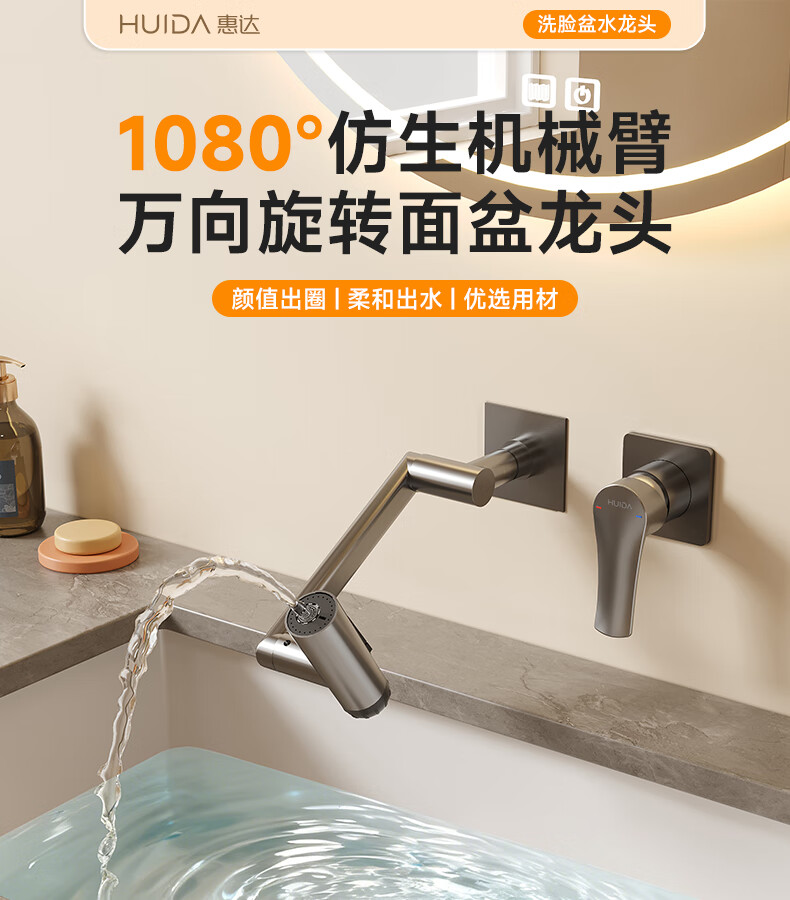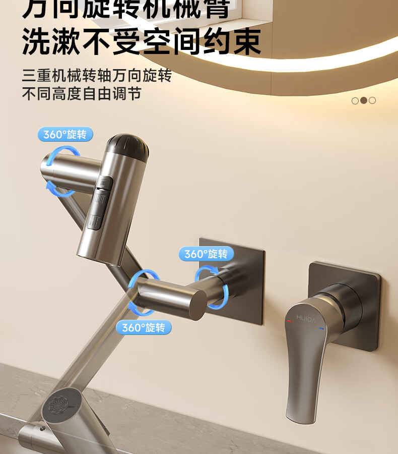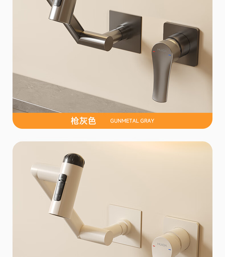 惠达(HUIDA)入墙式机械臂万向旋转水龙头嵌入式招财猫冷热隐藏式墙排暗装龙头 【机械臂·万向】枪灰色四出水FM2208