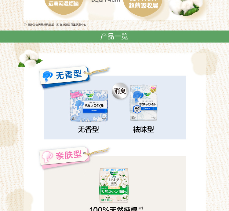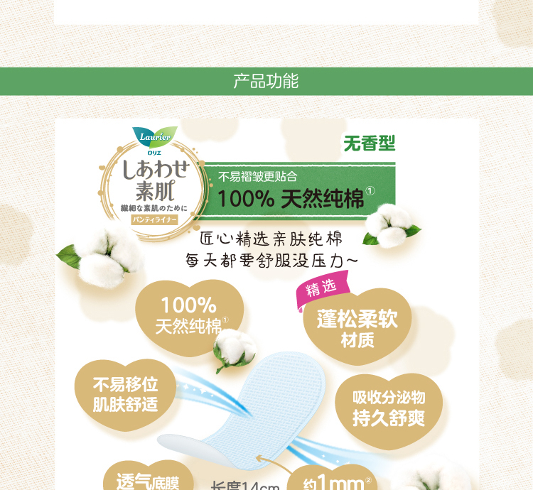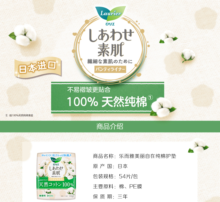 乐而雅花王美丽自在纯棉透气进口护垫超薄14cm54片卫生巾姨妈巾京东自营
