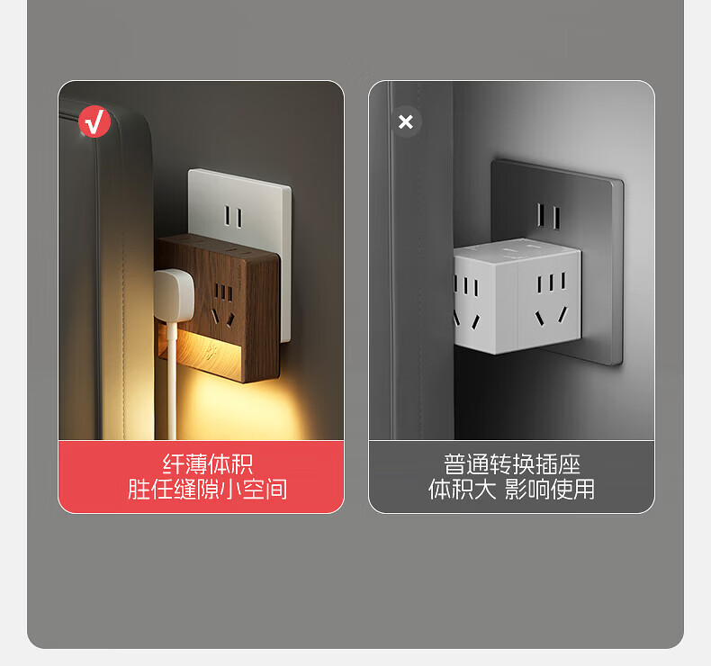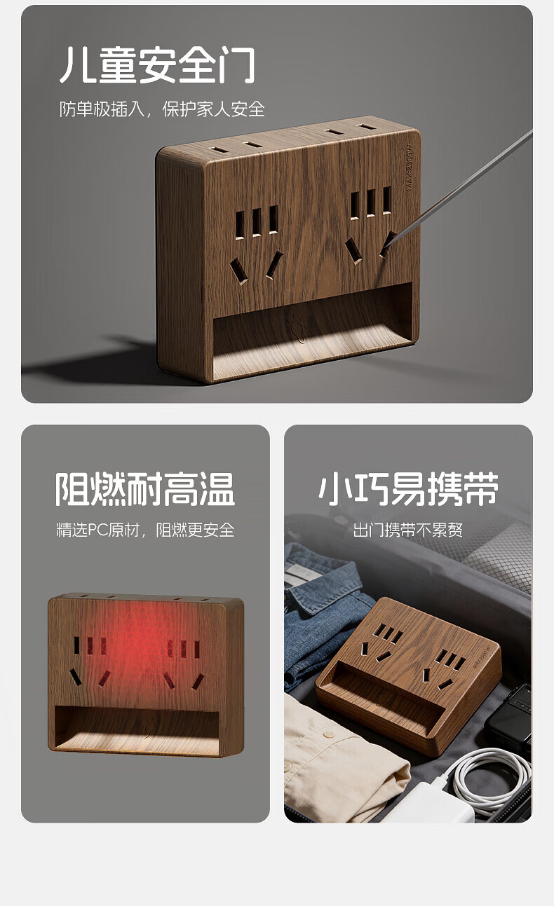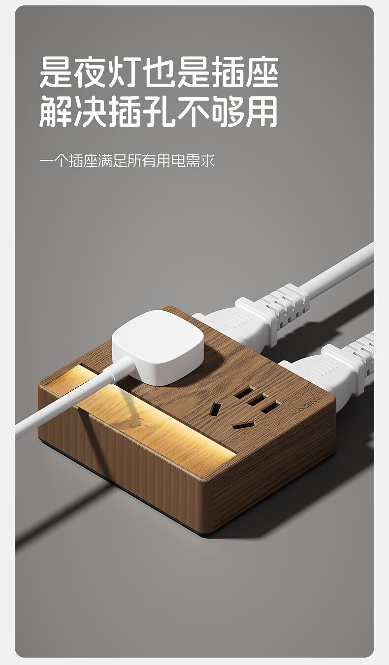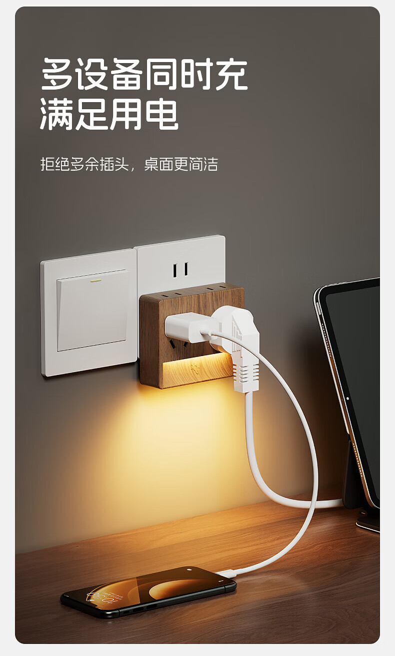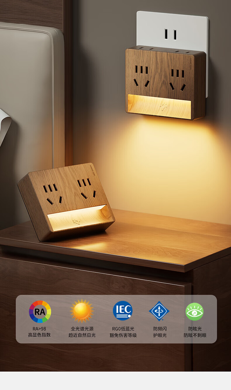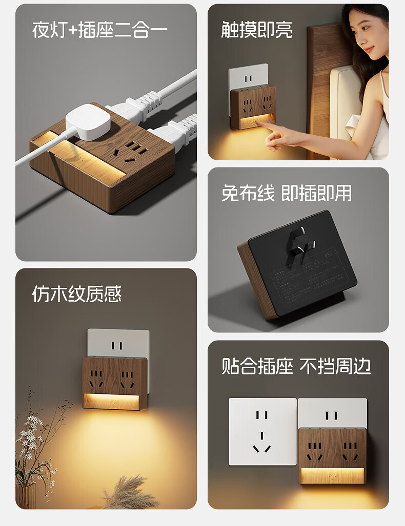 国际电工无线插座转换器一转四扩展插座复古木纹床头小夜灯全光谱护眼插板 【木纹触摸款】一转四夜灯插座