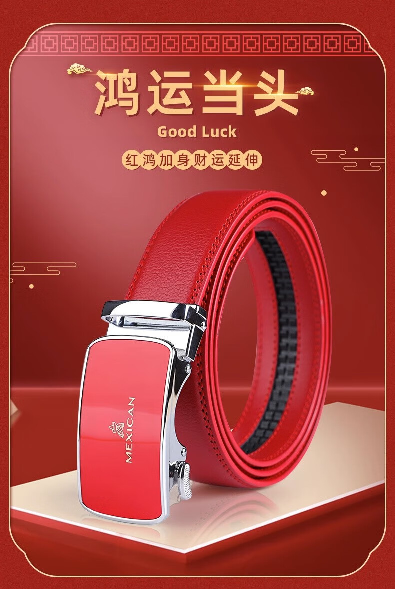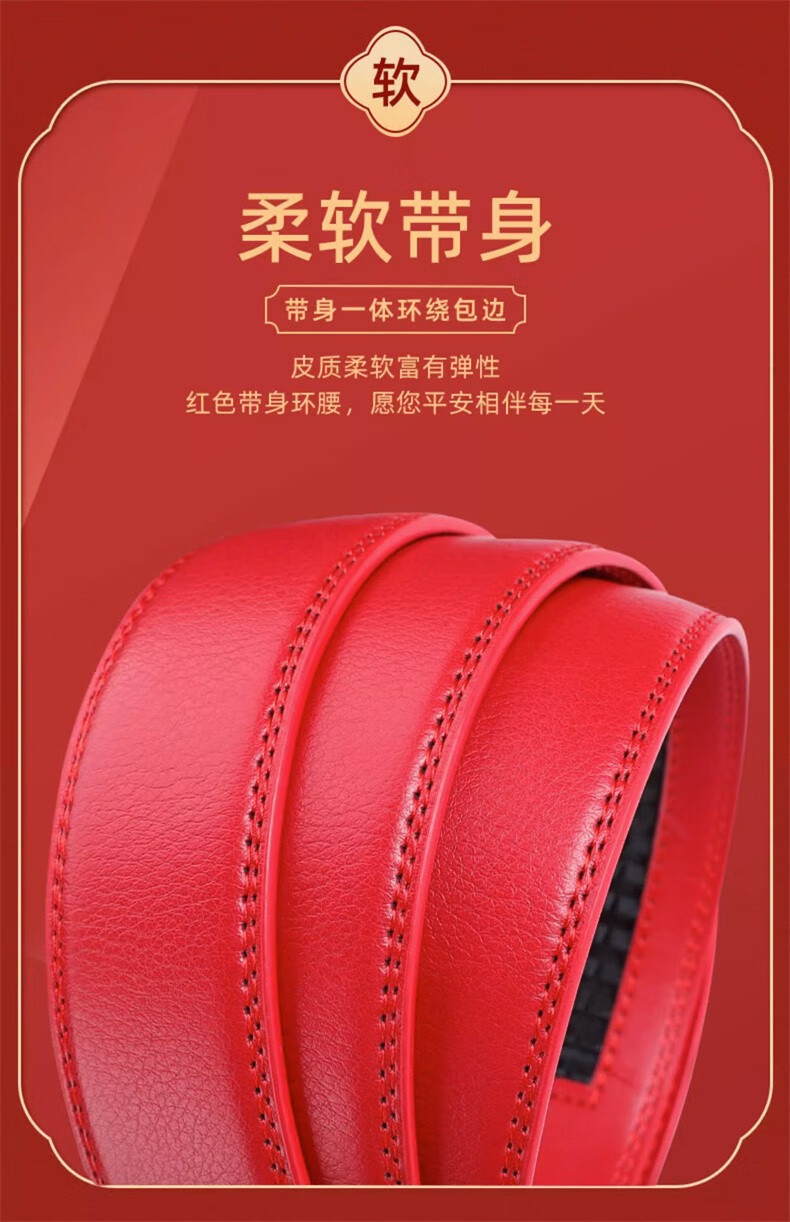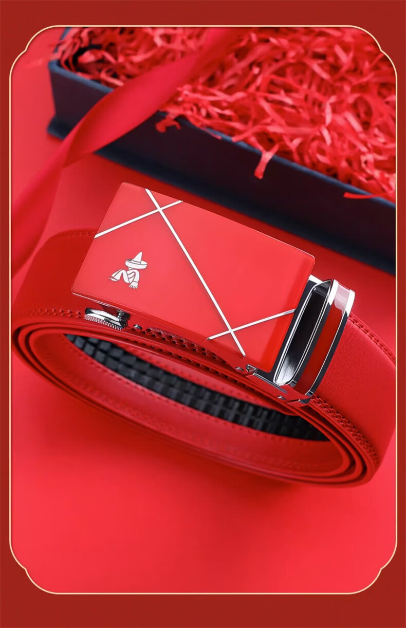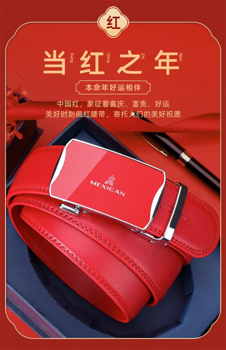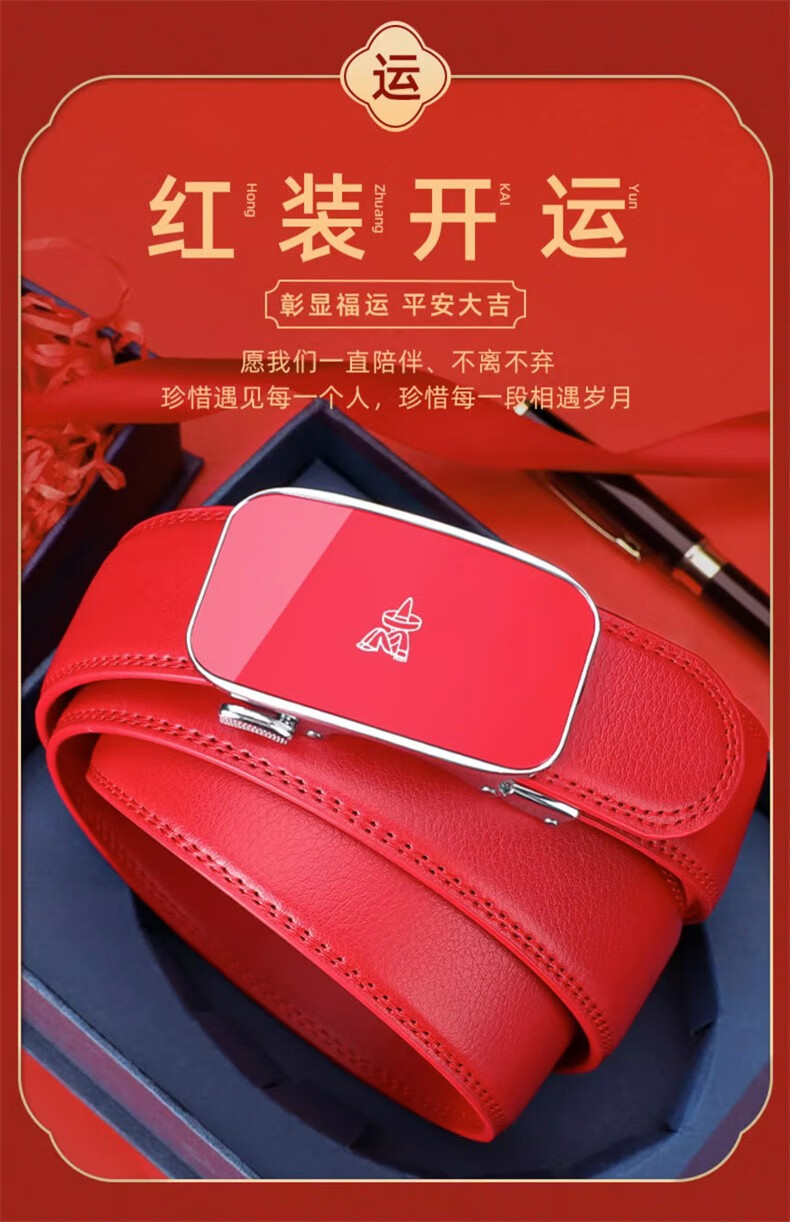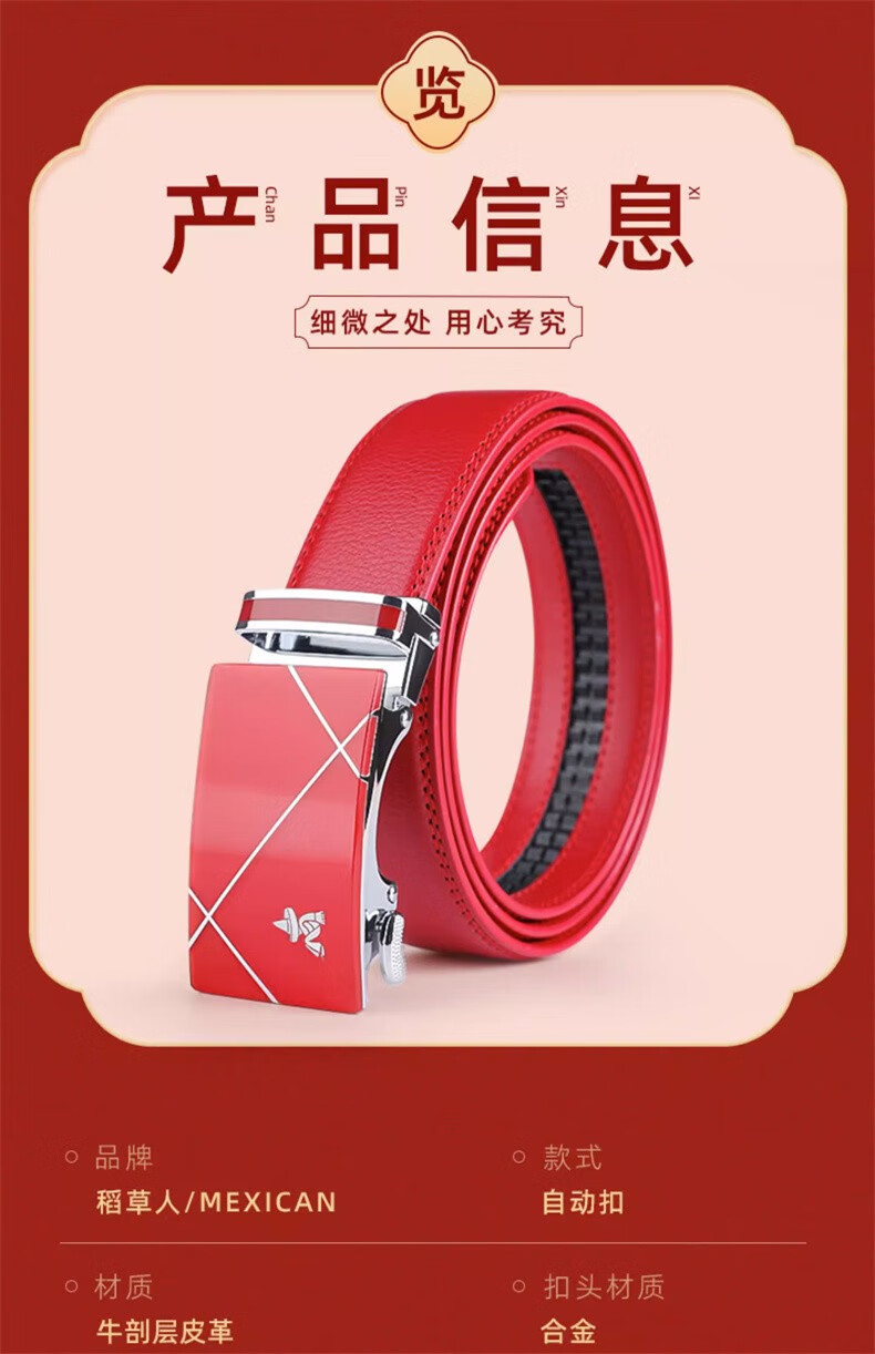 稻草人皮带男本命年红腰带真皮自动扣商务裤腰带男士休闲结婚新年礼物 70060【红色】长度110-125cm可选