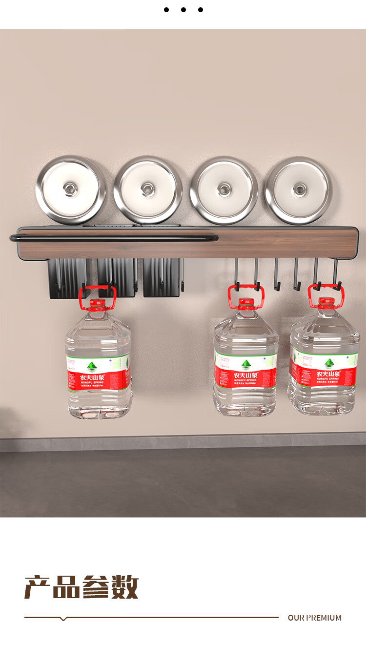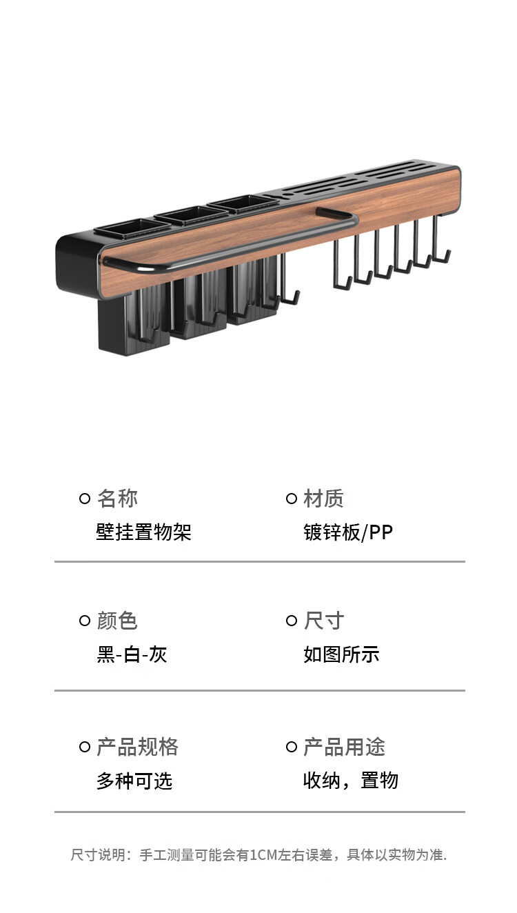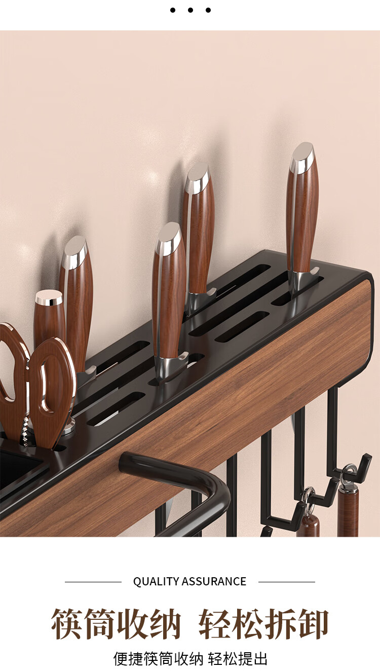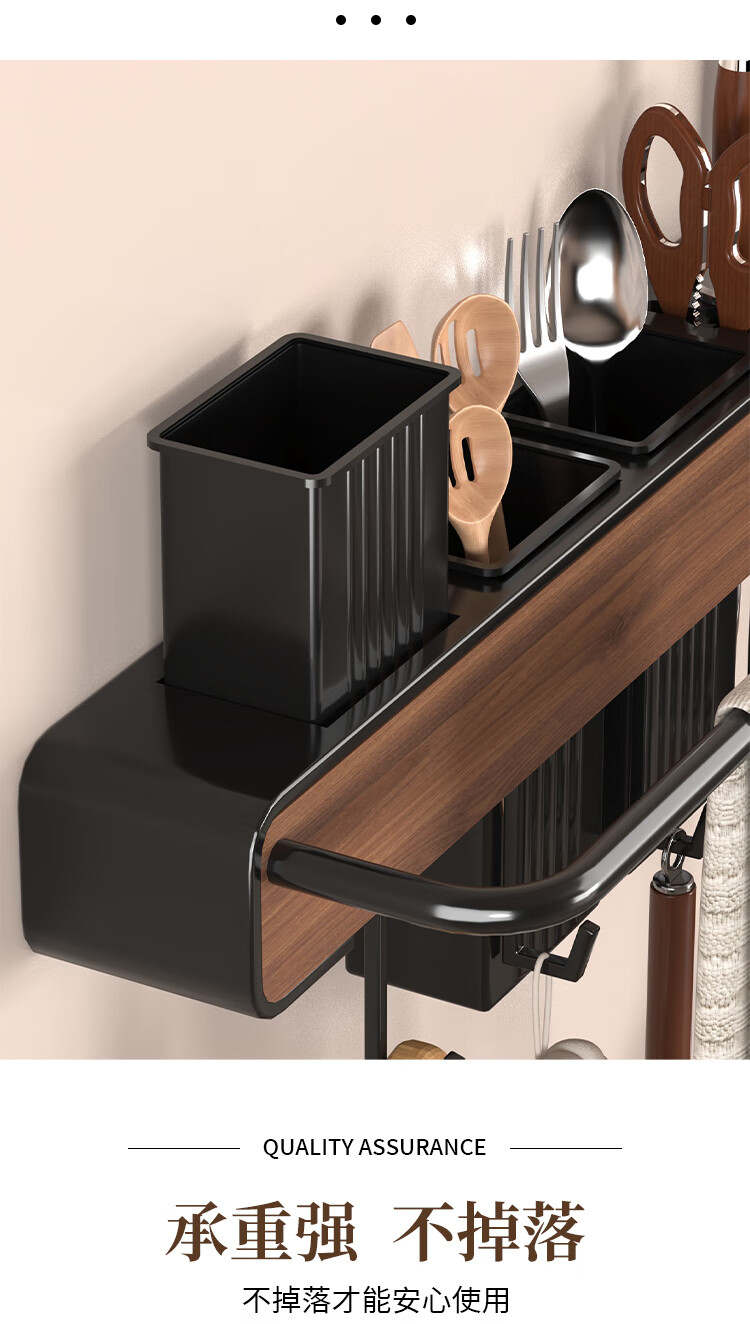 馨婺家厨房刀具置物架多功能免打孔壁挂式筷笼刀具一体锅铲勺筷子收纳架 黑色-长30cm【单杯无杆+6钩】