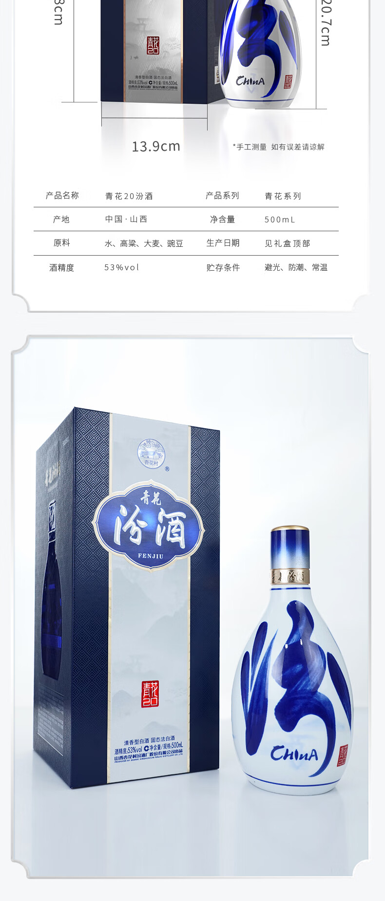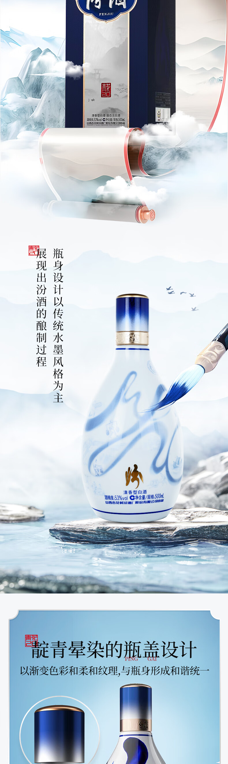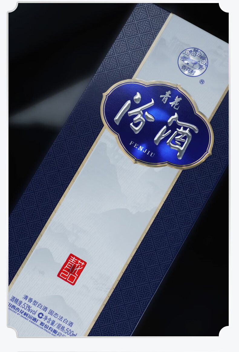 汾酒53度青花20汾酒 清香型白酒 商务宴请送礼白酒 喜宴 53度 500mL 6瓶 整箱【含3个手提袋】
