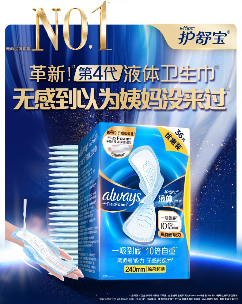 护舒宝[NO.1卫生巾]液体卫生巾日用240mm36片姨妈巾无感保护京东自营