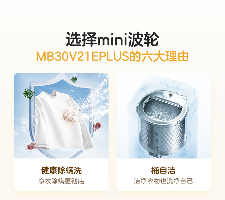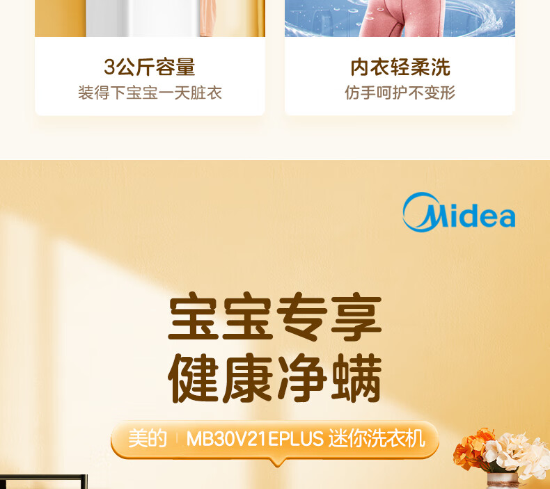 美的(Midea)婴儿洗衣机全自动 3公斤小型迷你波轮母婴儿童内衣裤袜洗衣机健康除螨洗 MB30V21EPLUS