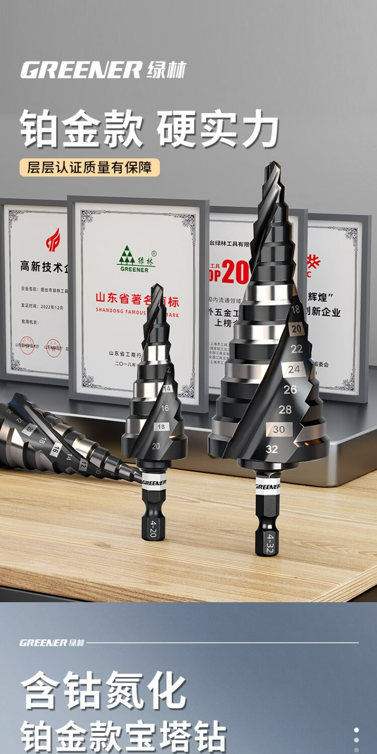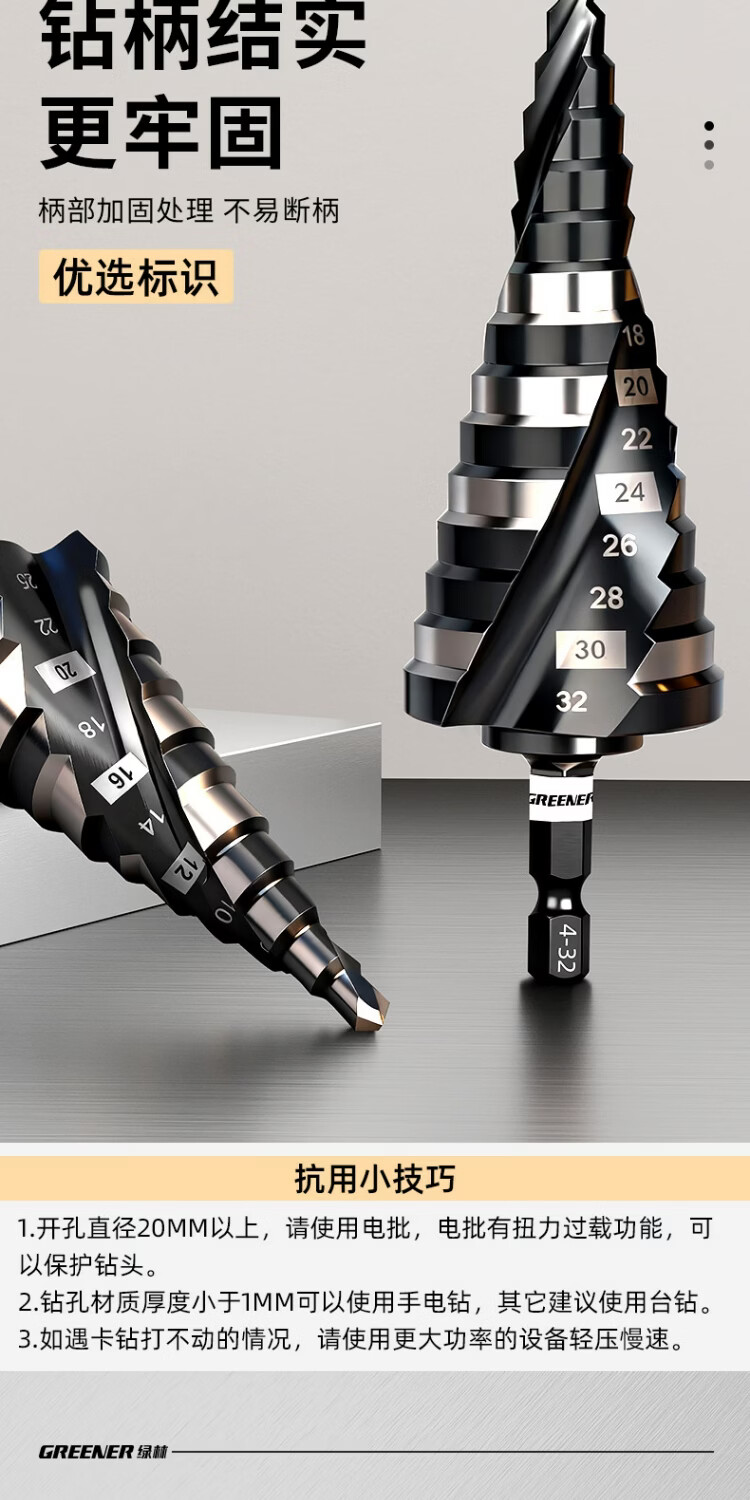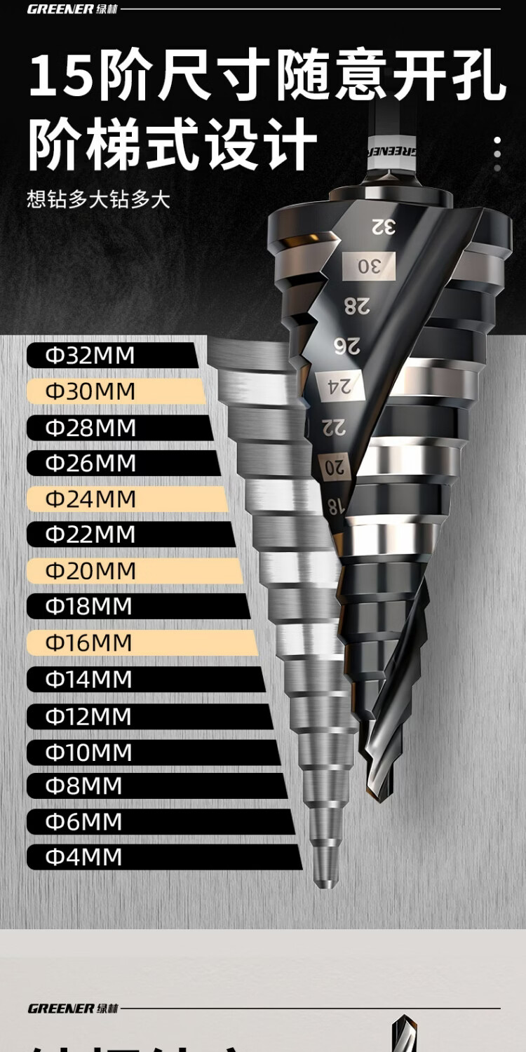 绿林高硬度宝塔钻头打孔开孔器金属扩孔锥形阶梯不锈钢专用手电钻 氮化含钴【4-12螺旋九阶】六角柄