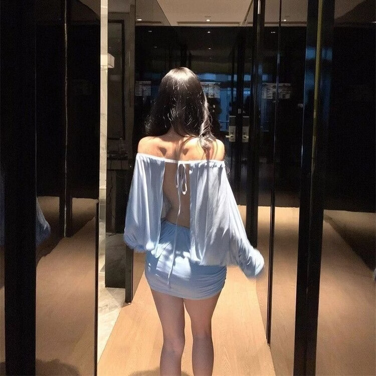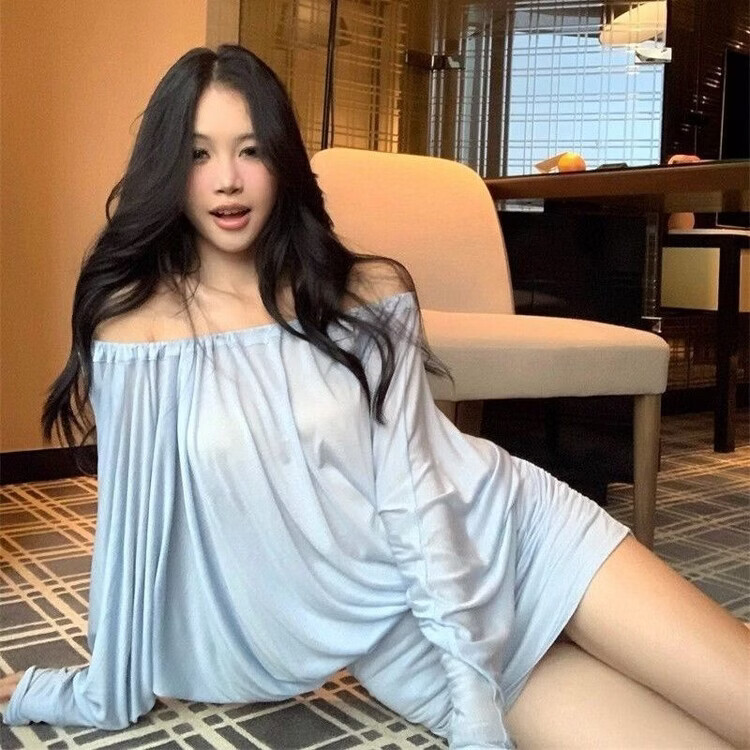 潮流韩版天丝连衣裙一字肩蝙蝠袖包臀裙简约通勤青春包臀短裙 蓝色(高品质) XL