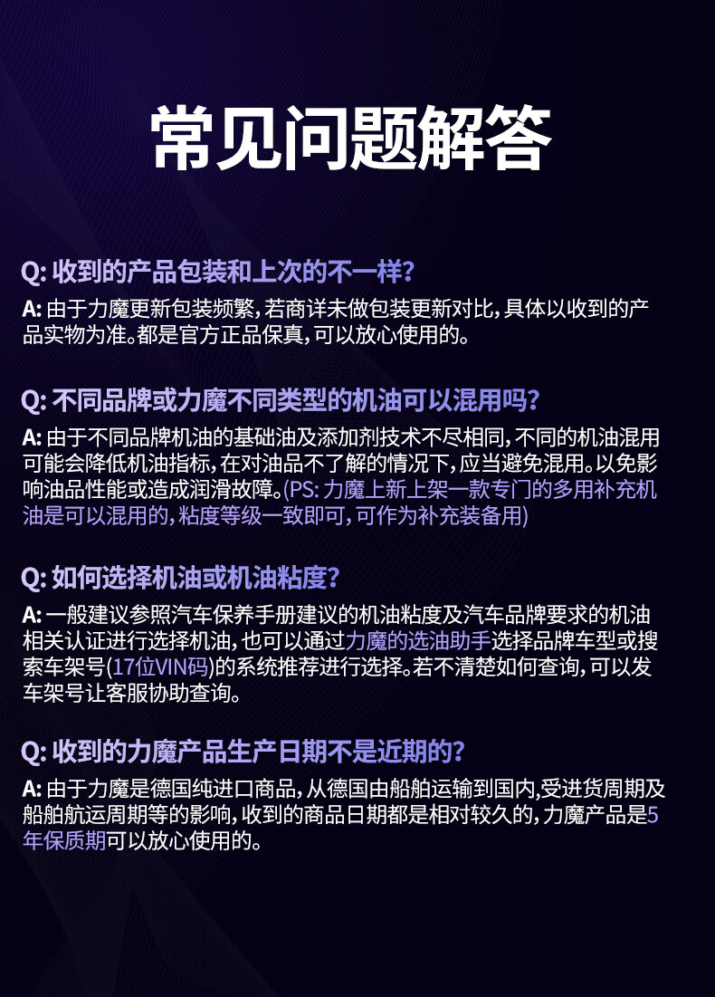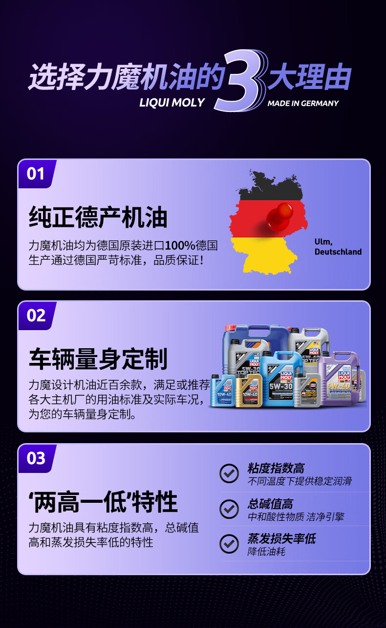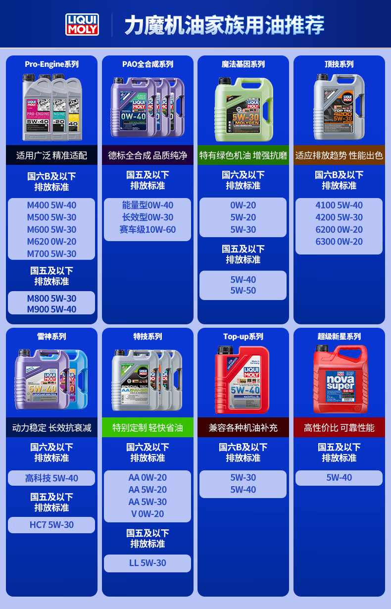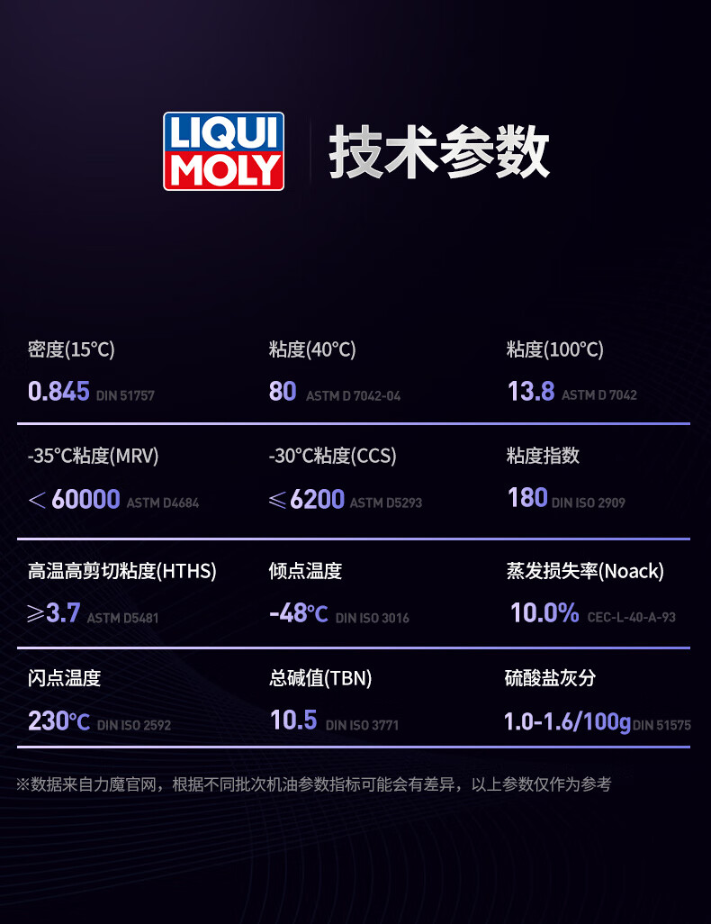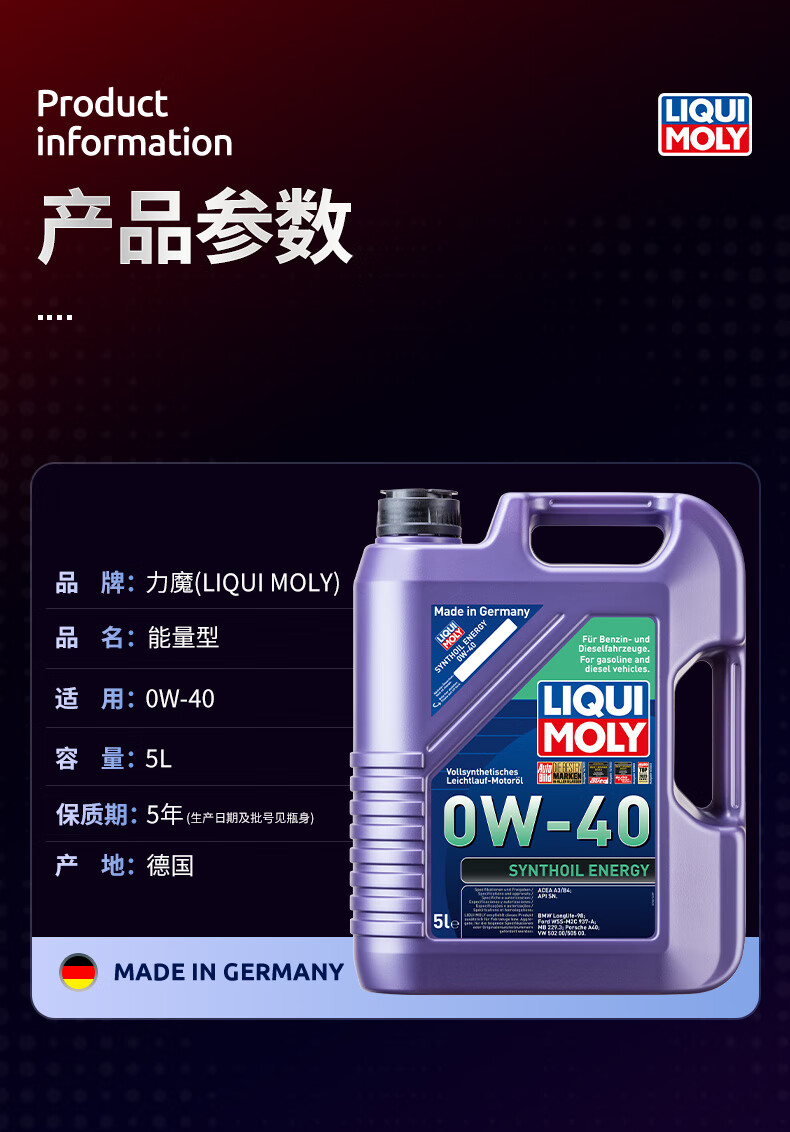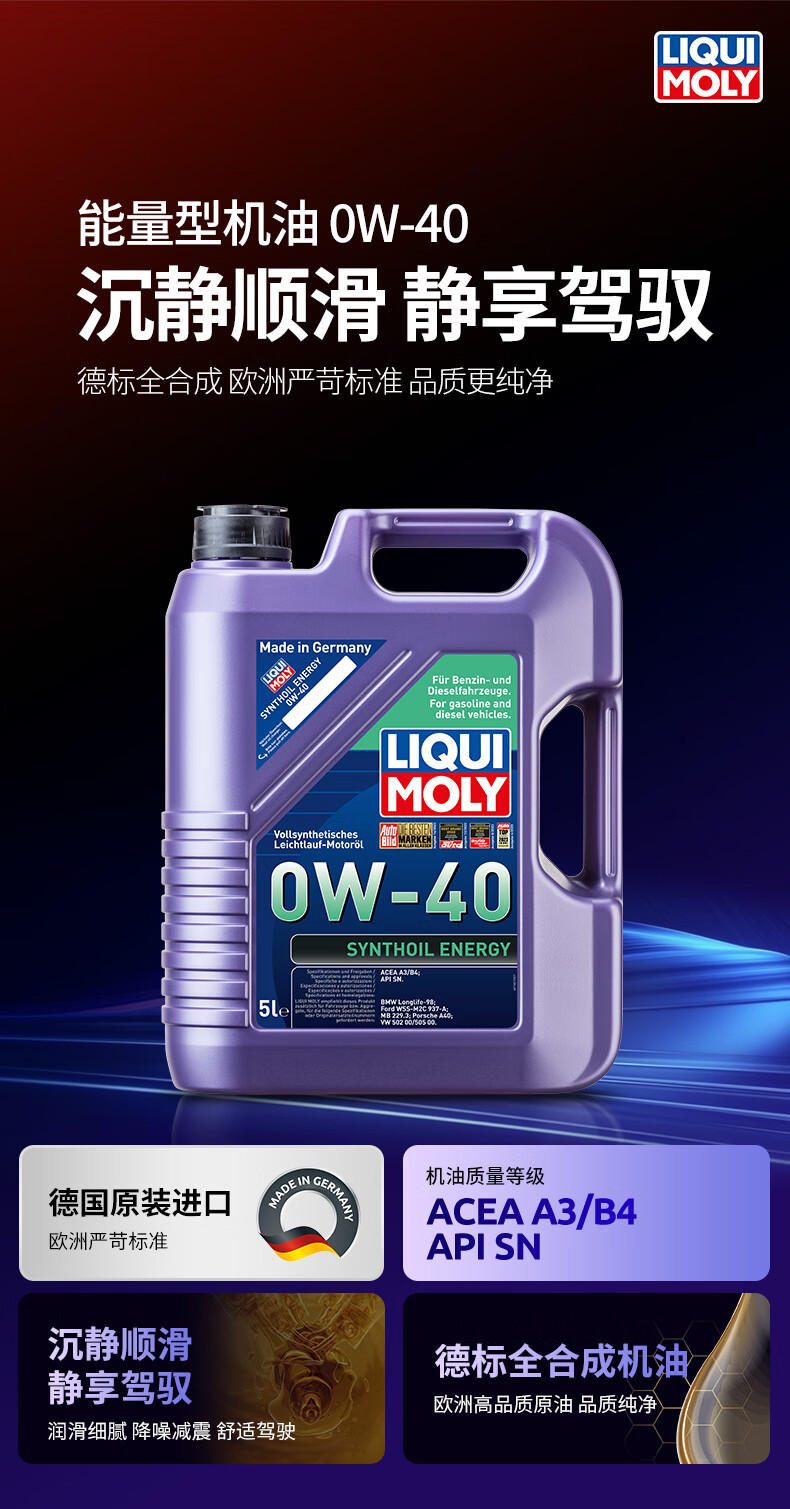 力魔(LIQUI MOLY)德国原装进口 能量型PAO全合成机油 0W-40 SN A3/B4级 5L