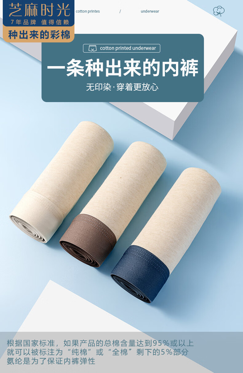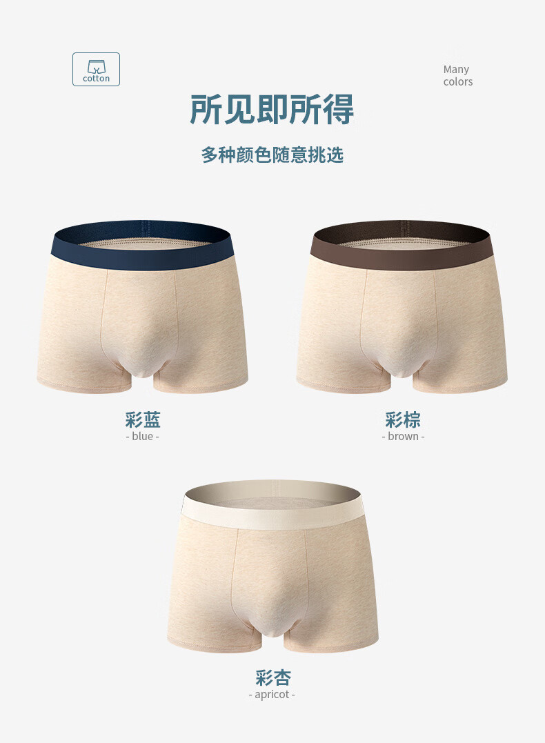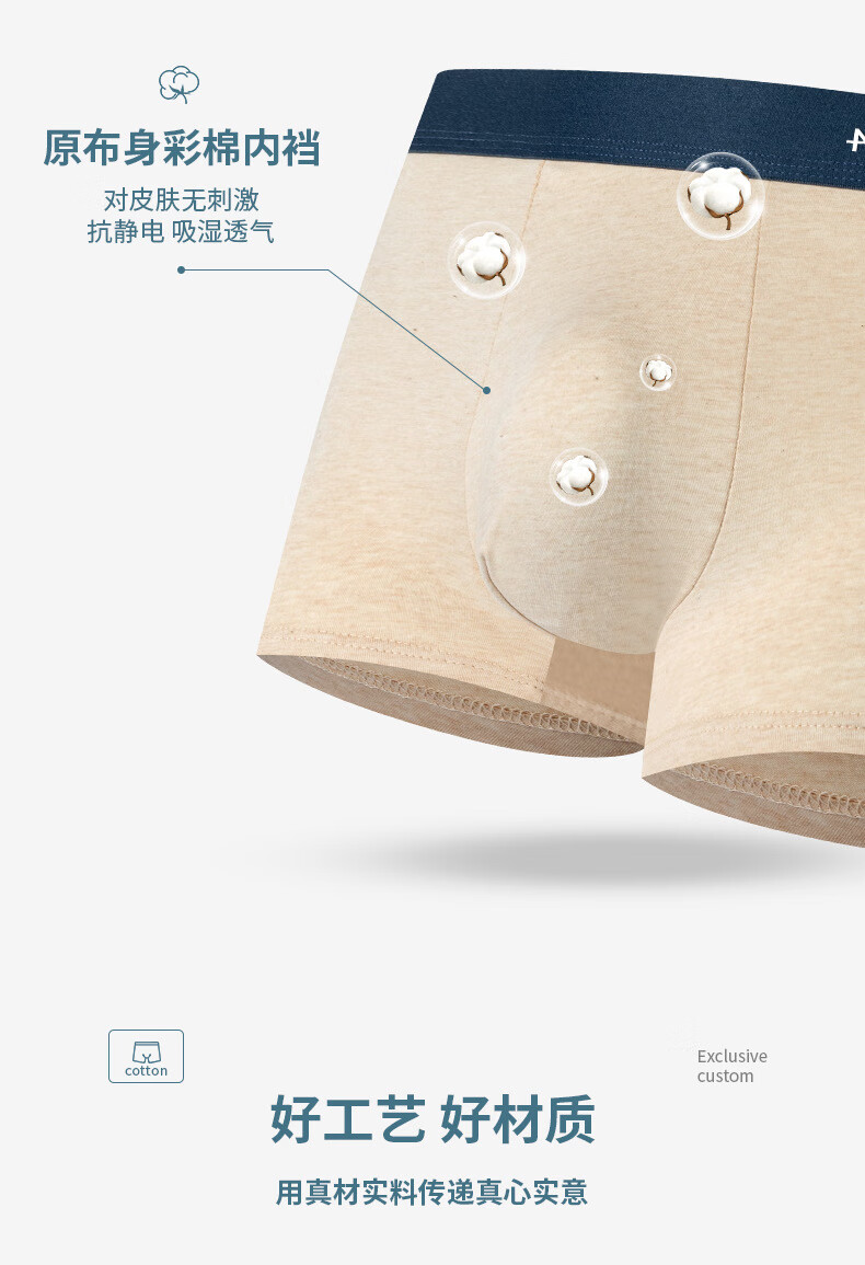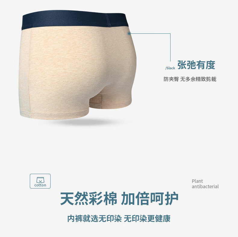 芝麻时光7A抗菌底档 彩棉内裤纯棉男内裤男全棉95%棉短裤衩四角裤正品 xL码100-120斤拍1发3包含赠共3条