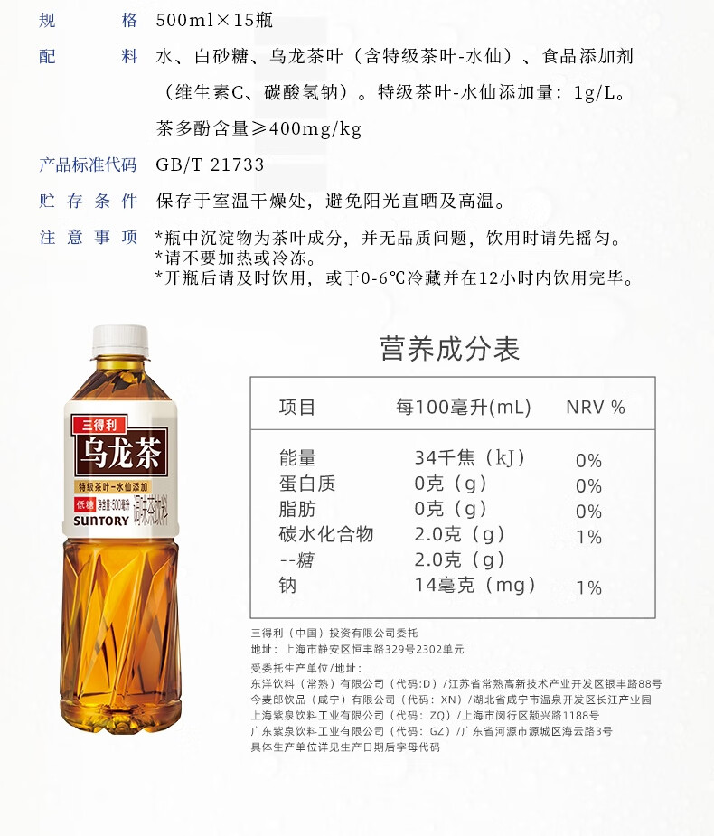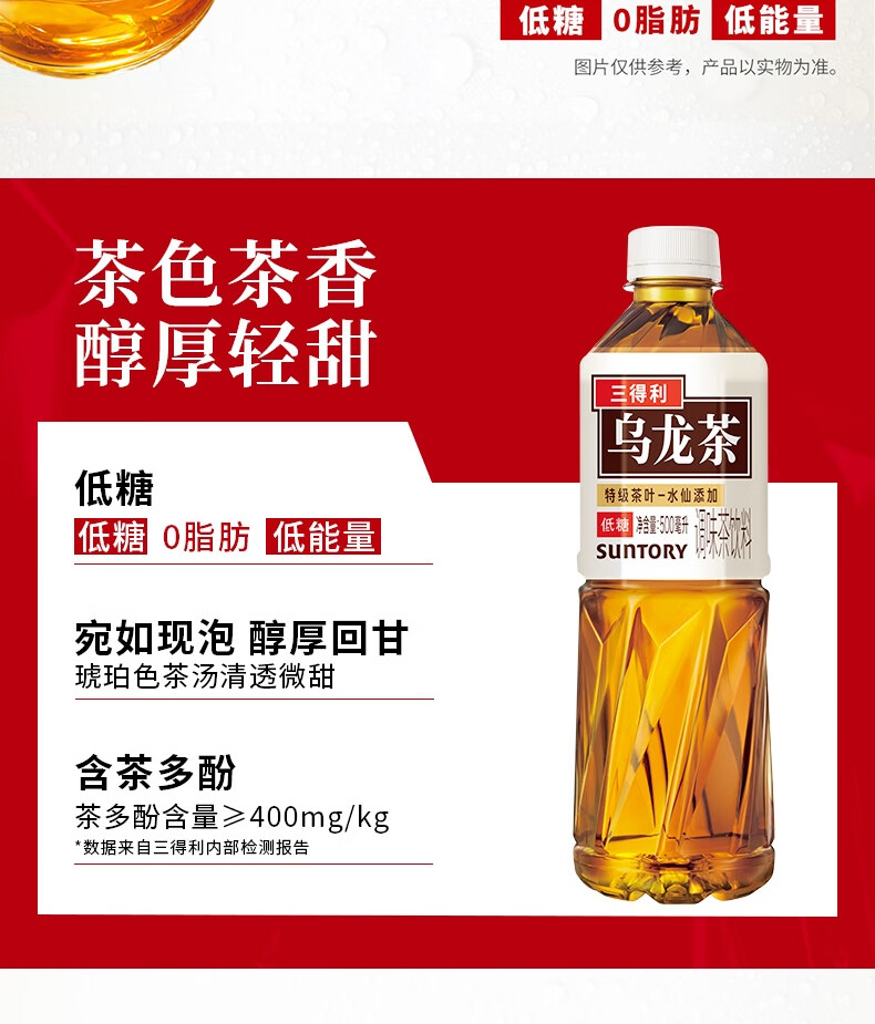 三得利 低糖乌龙茶饮料500ml*15瓶整箱装