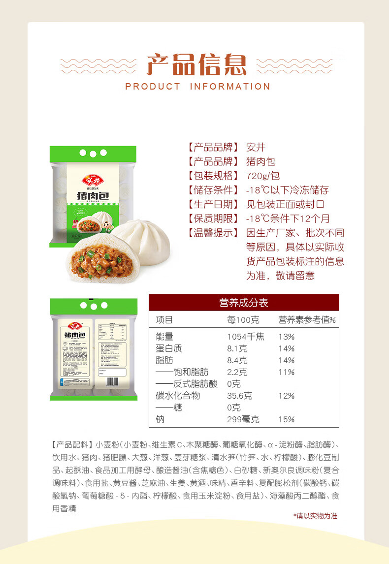 安井猪肉包 720g /袋 约24个 家庭装包子早餐 速冻面点早点半成品