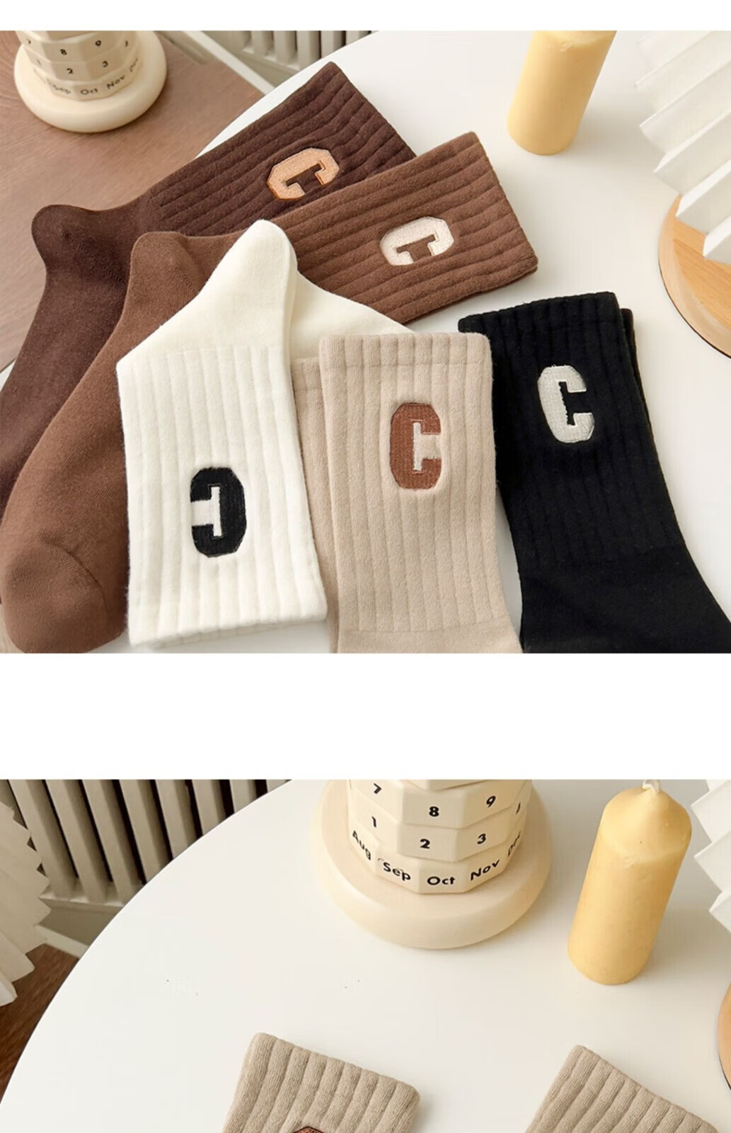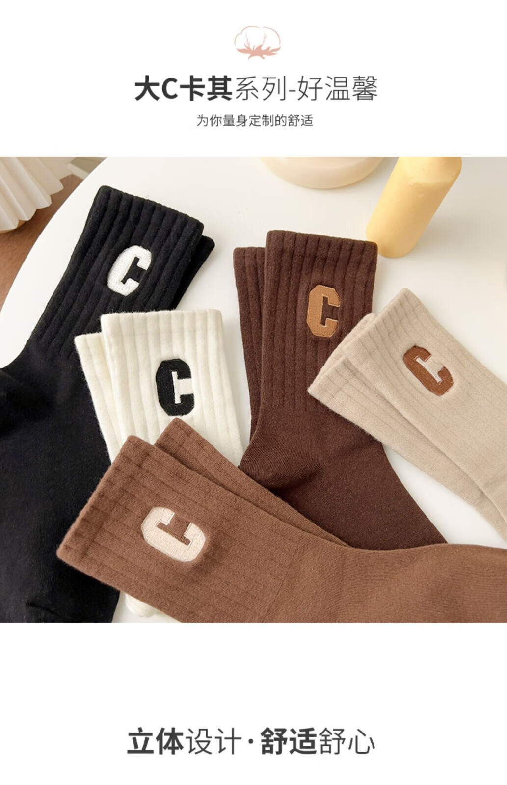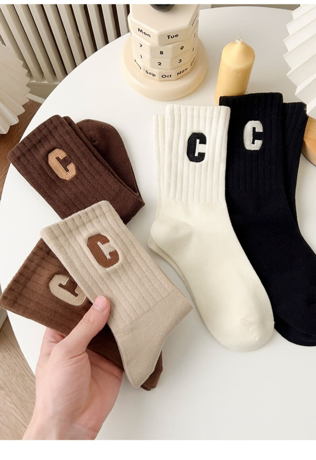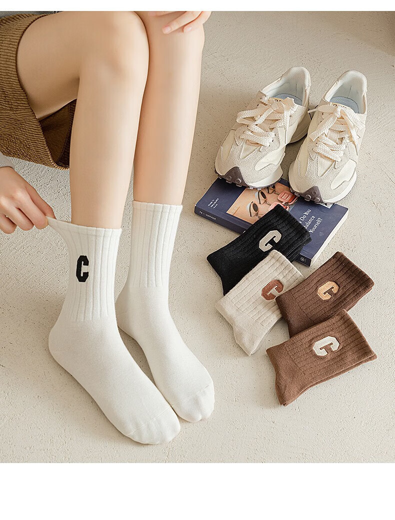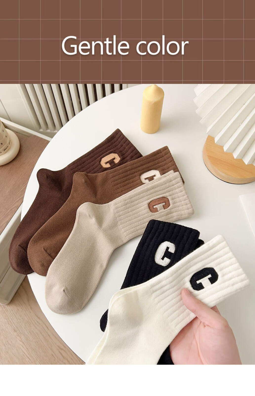 雅鹿女士中筒袜百搭简约春秋薄款韩版时尚长袜学生少女生休闲大C袜子 颜色混搭 5双 均码