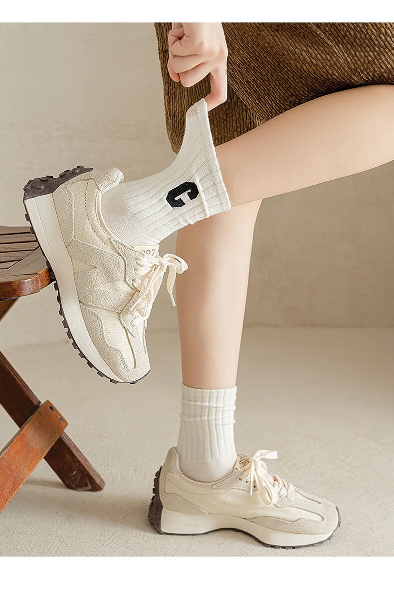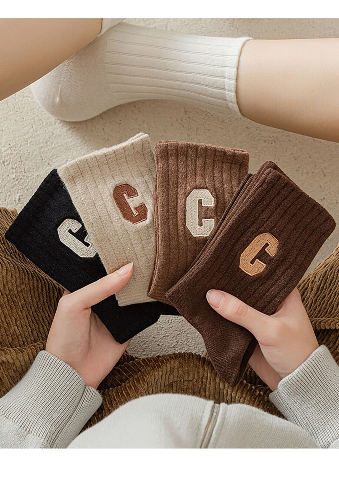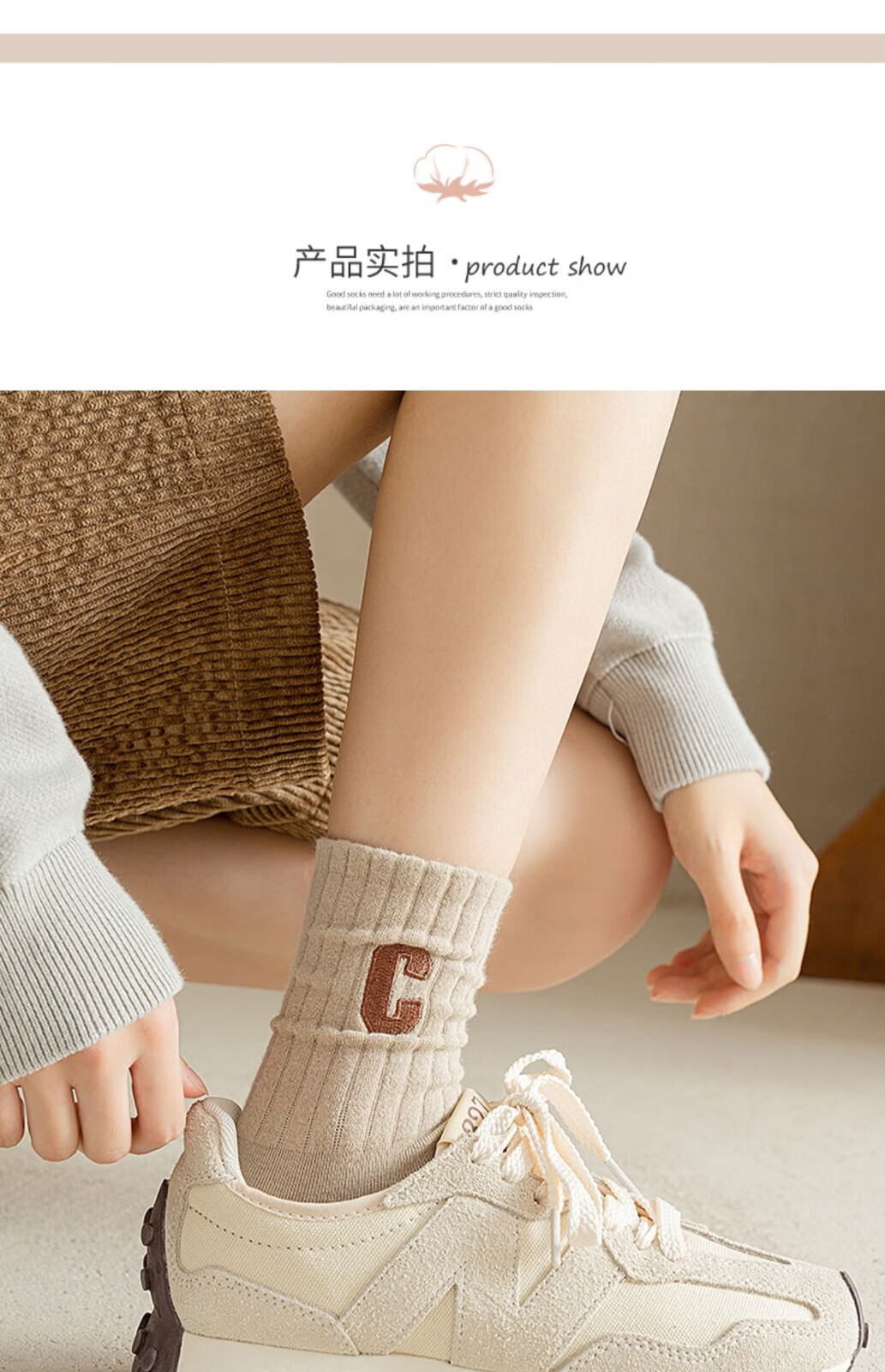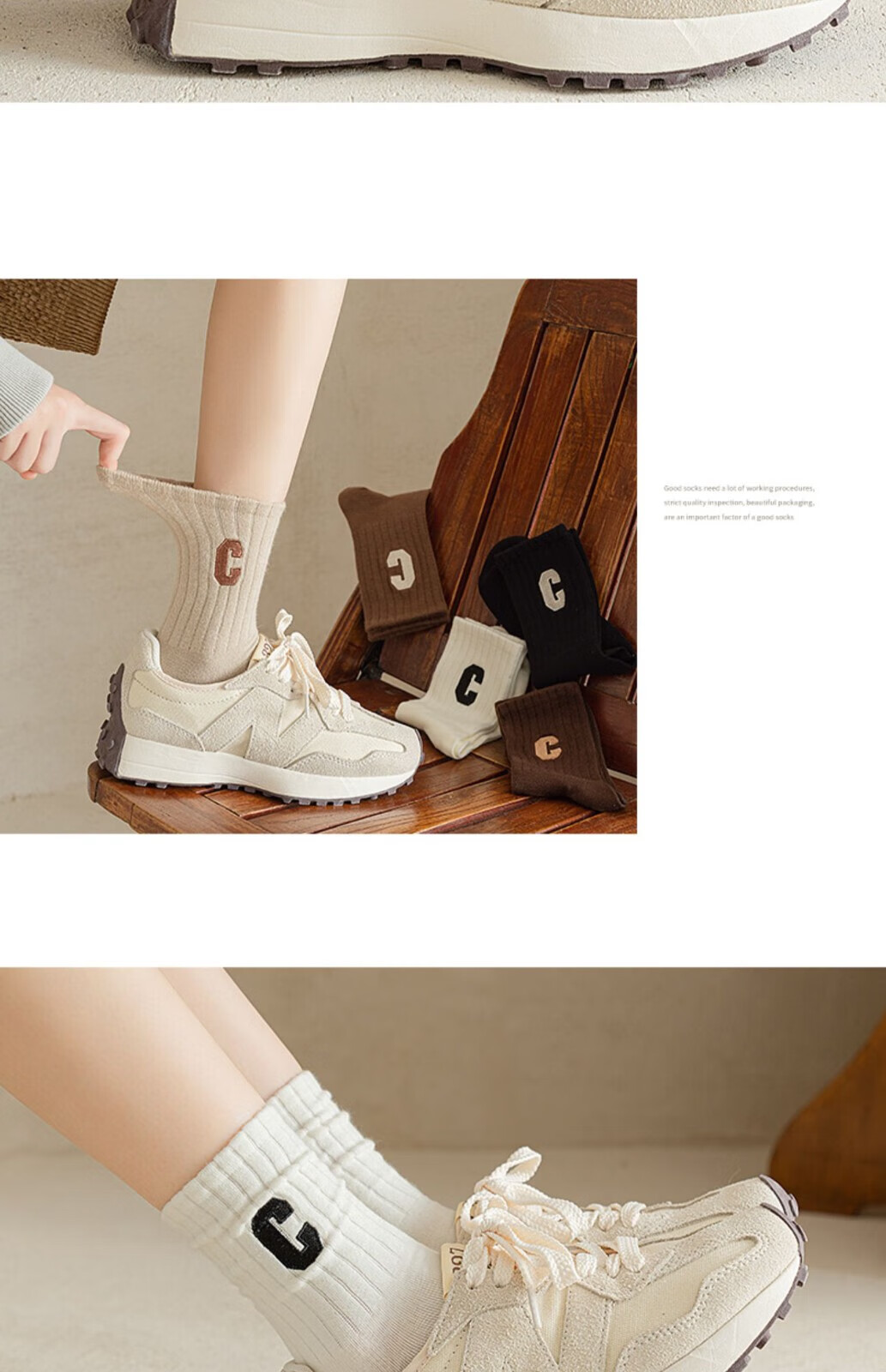 雅鹿女士中筒袜百搭简约春秋薄款韩版时尚长袜学生少女生休闲大C袜子 颜色混搭 5双 均码