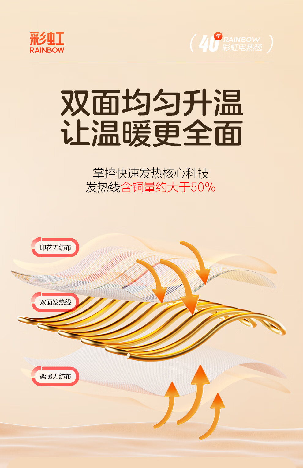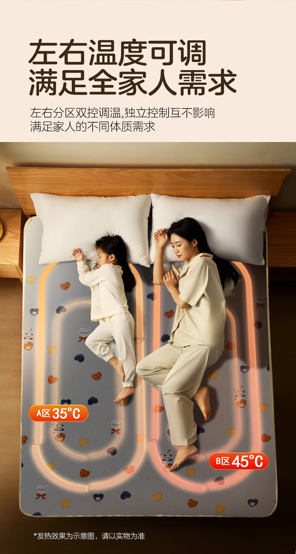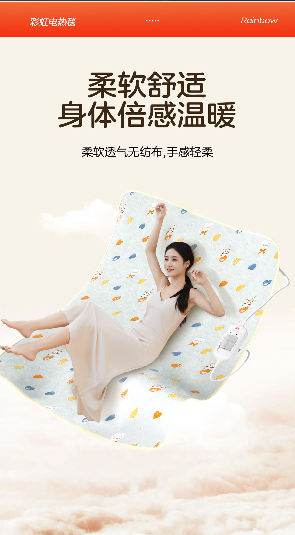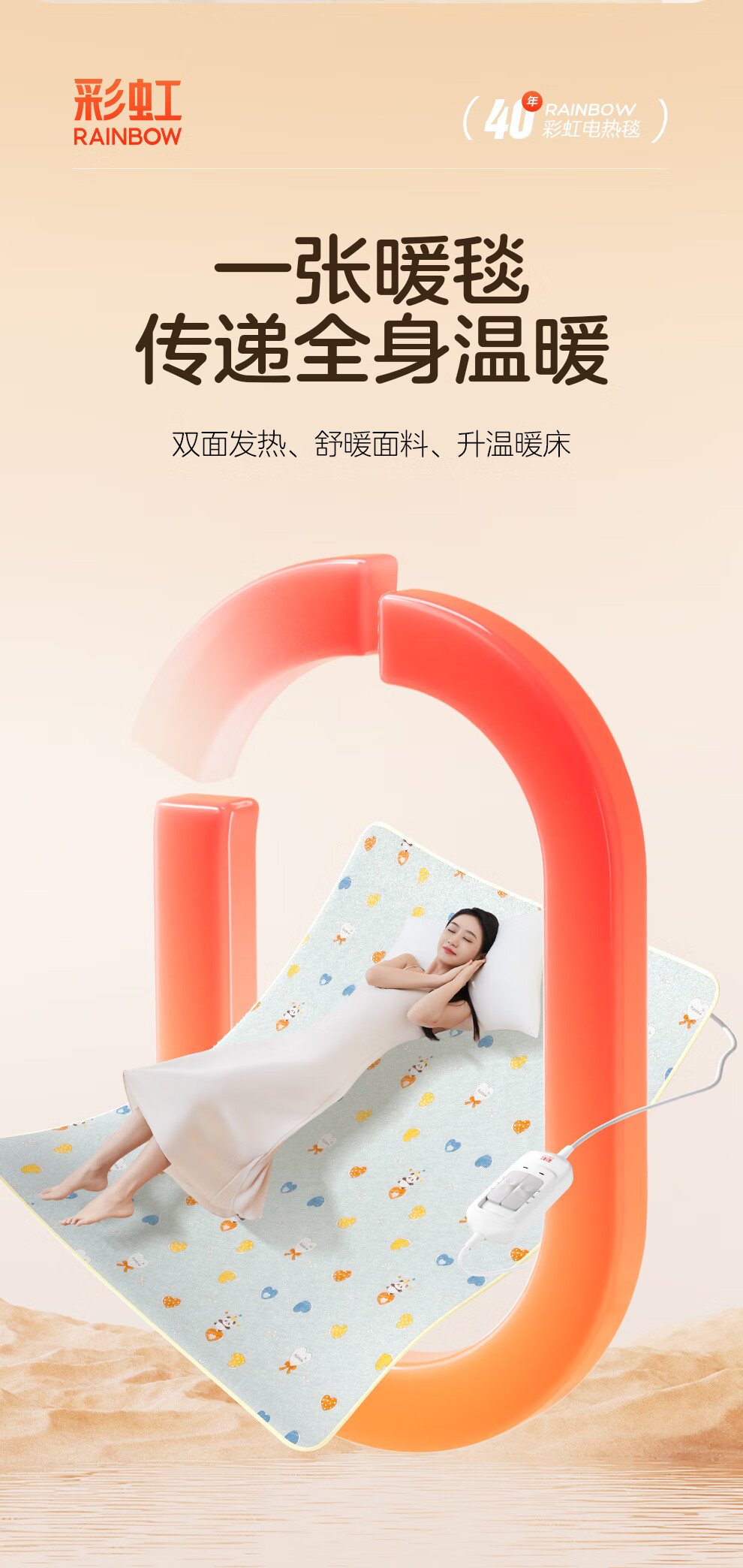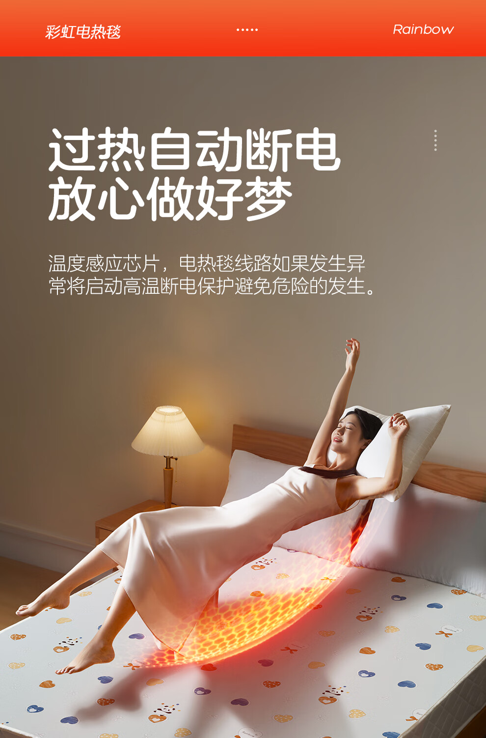彩虹(RAINBOW) 电热毯单/双人调温/定时除螨电褥子多重自动断电保护排潮除湿 双控调温 长2.0米宽1.8米 无纺布