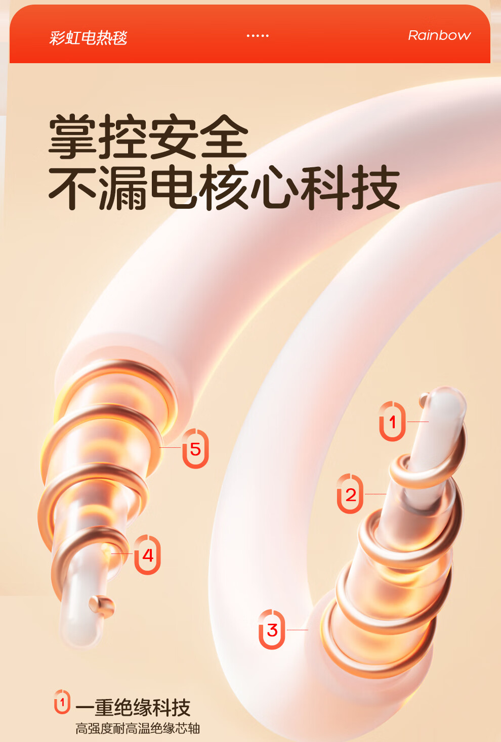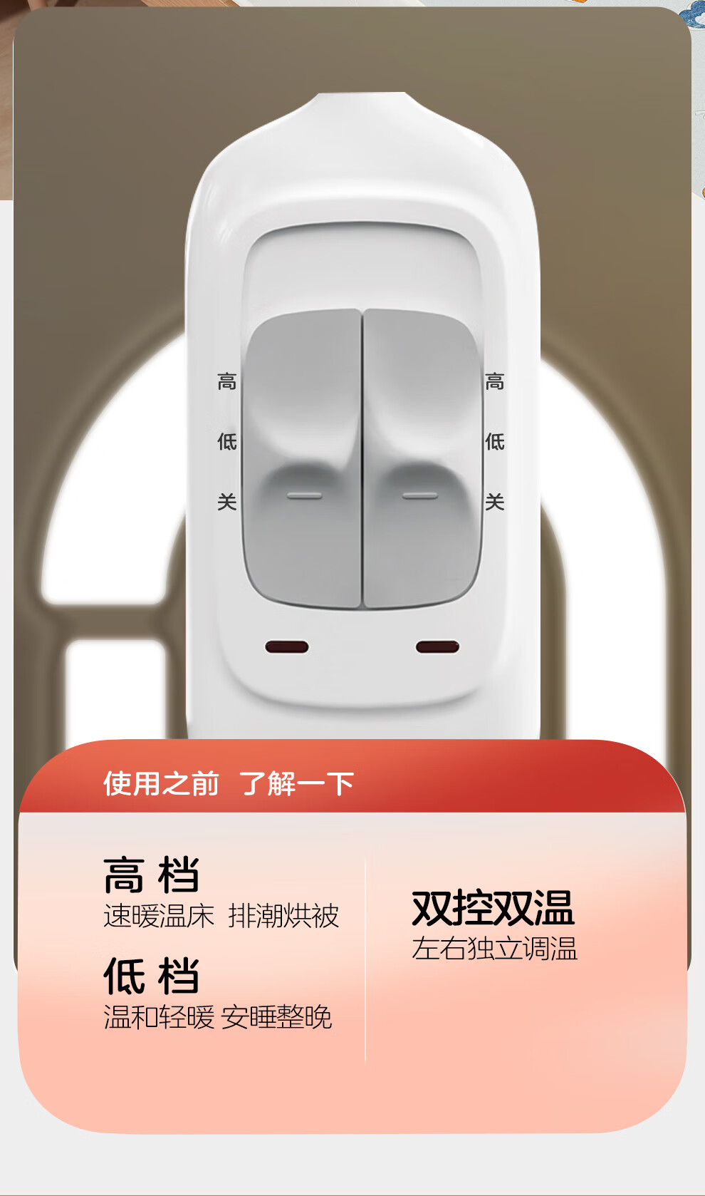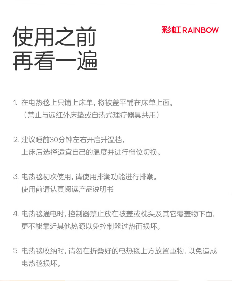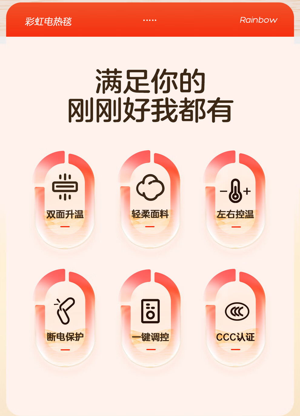 彩虹(RAINBOW) 电热毯单/双人调温/定时除螨电褥子多重自动断电保护排潮除湿 双控调温 长2.0米宽1.8米 无纺布