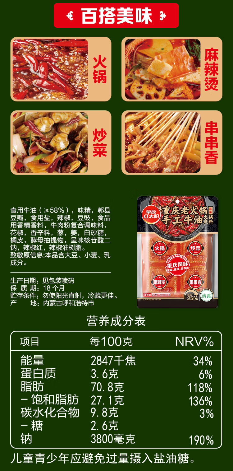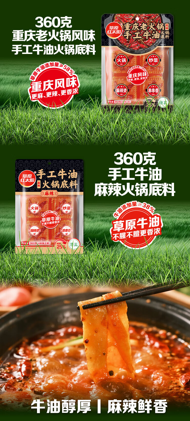 草原红太阳360g牛油火锅底料手工麻辣重庆麻辣烫麻辣香锅调味料 【草原牛油量≥58%更香】360g重庆老火锅手工牛油底料