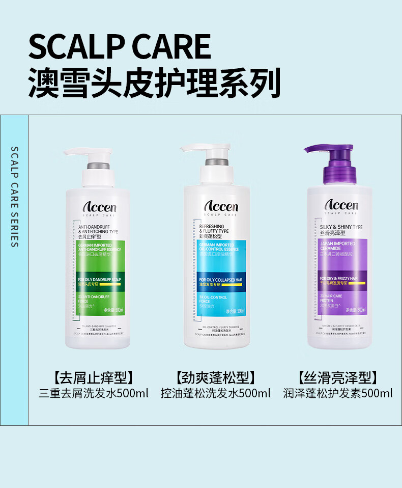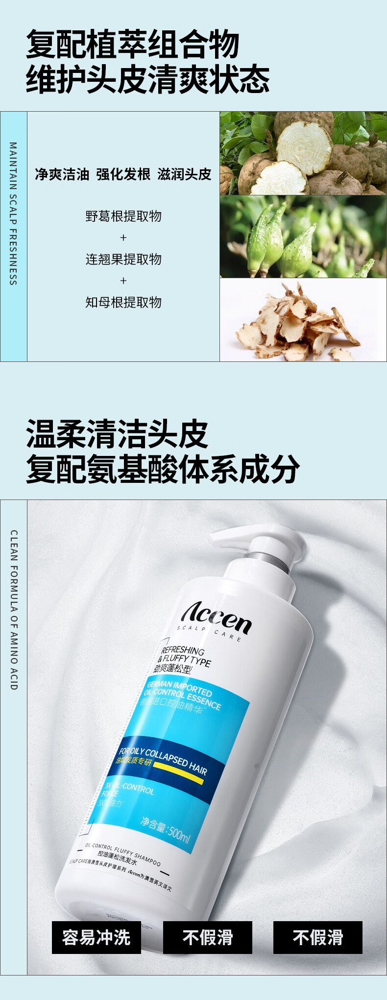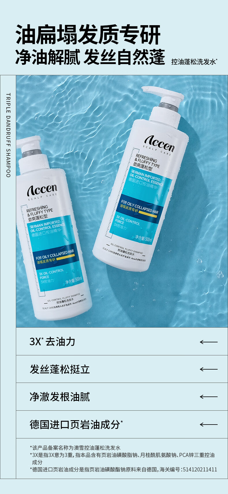 澳雪(accen)三重控油劲爽蓬松清洁头皮洗发水 500ml控油蓬松洗发水