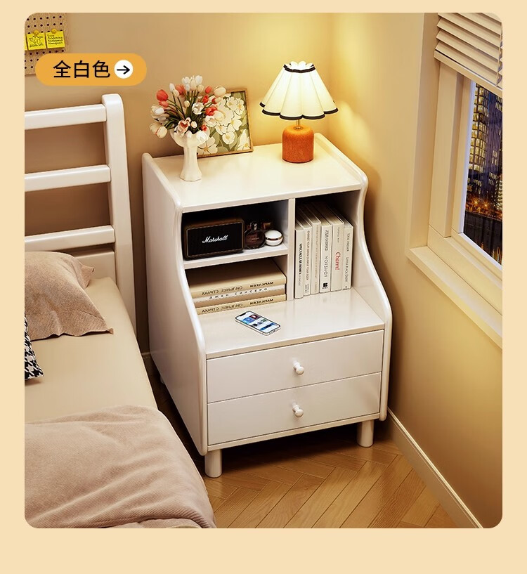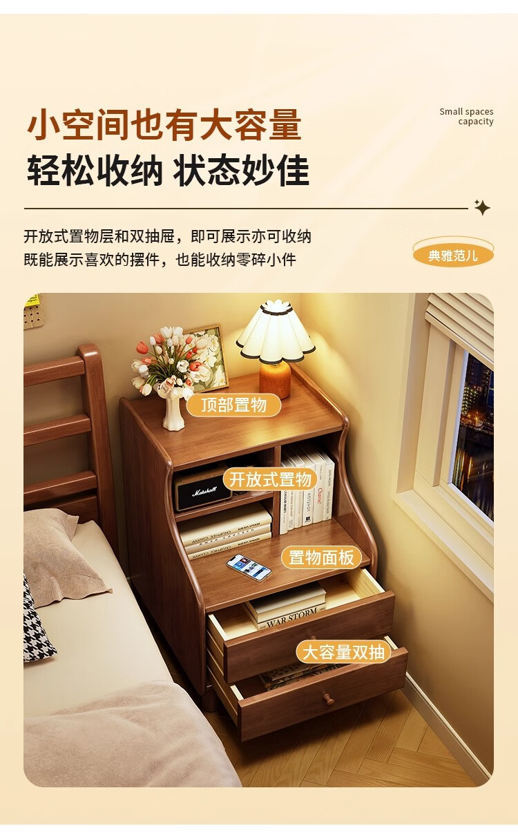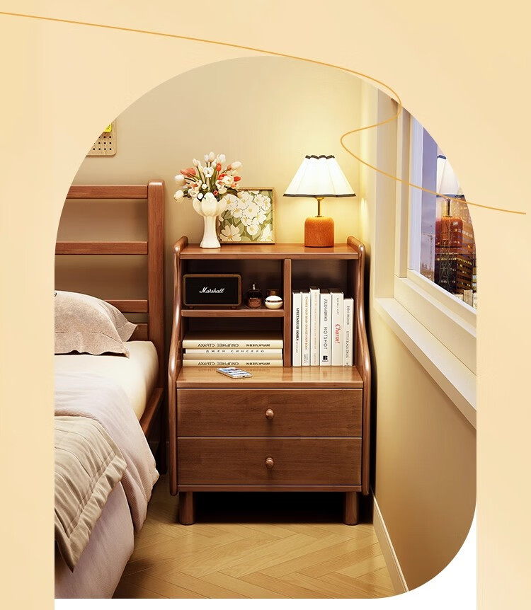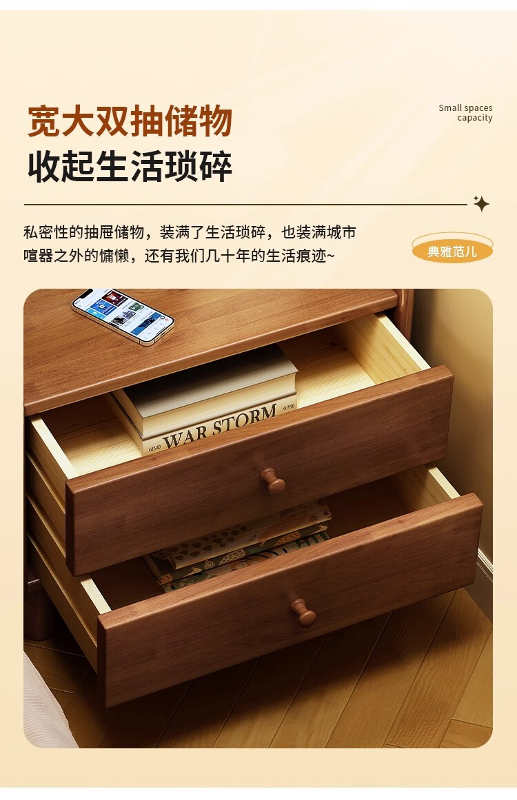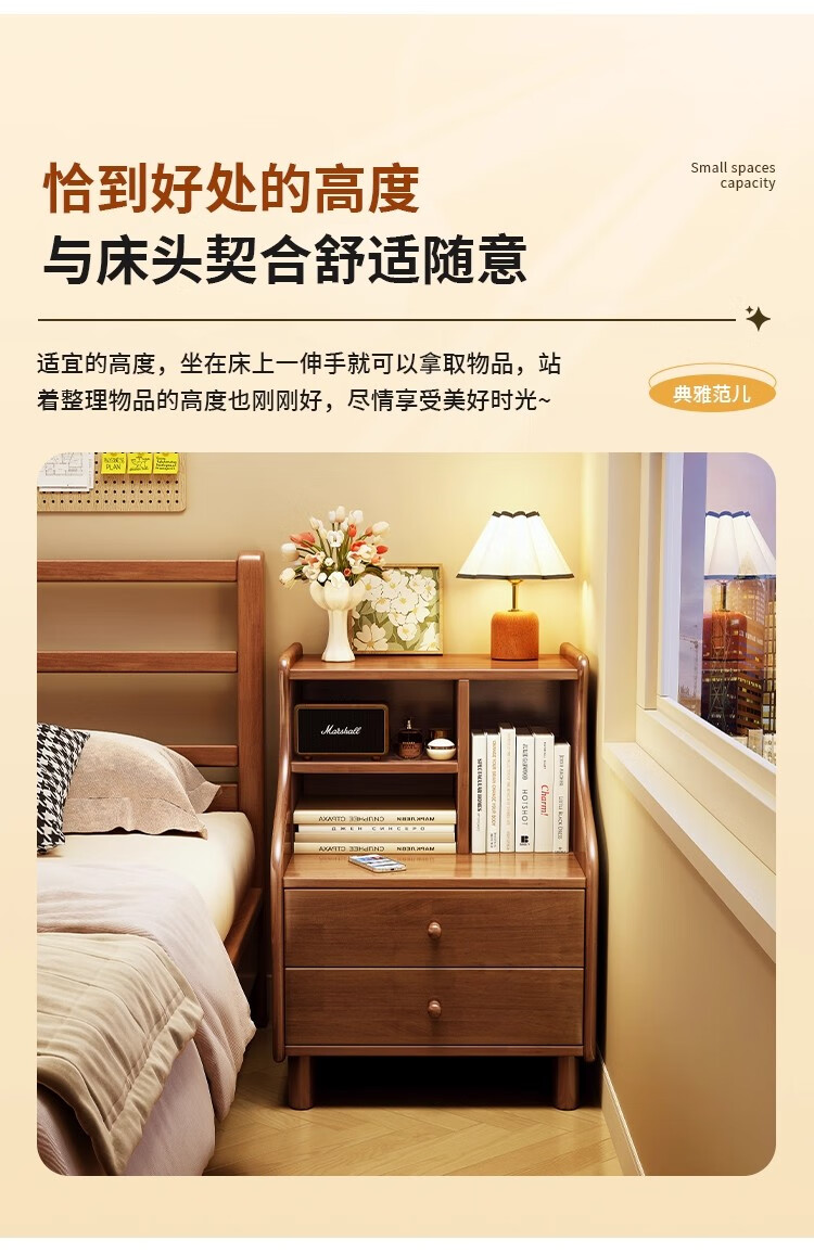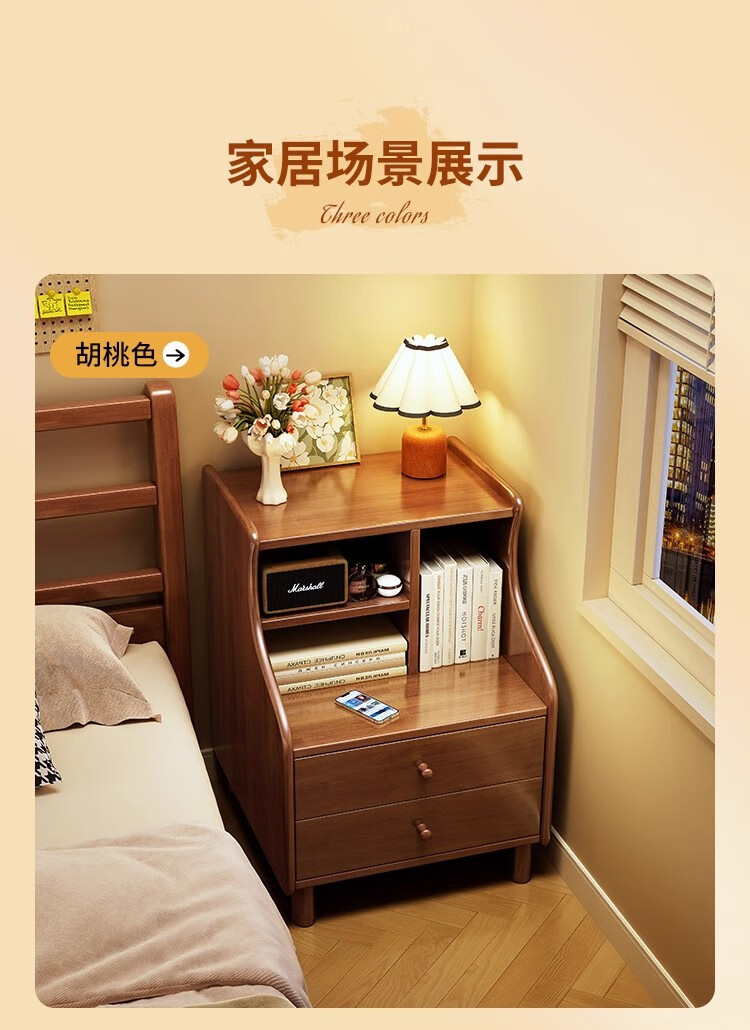 芈迪实木床头柜白色简约家用小型储物收纳柜卧室夹缝儿童床边柜置物架 胡桃色床头柜 双抽