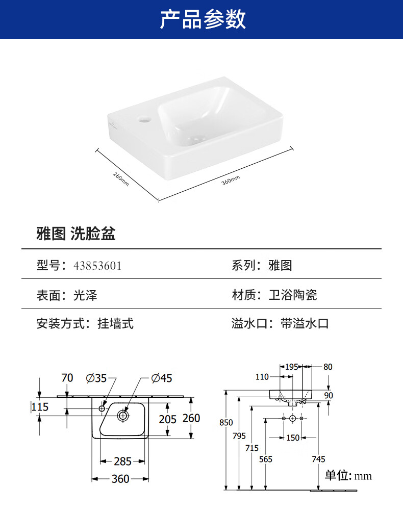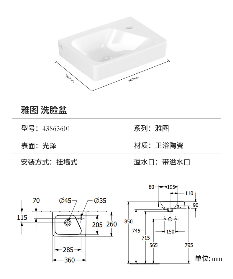 德国唯宝(Villeroy&Boch)陶瓷台盆雅图系列小型洗手盆挂墙盆可做台上盆儿童洗手盆 右型挂墙盆