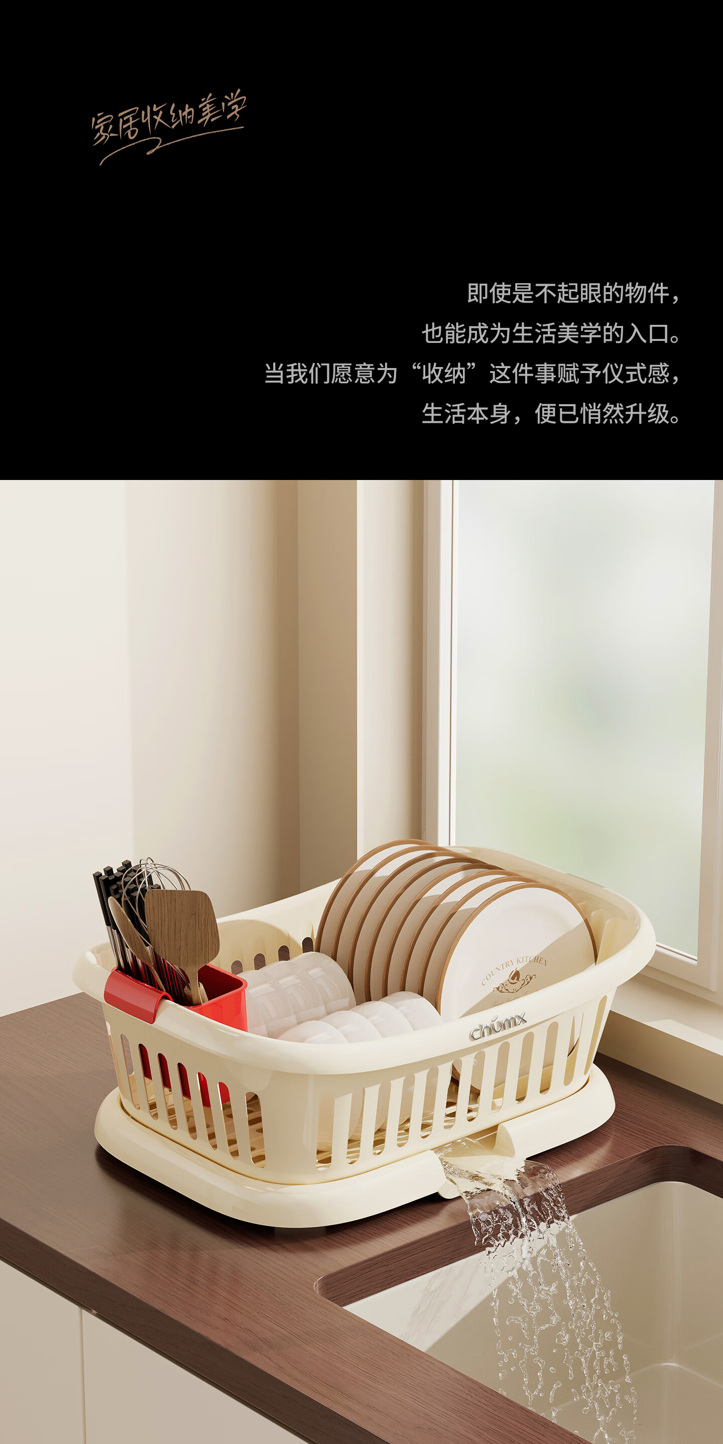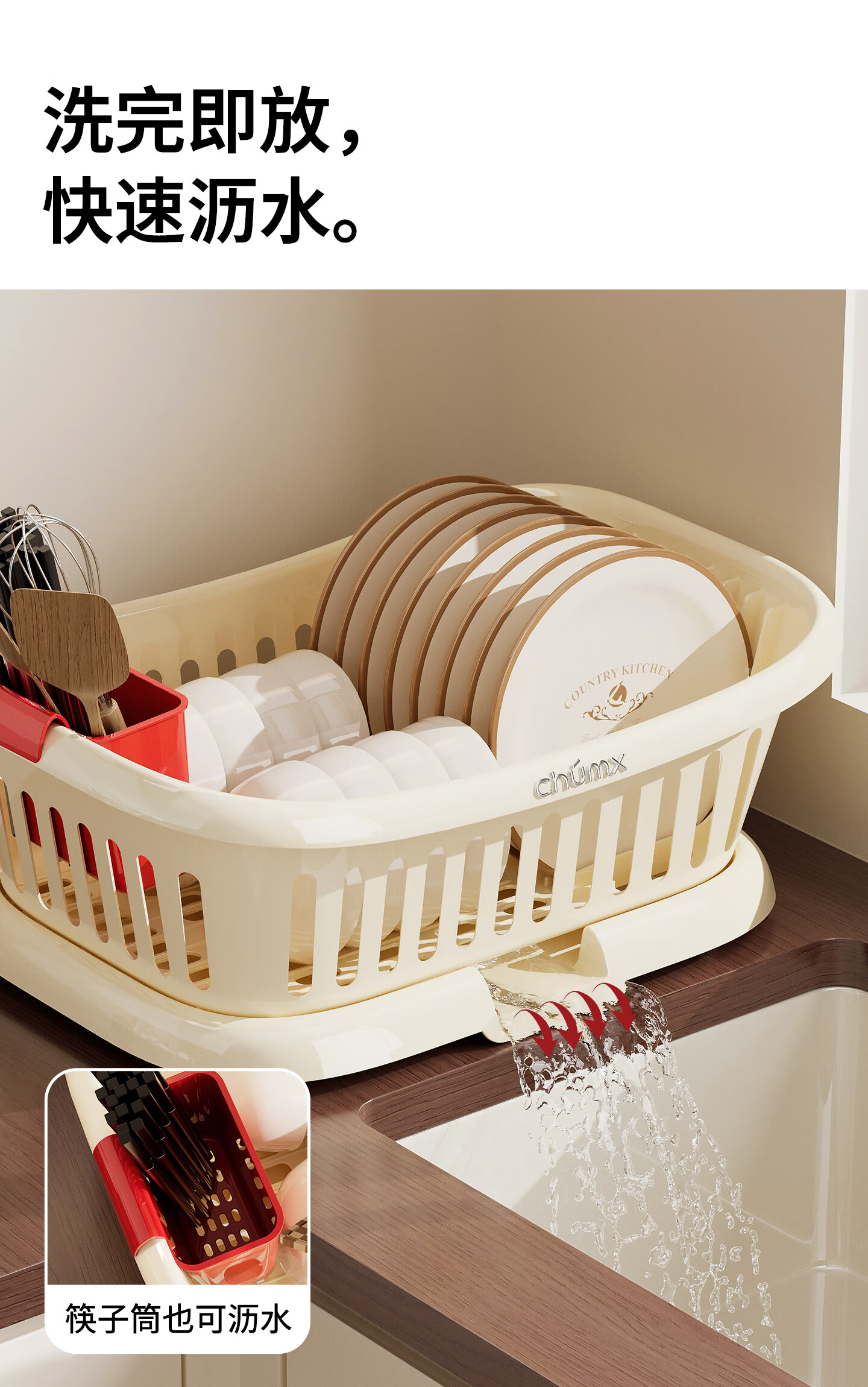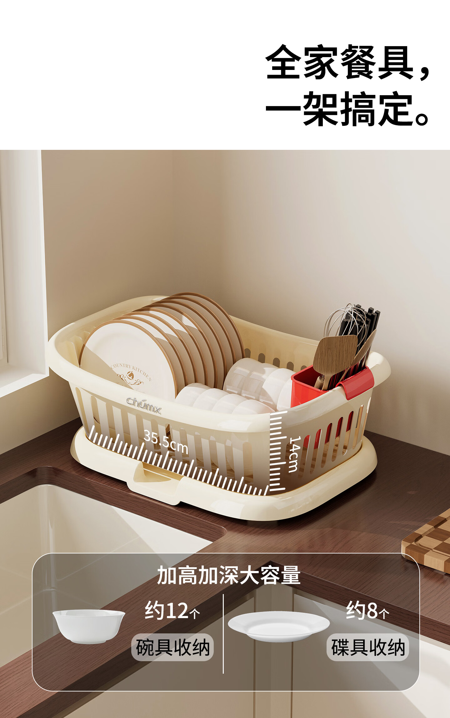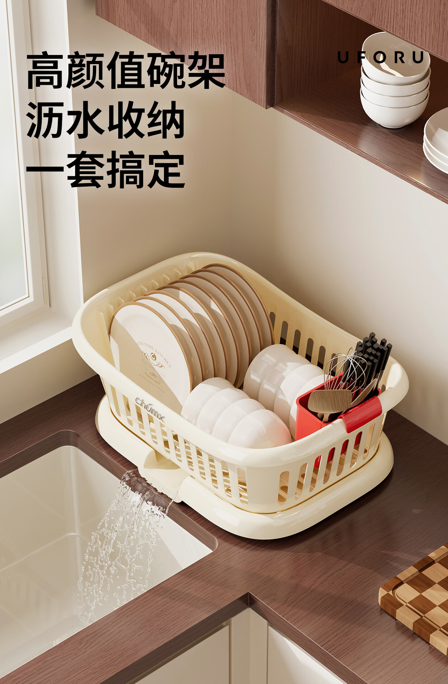 橱明星碗筷收纳盒塑料沥水篮厨房家用带盖多功能放碗碟盘碗柜餐具收纳架 沥水碗架-优雅白