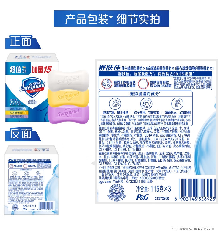 舒肤佳香皂115g*3块皂(纯白+柠檬+薰衣草)99.9%除菌沐浴皂 新旧包装随机