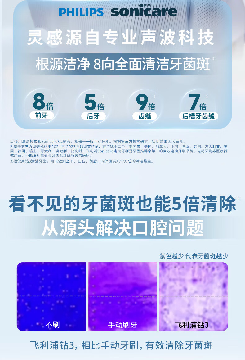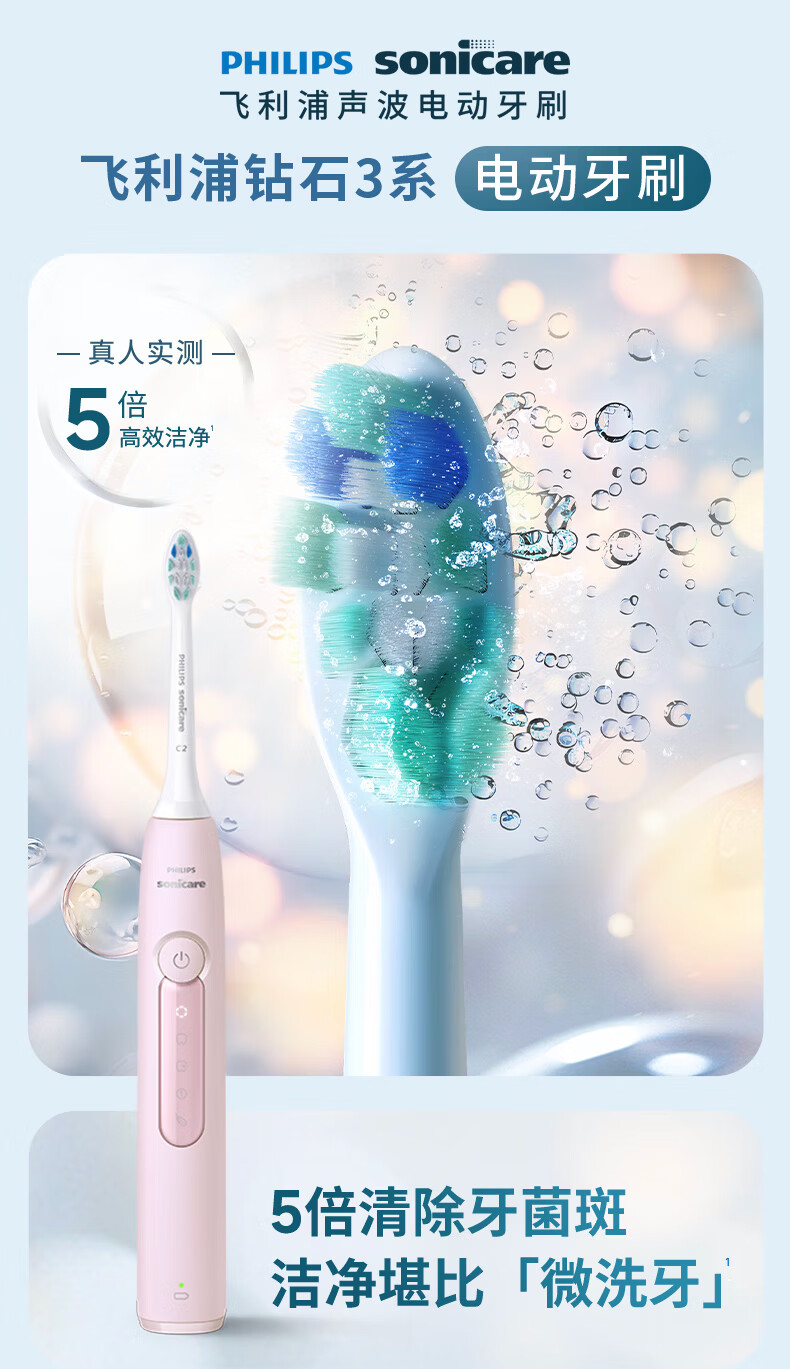 飞利浦(PHILIPS)【肖战推荐】声波电动牙刷钻石3系 年货节礼物 情人节情侣送男生/女友 微泡水流 HX5171/04淡粉色