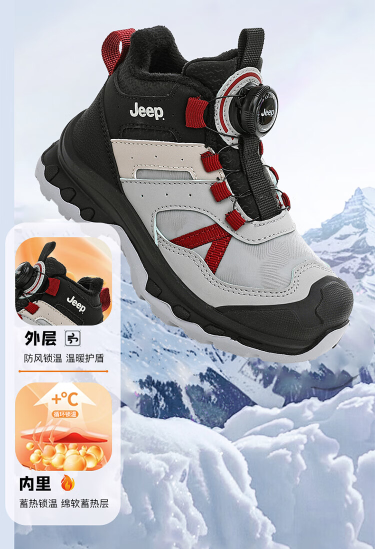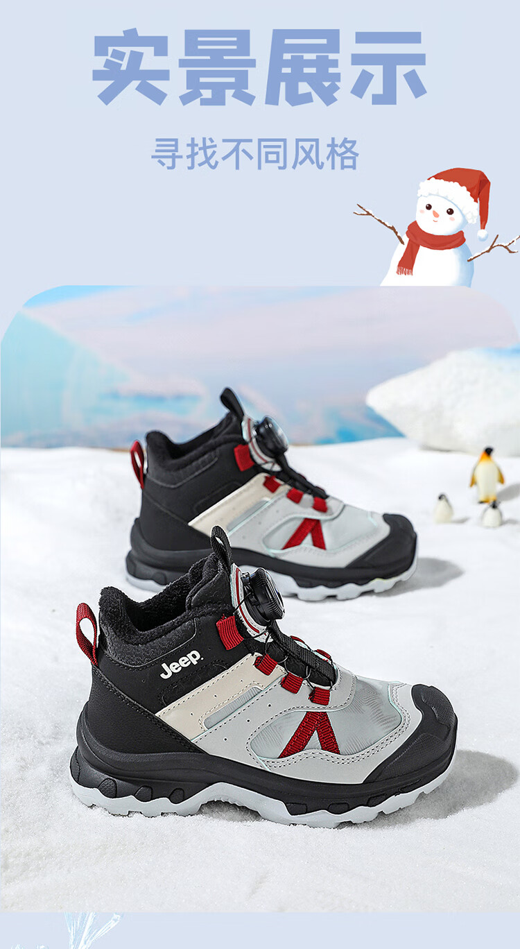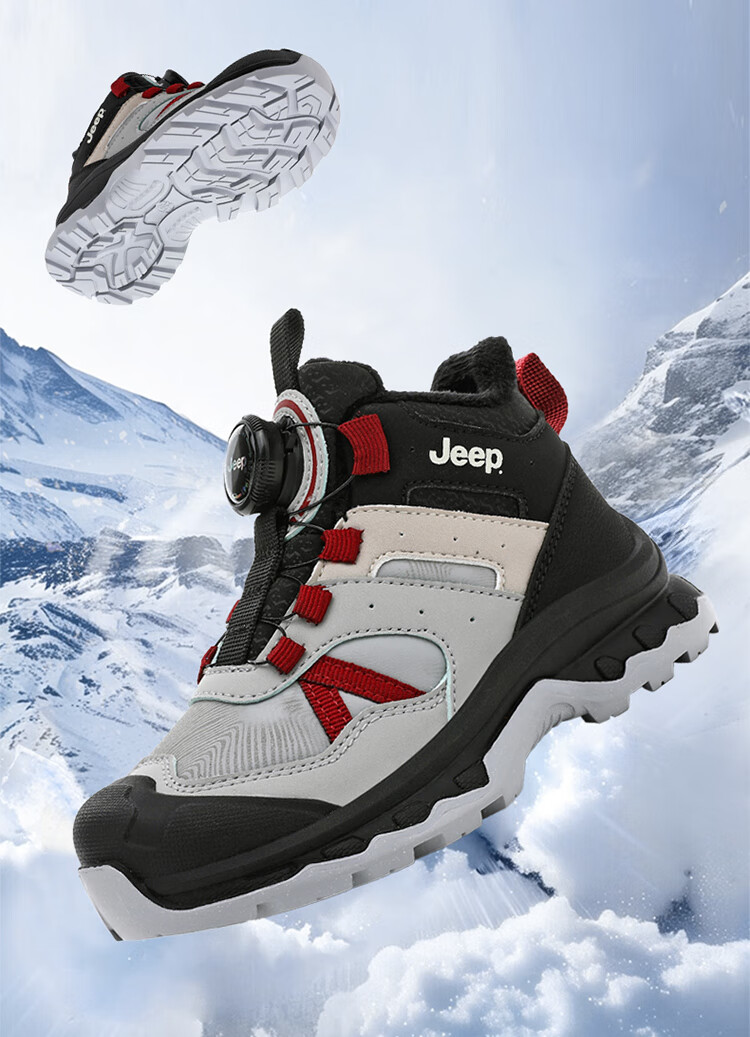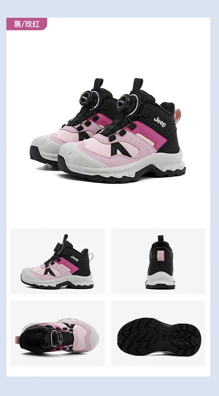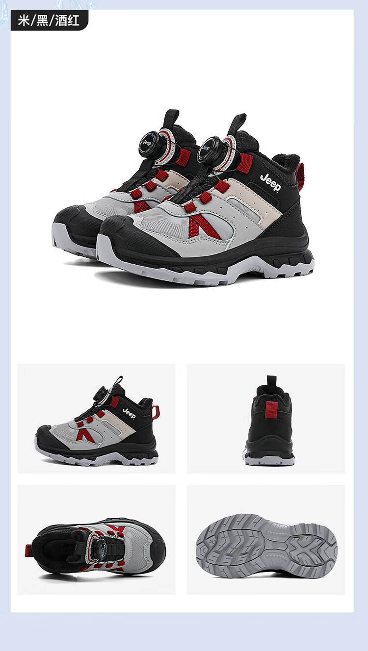 JEEP儿童加绒运动鞋男童女童登山鞋2025秋冬新款跑步鞋 米/黑/酒红 35