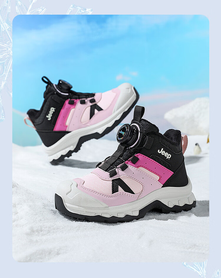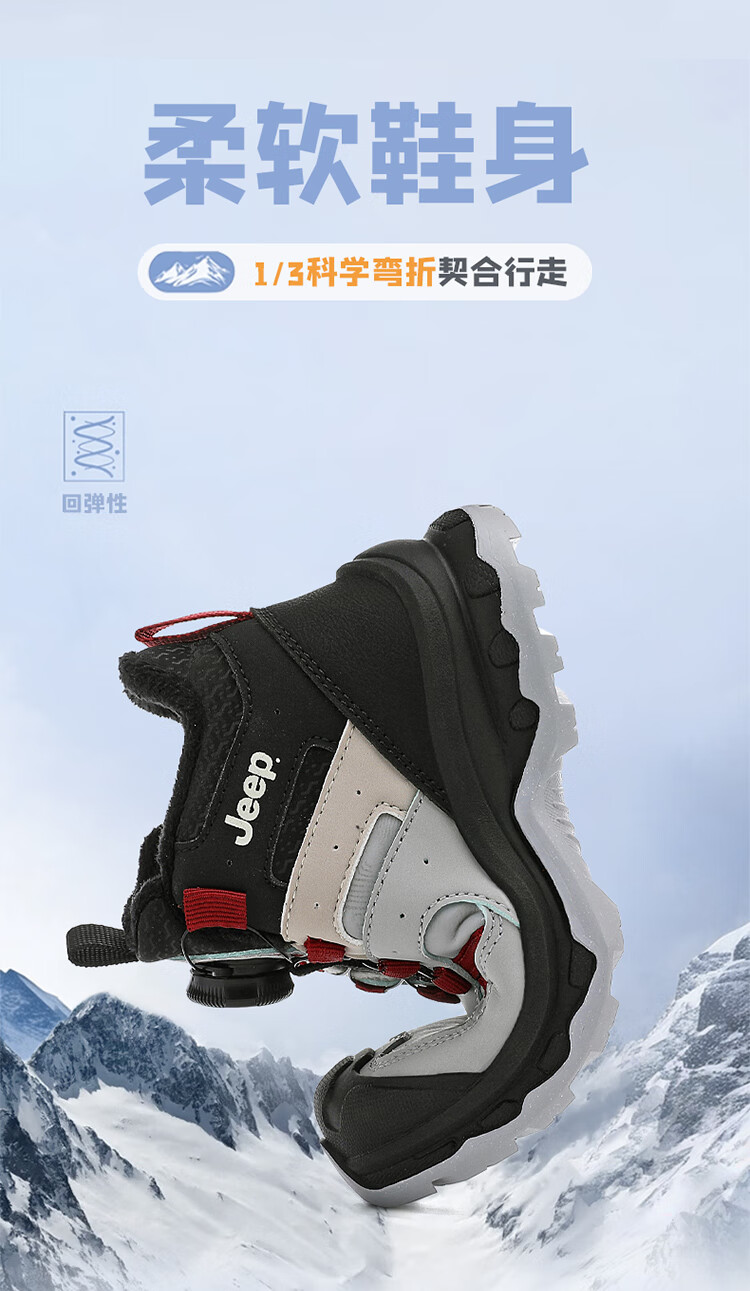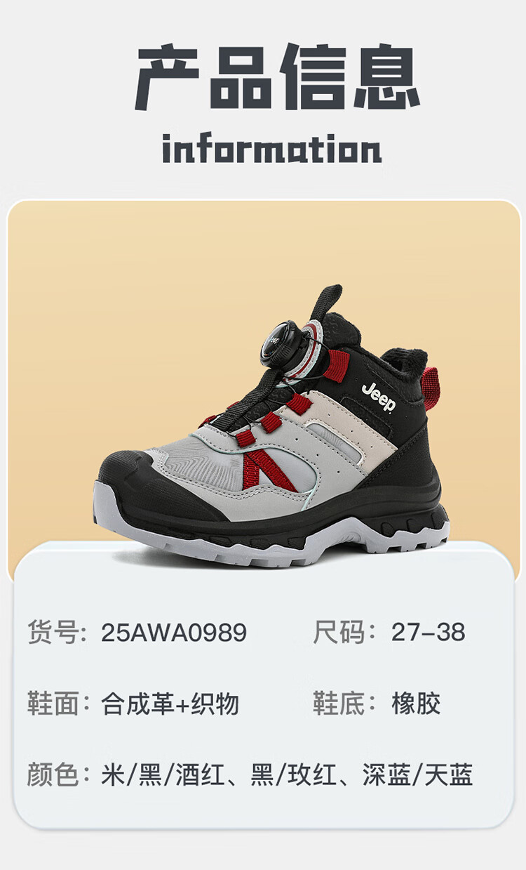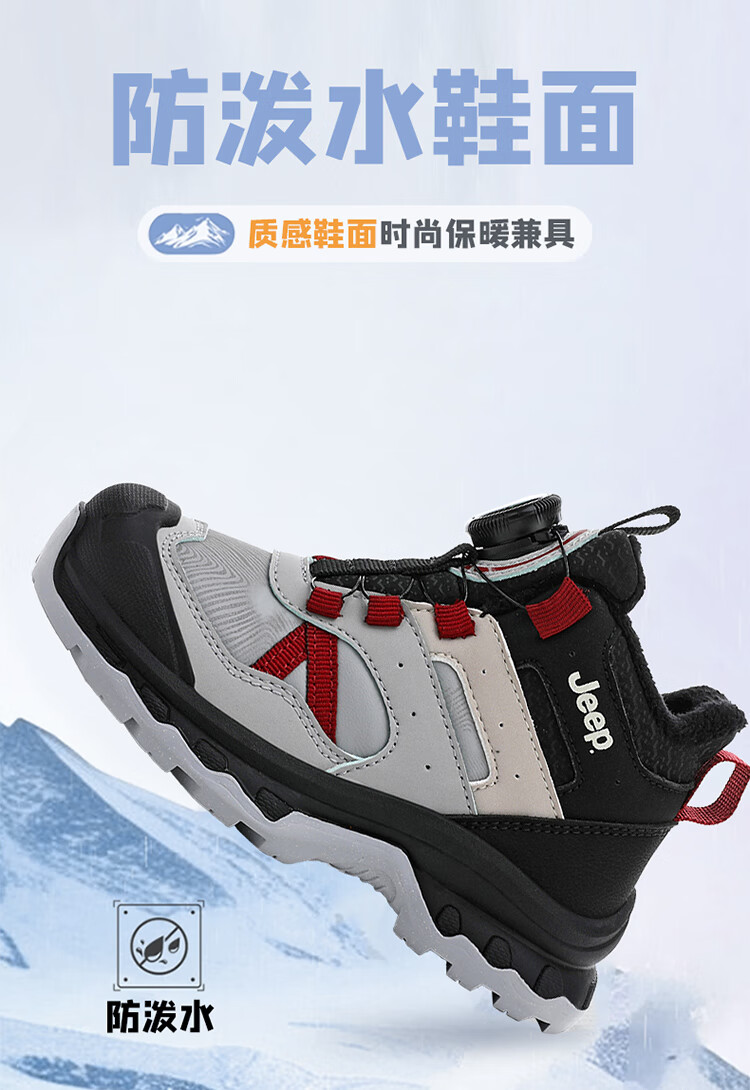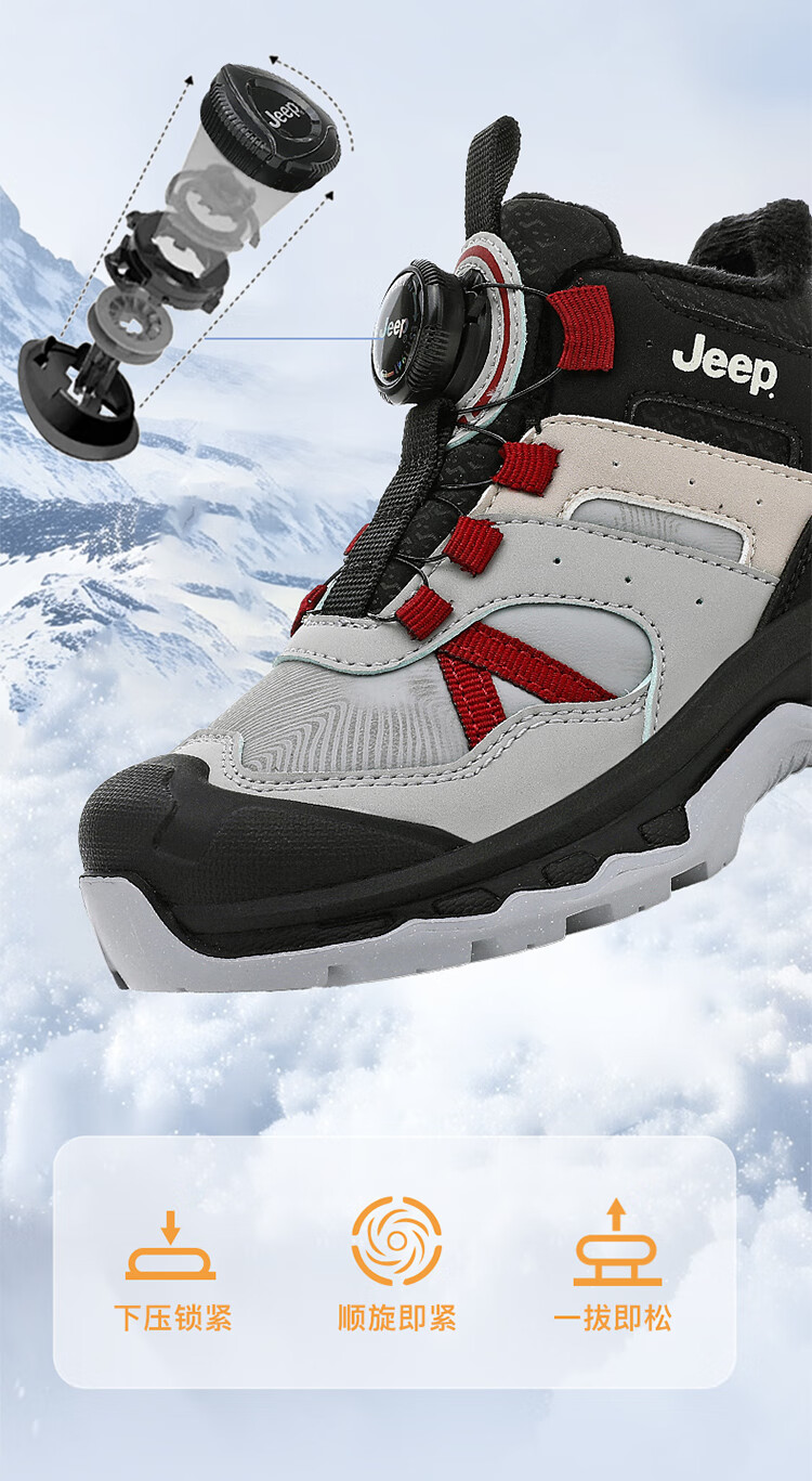 JEEP儿童加绒运动鞋男童女童登山鞋2025秋冬新款跑步鞋 米/黑/酒红 35