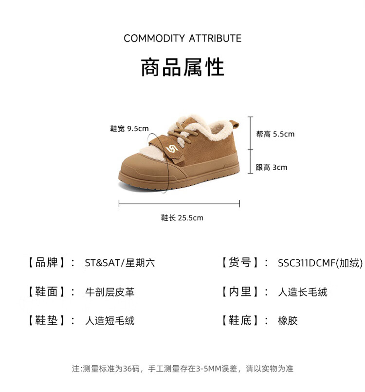 星期六(St&Sat)时尚休闲鞋女2025新款百搭潮流加绒保暖平底休闲鞋 驼色 37